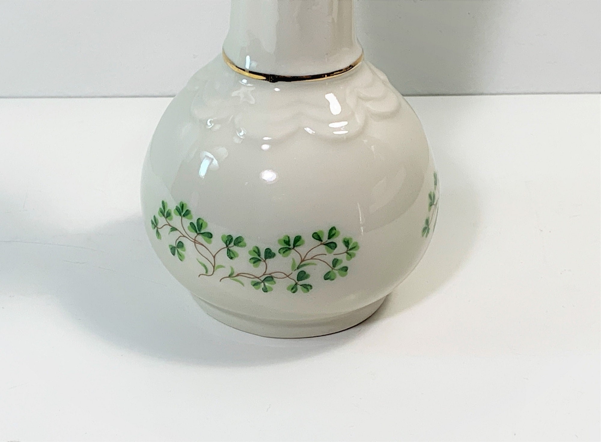 - EMBOSSED DESIGNS AND HAND PAINTED GREEN SHAMROCKS.