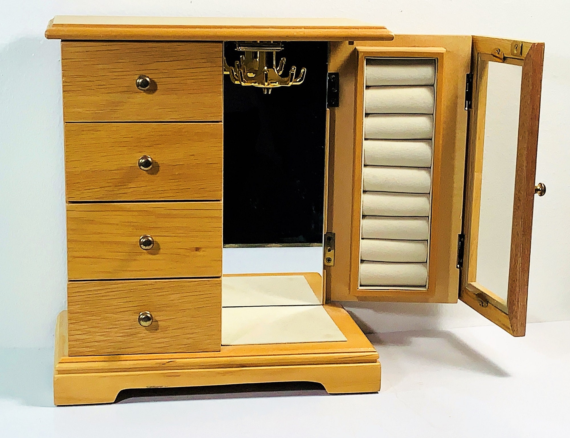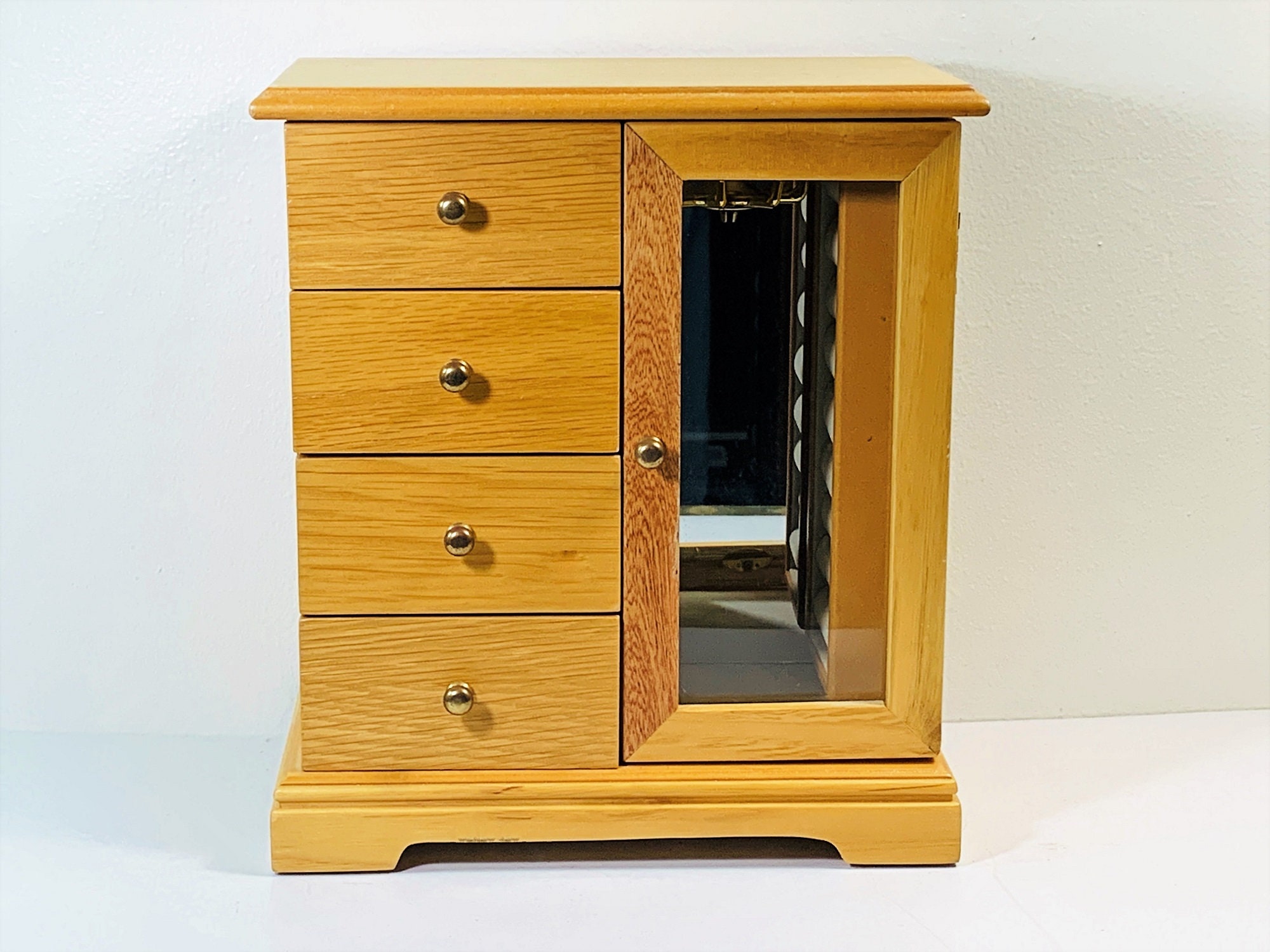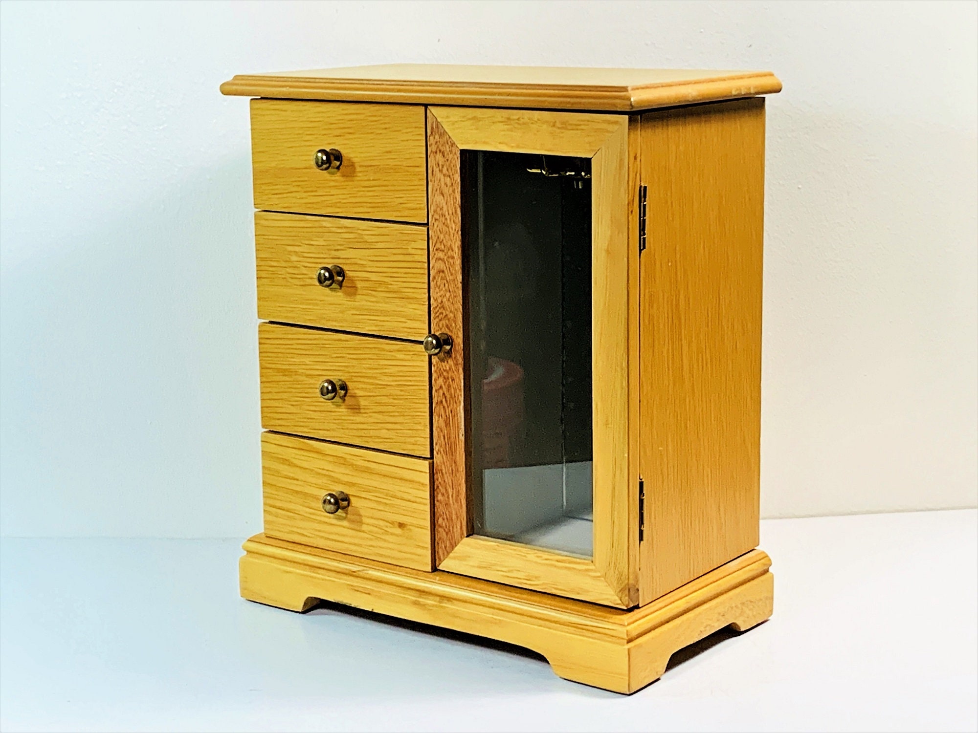 VINTAGE SOLID OAK JEWELRY ARMOIRE, GOLDEN OAK FINISH.