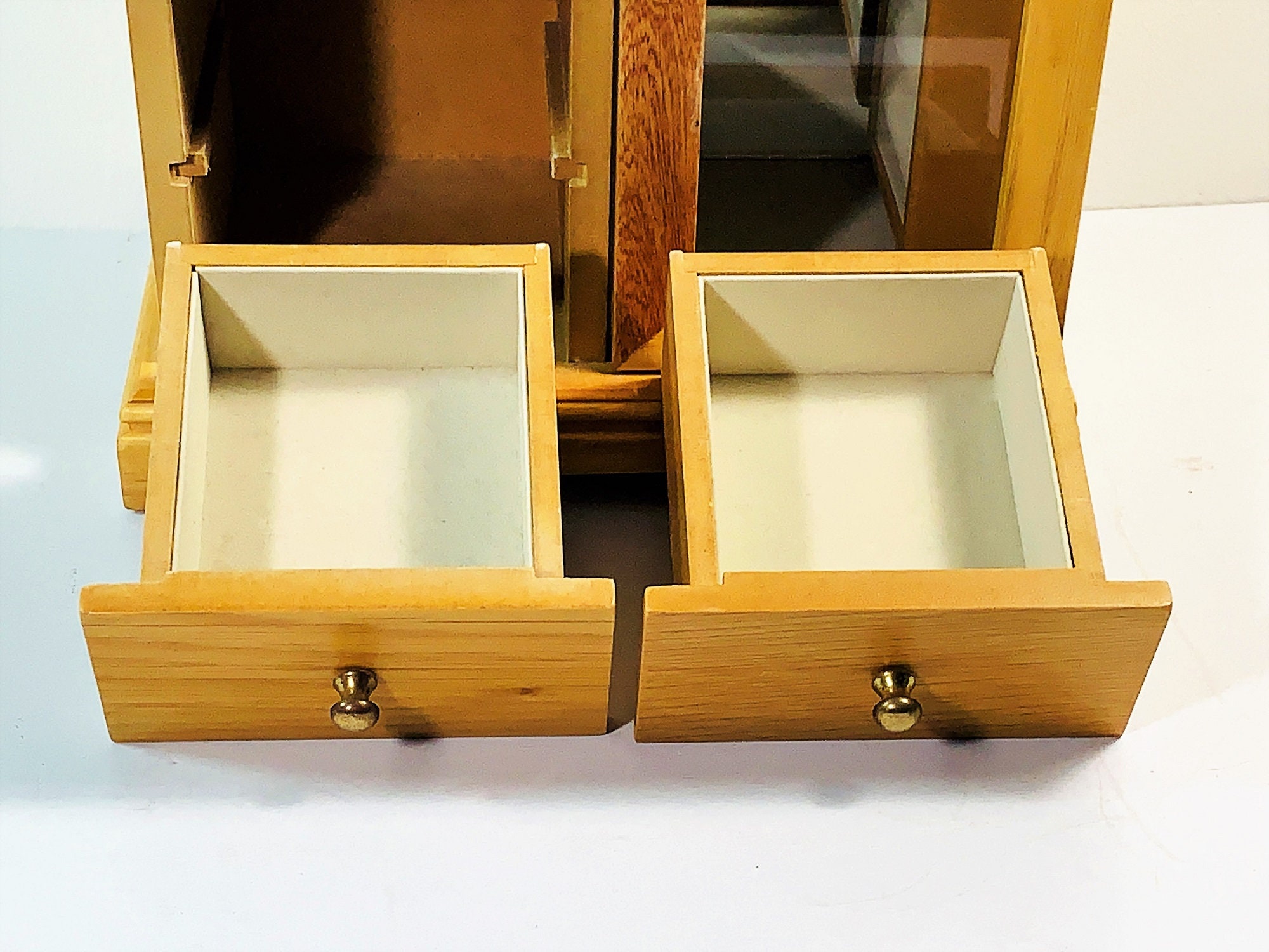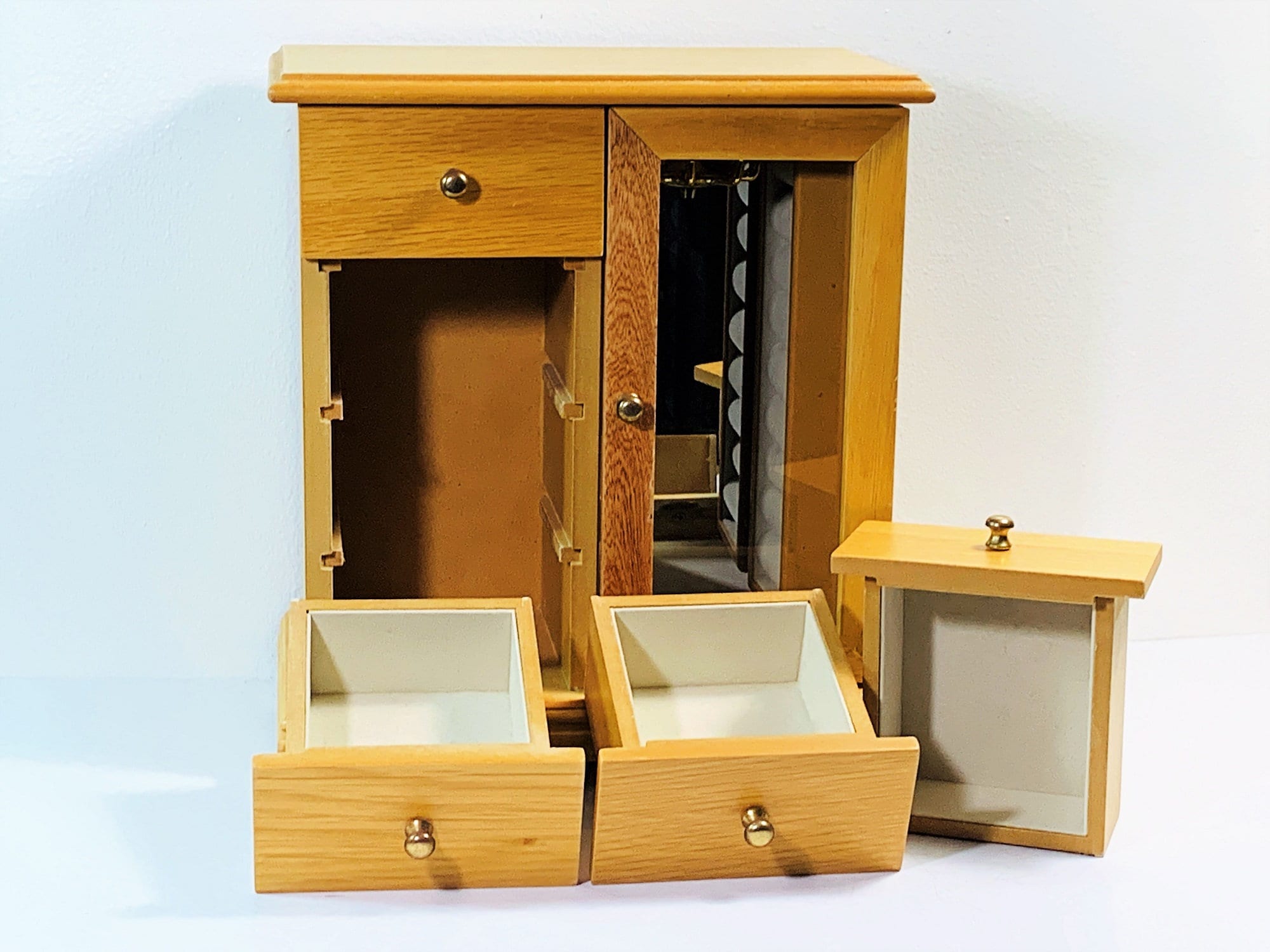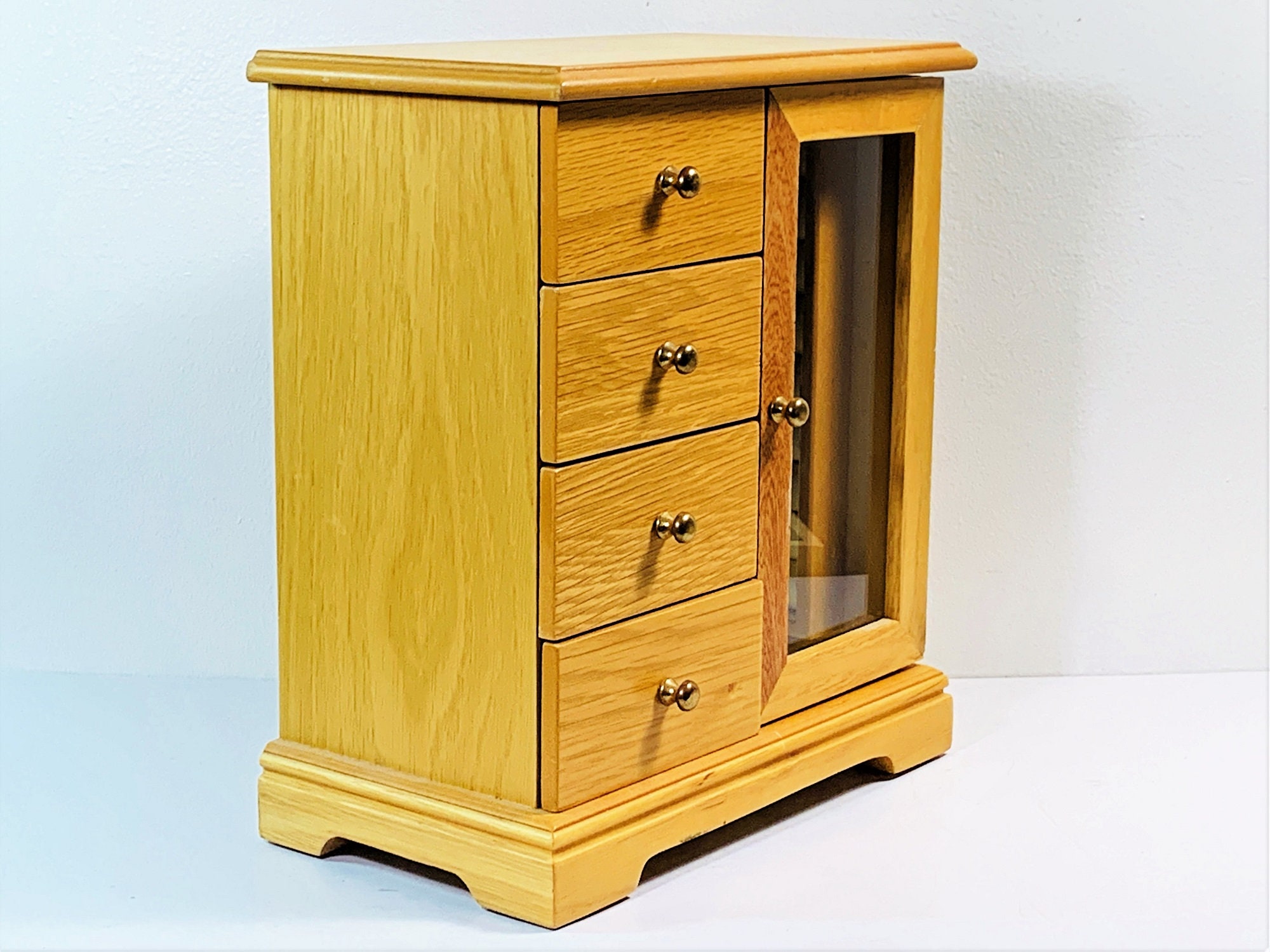 VINTAGE SOLID OAK JEWELRY ARMOIRE, GOLDEN OAK FINISH.