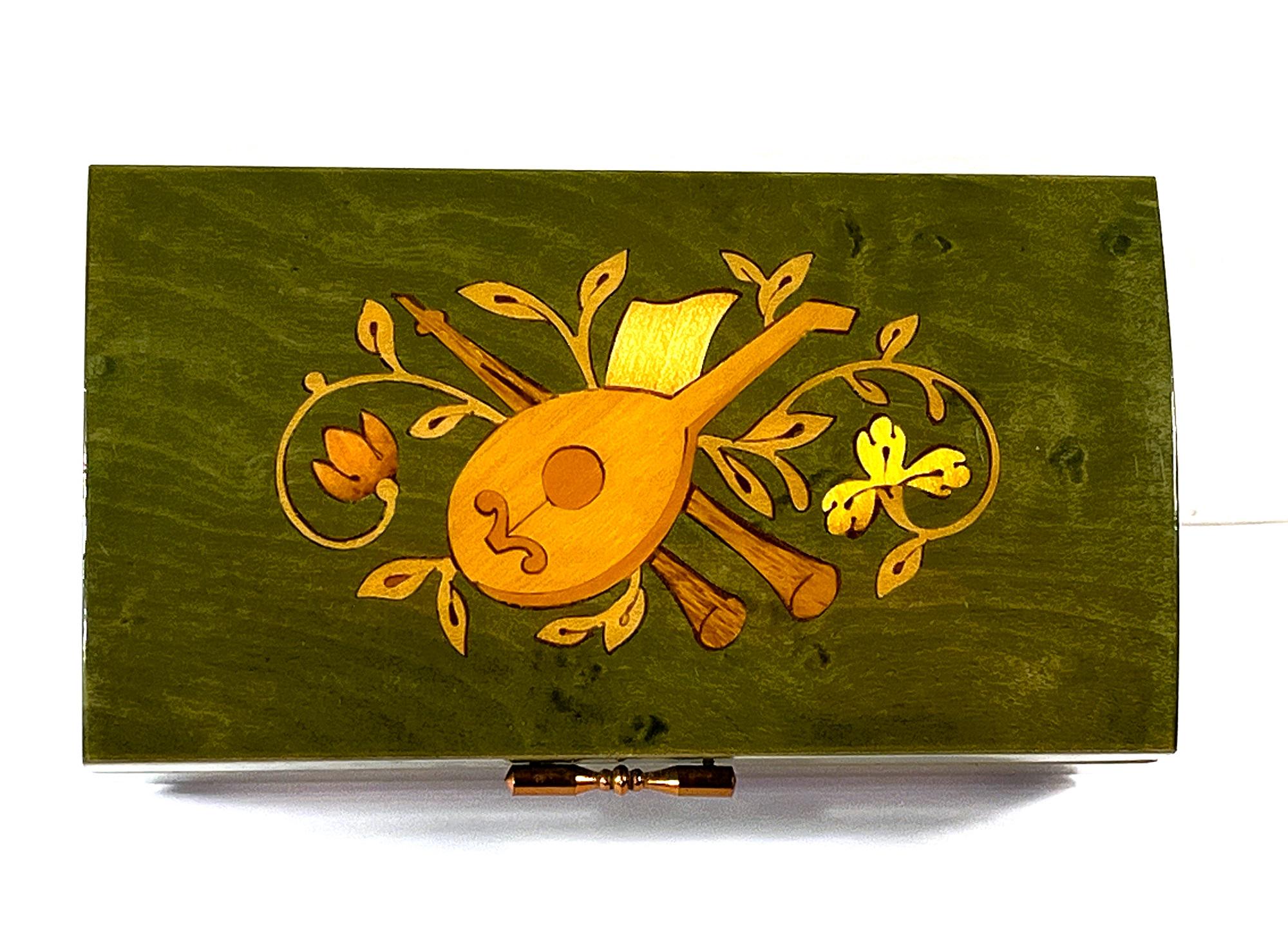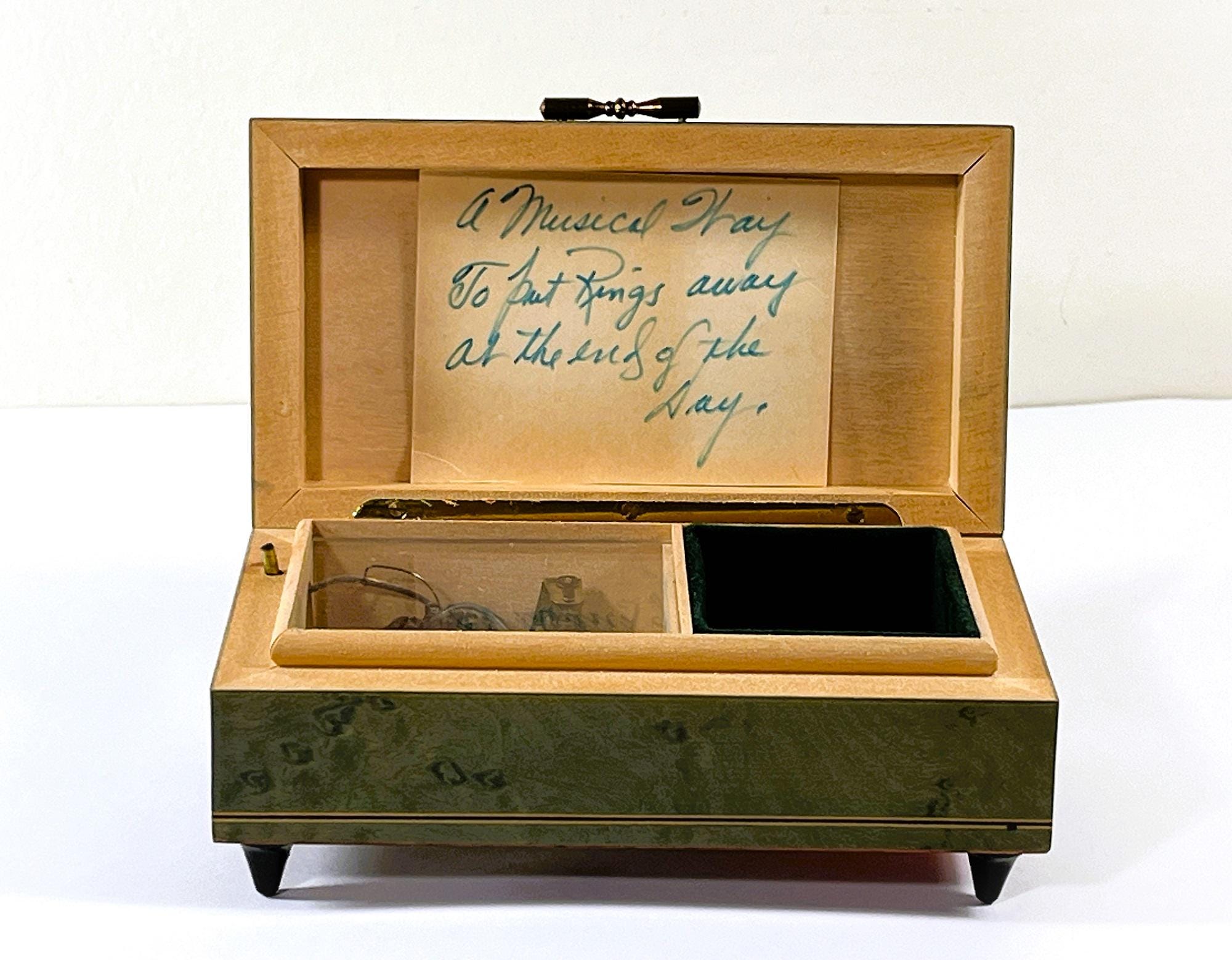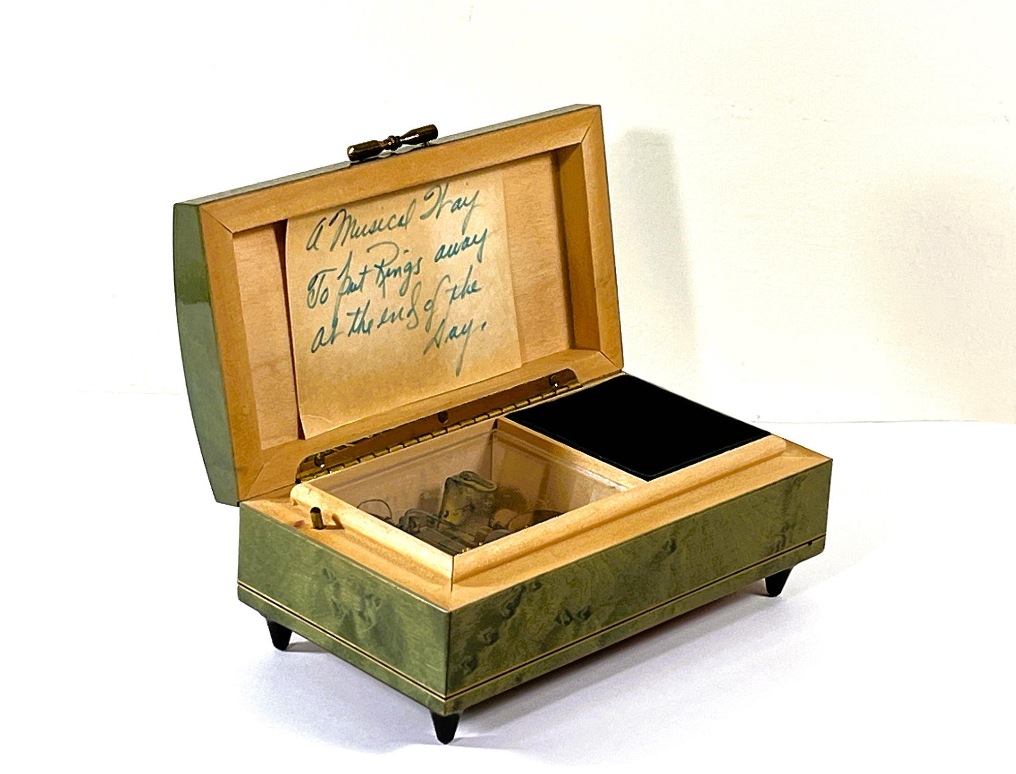 - CONDITION: TOP GRADE CONDITION, MUSIC MECHANISM WAS SERVICED (CLEANED & LUBRICATED), NO CRACKS OR DENTS. BRIGHT COLORS, GREAT SOUND. EXCELLENT FUNCTION, WELL PRESERVED PRE-OWNED. *THERE IS A HANDWRITTEN STICKY NOTE INSIDE THE LID (PICTURED), IT CAME WITH THE BOX WHEN IT WAS ACQUIRED.