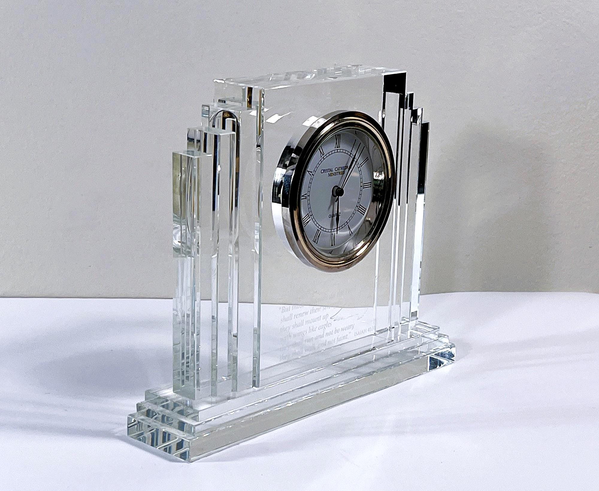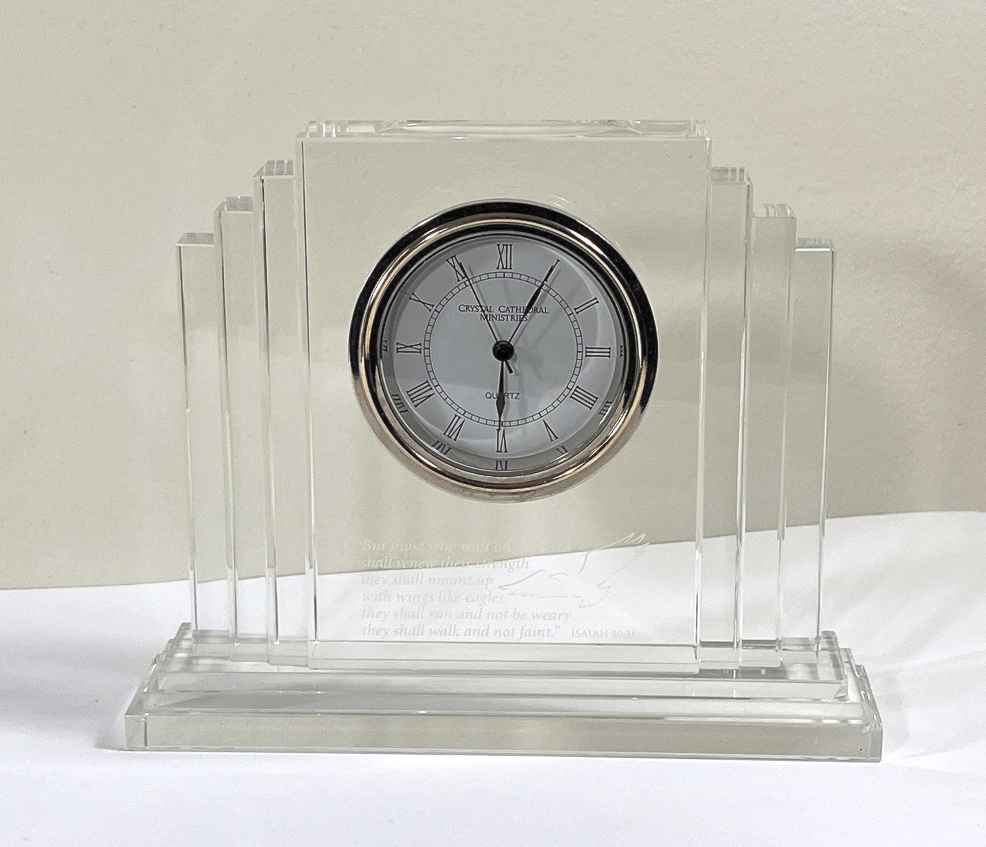 STUNNING CRYSTAL CATHEDRAL MINISTRIES MANTEL CLOCK.