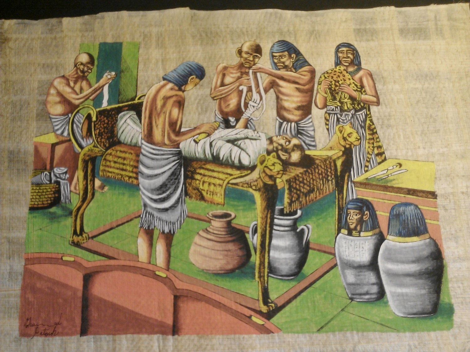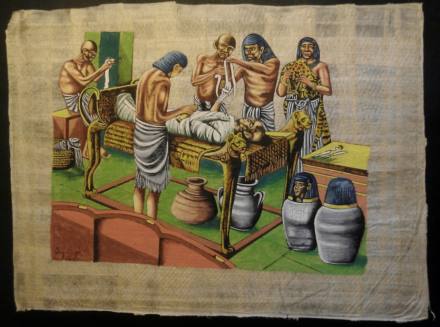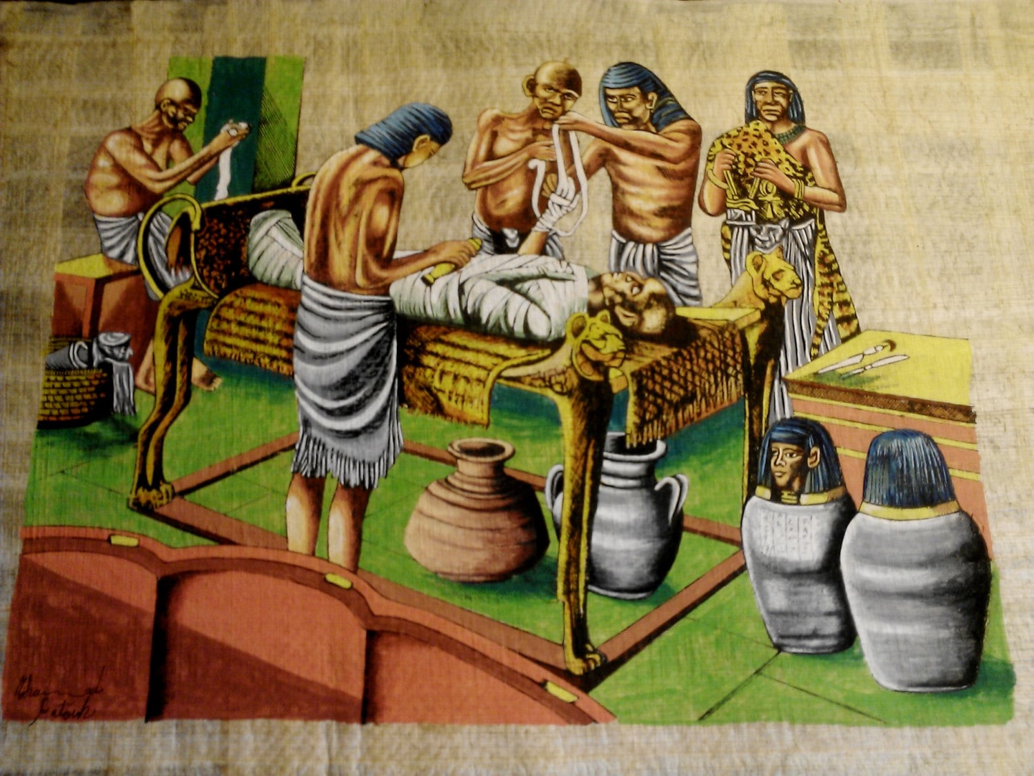 HIS OWN VISION OF THE MUMMIFICATION PROCESS IN ANCIENT EGYPT INFLUENCED BY SCENES FROM TEMPLES WALLS.