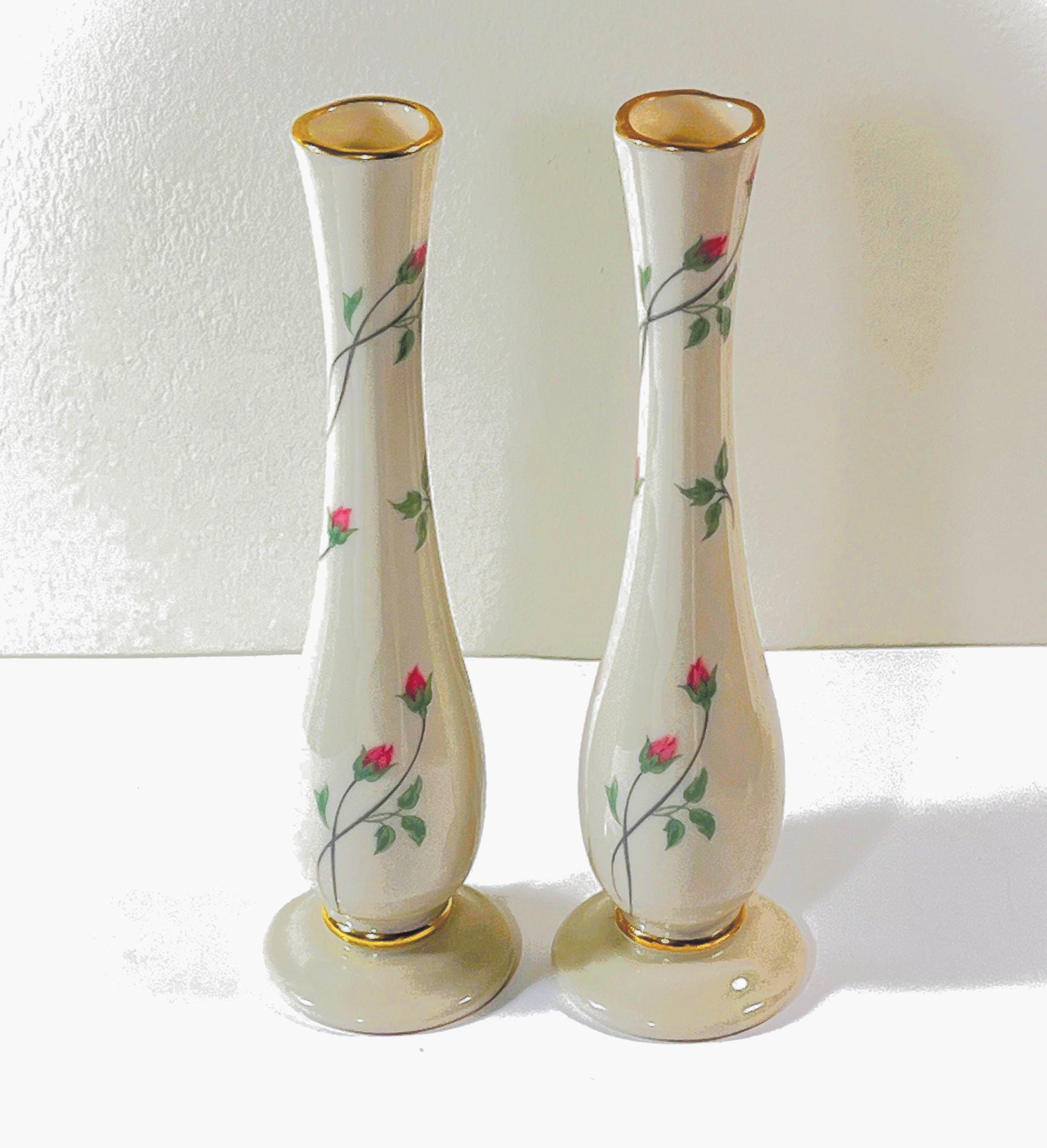 VINTAGE PAIR OF LENOX© ROSE MANOR BUD FINE BONE CHINA VASES.