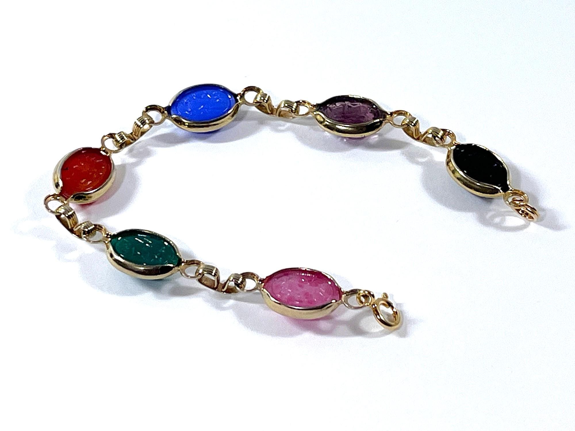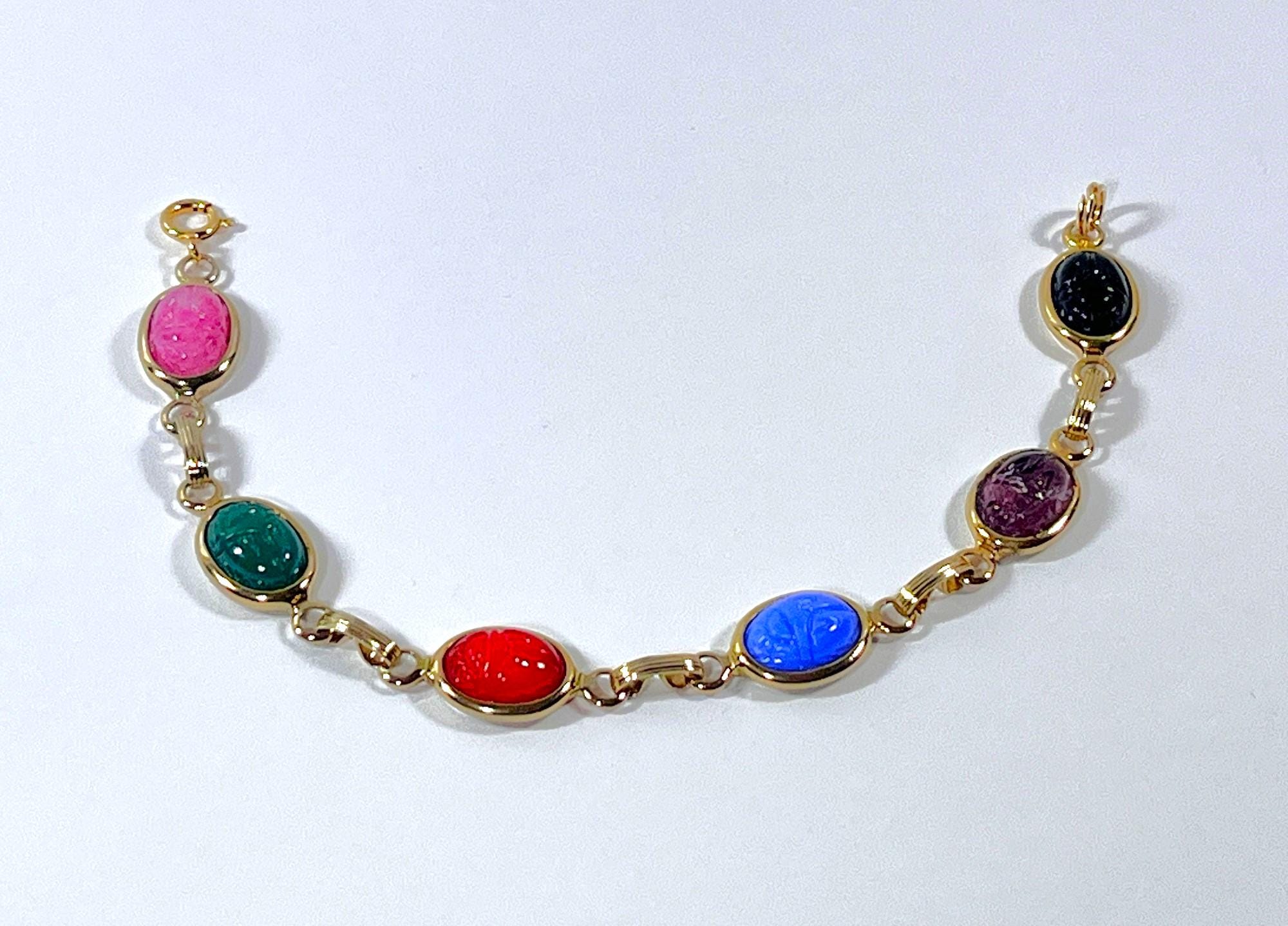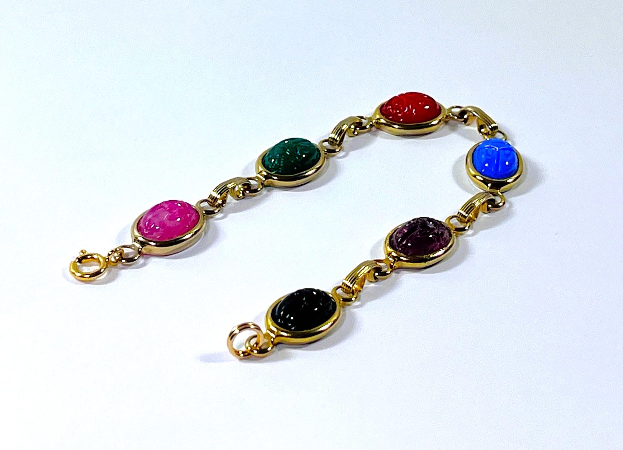 VINTAGE GOLD FILLED LUCITE SCARABS BRACELET.