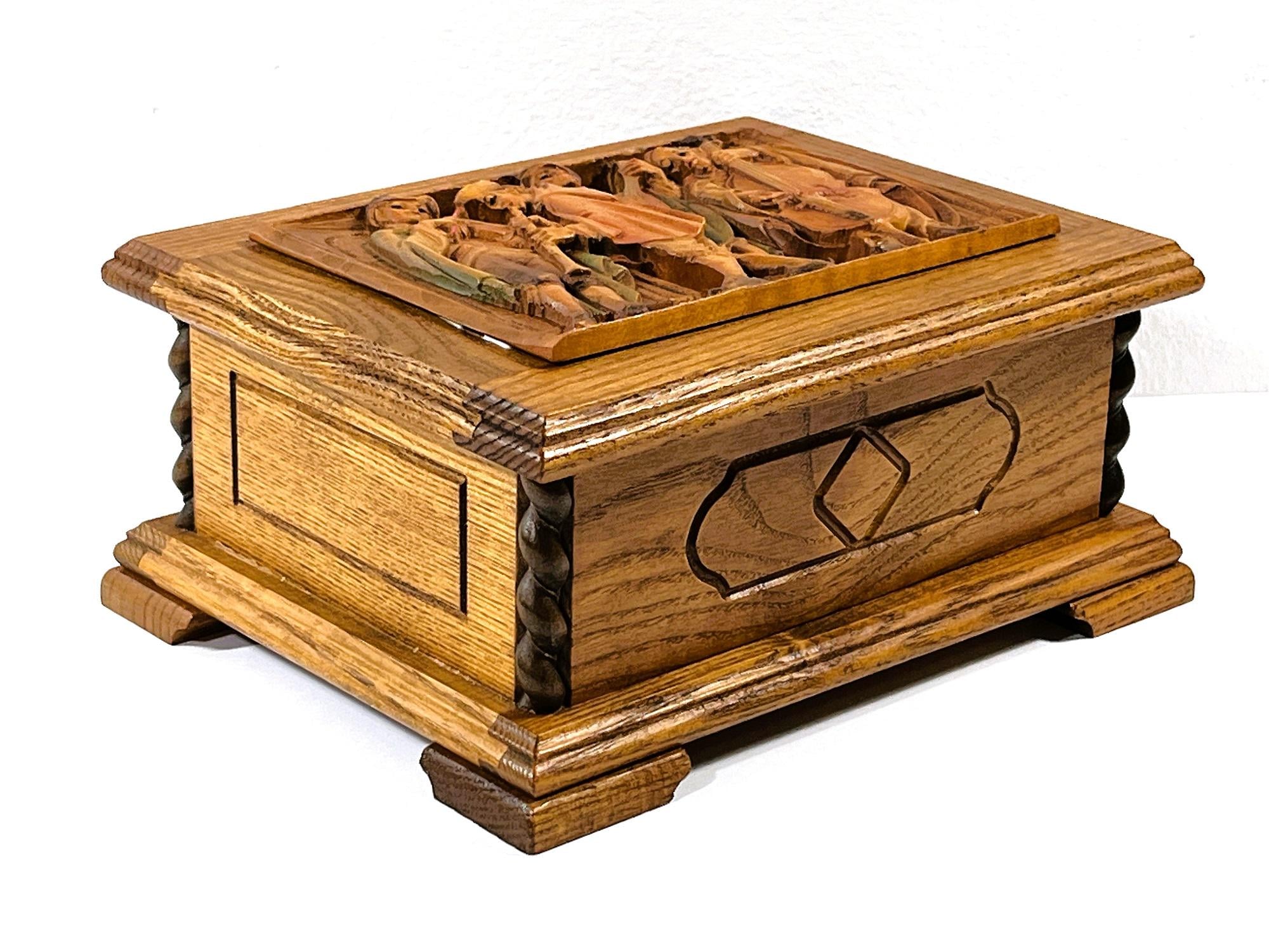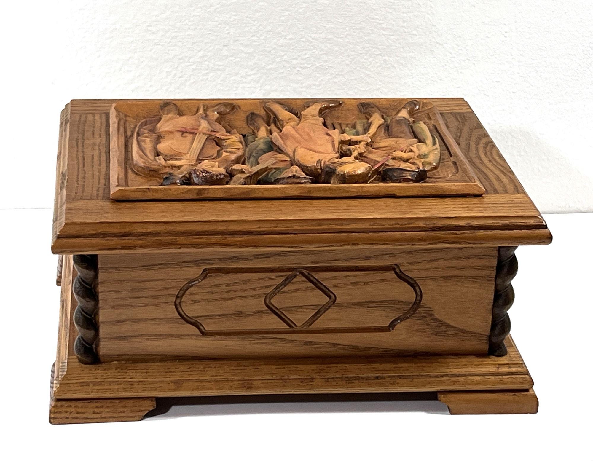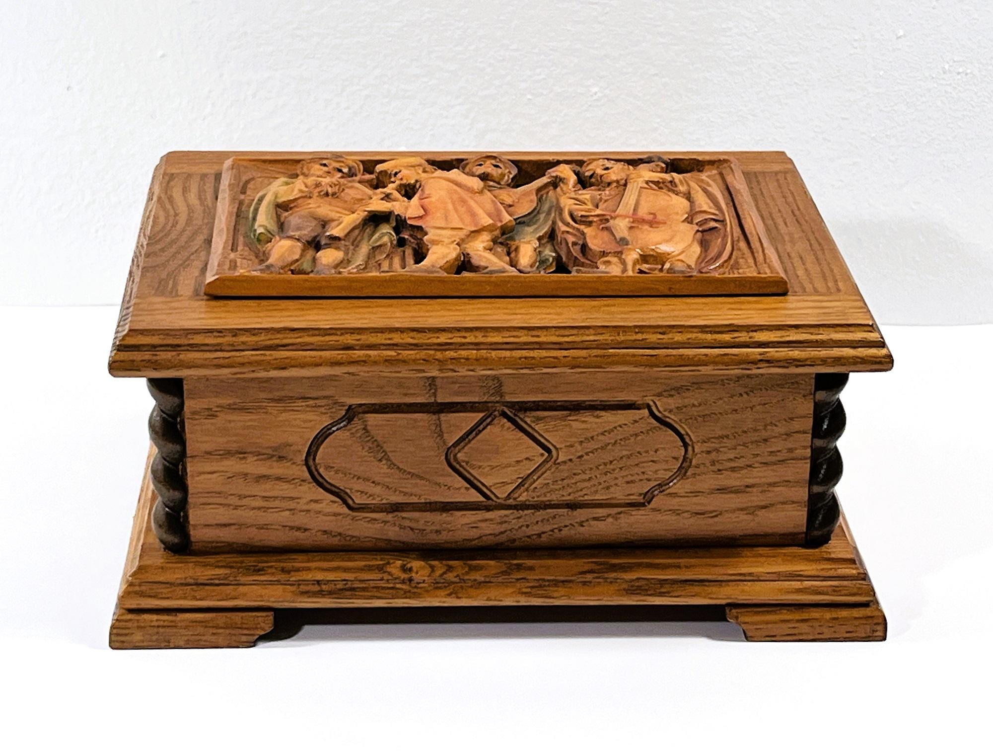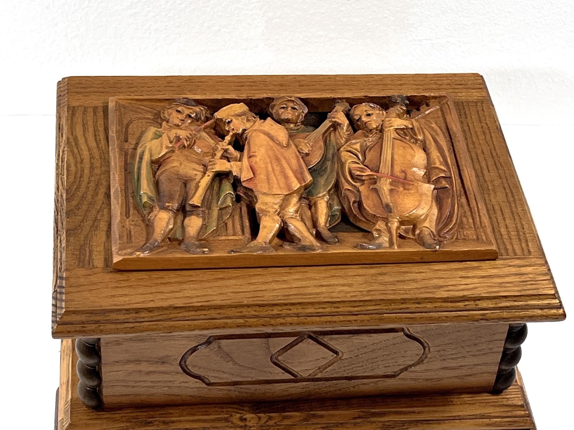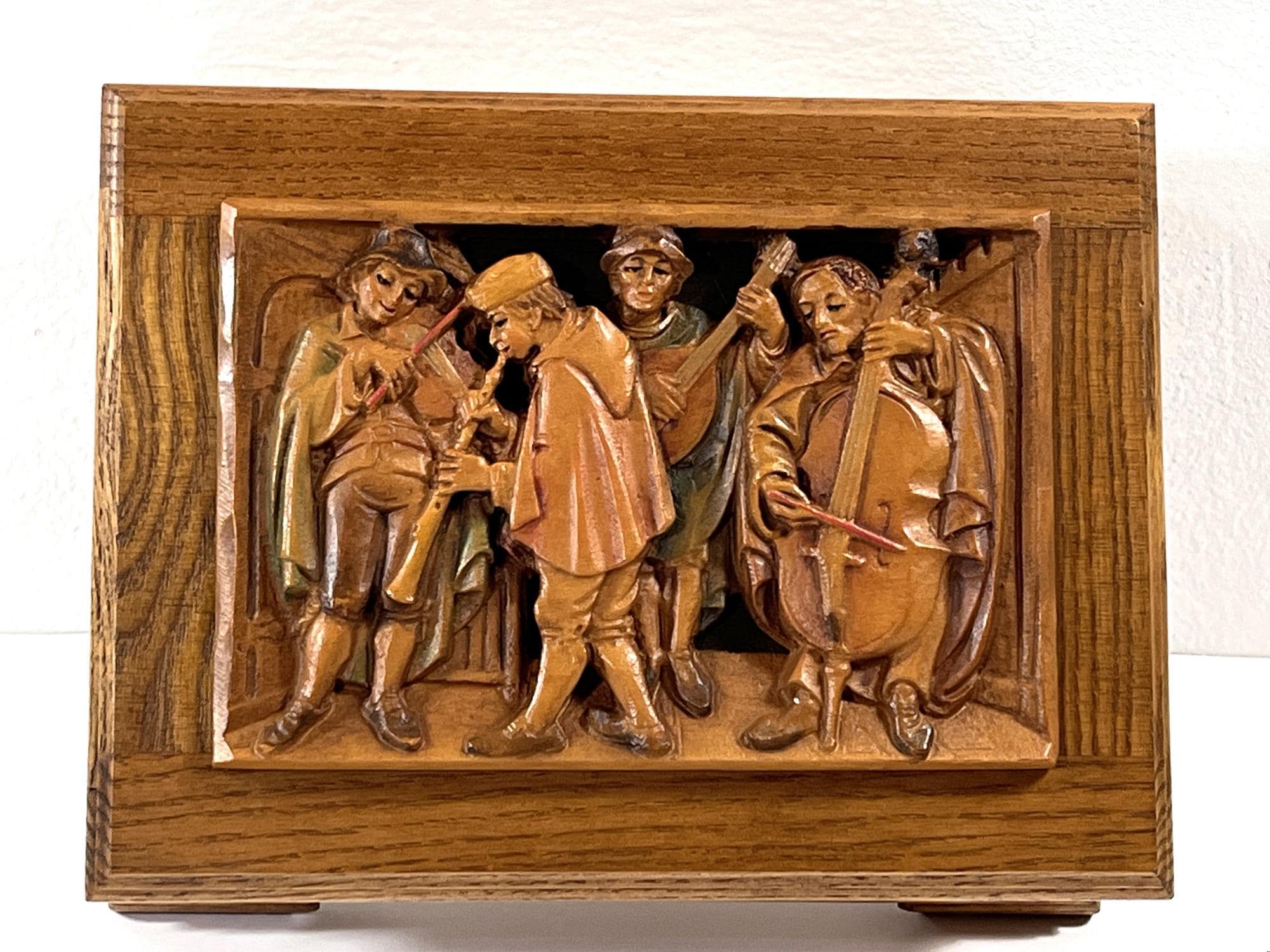 - CARVED FINE WOOD, CARVED 3 DIMENSIONS MUSICIANS BAND ON TOP (PICTURED). INCREDIBLE REALISTIC DETAILS, LIGHT TOUCH PAINT. HANDCRAFTED IN SWITZERLAND.