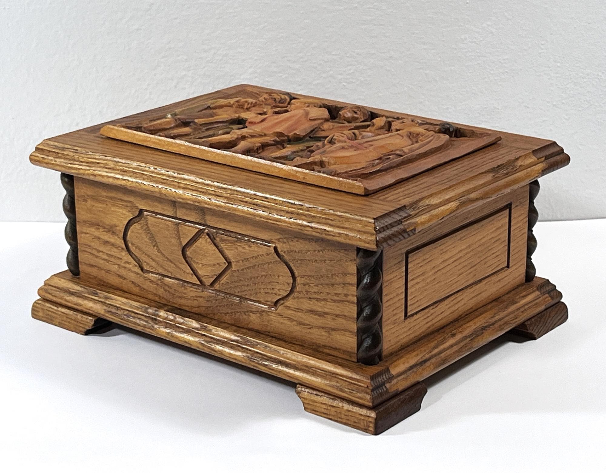 - CARVED PATTERNS ON ALL SIDES, CARVED SPIRAL (SOLOMONIC) COLUMNS ON ALL FOUR CORNERS.