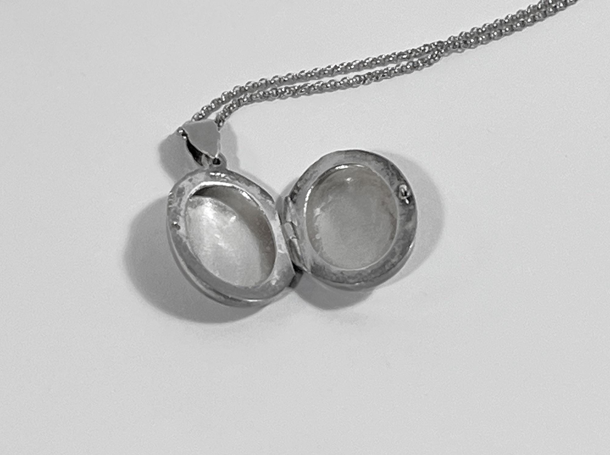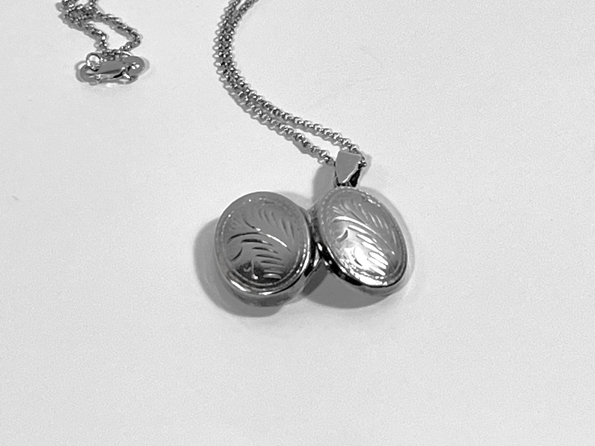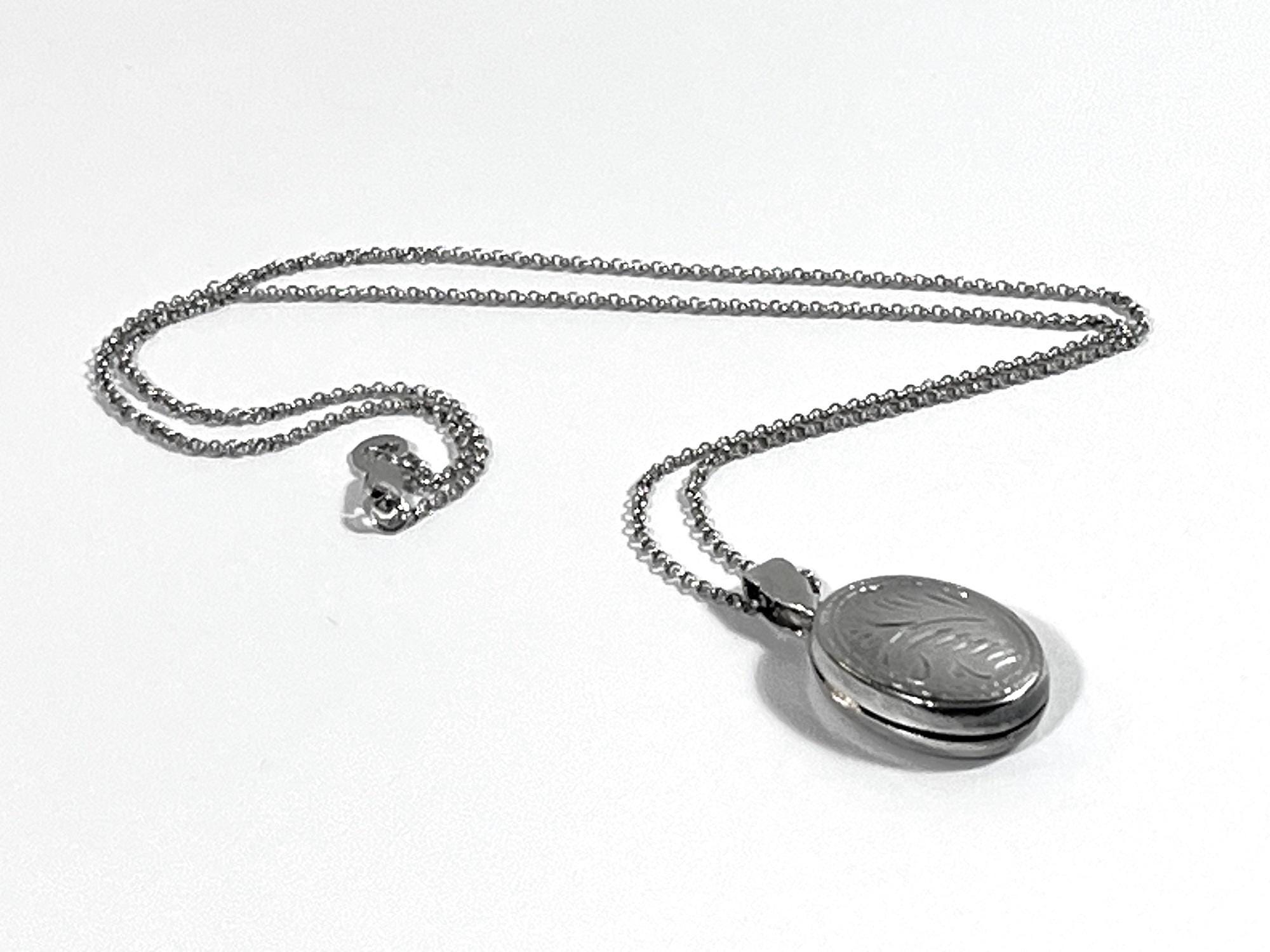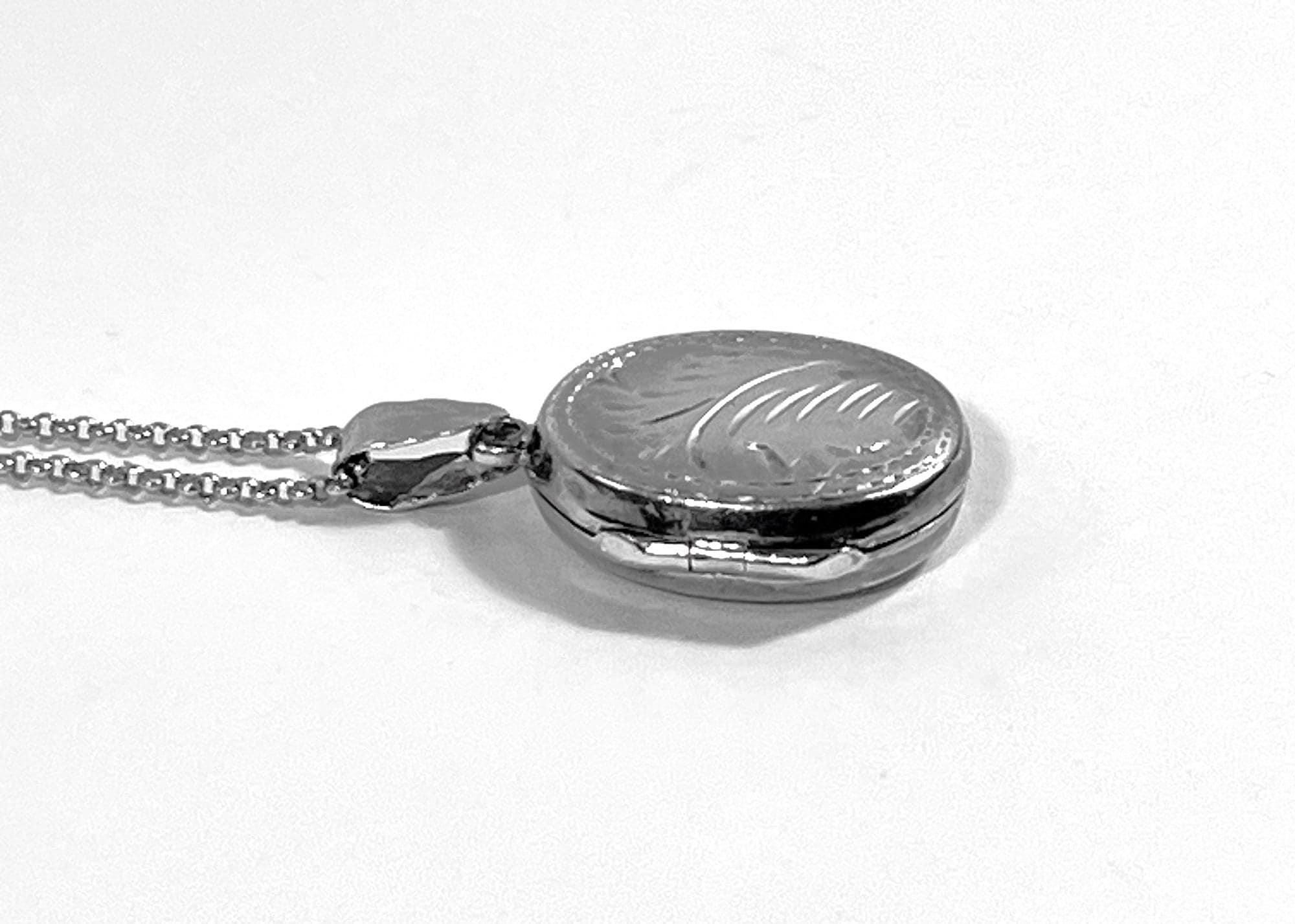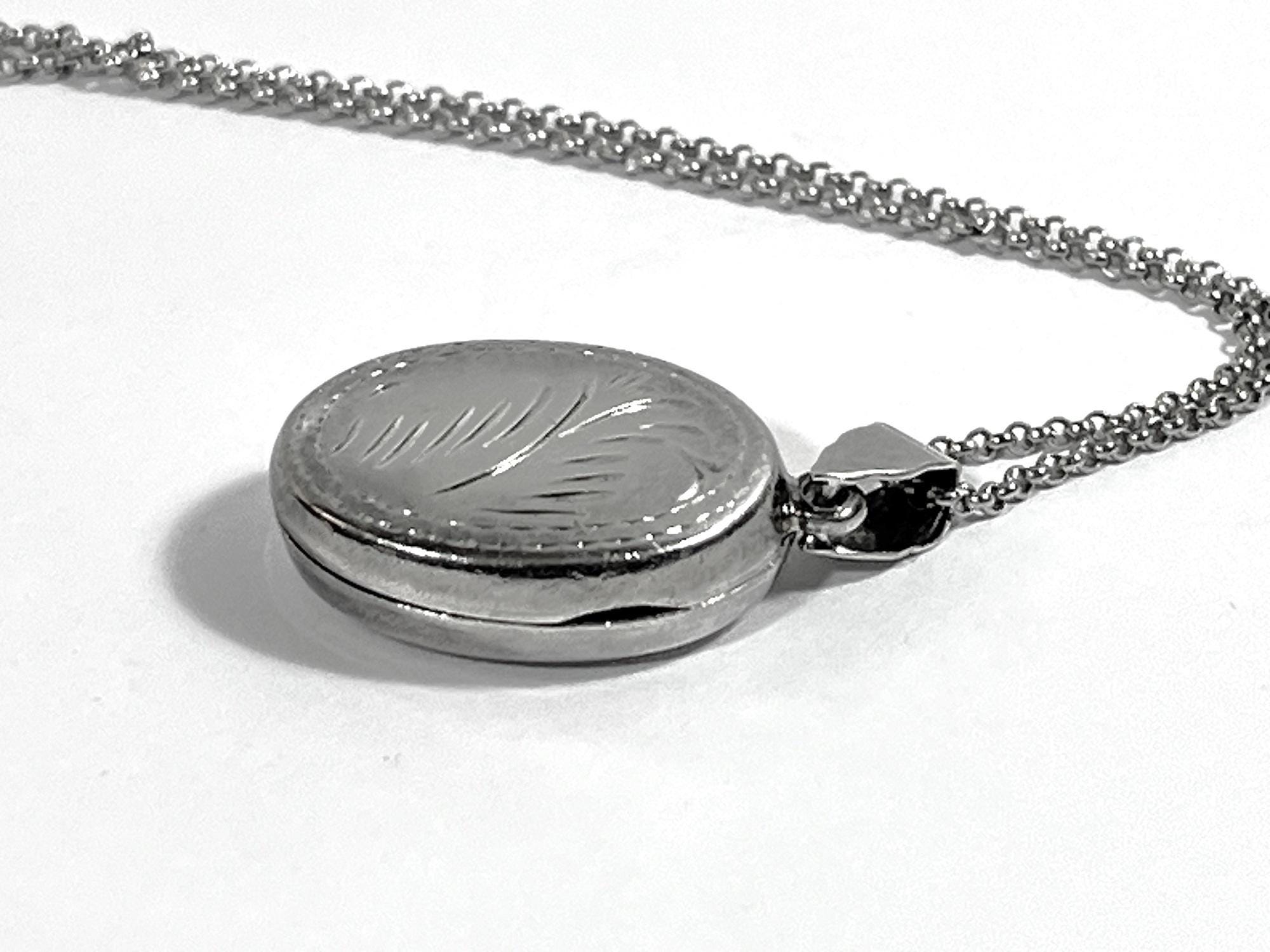 VINTAGE STERLING SILVER OVAL SHAPE ETCHED LOCKET NECKLACE.