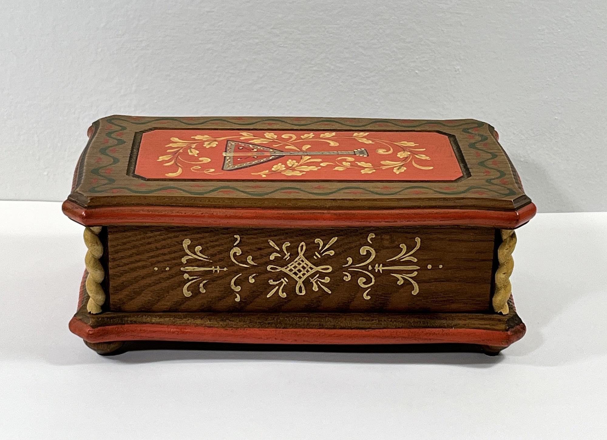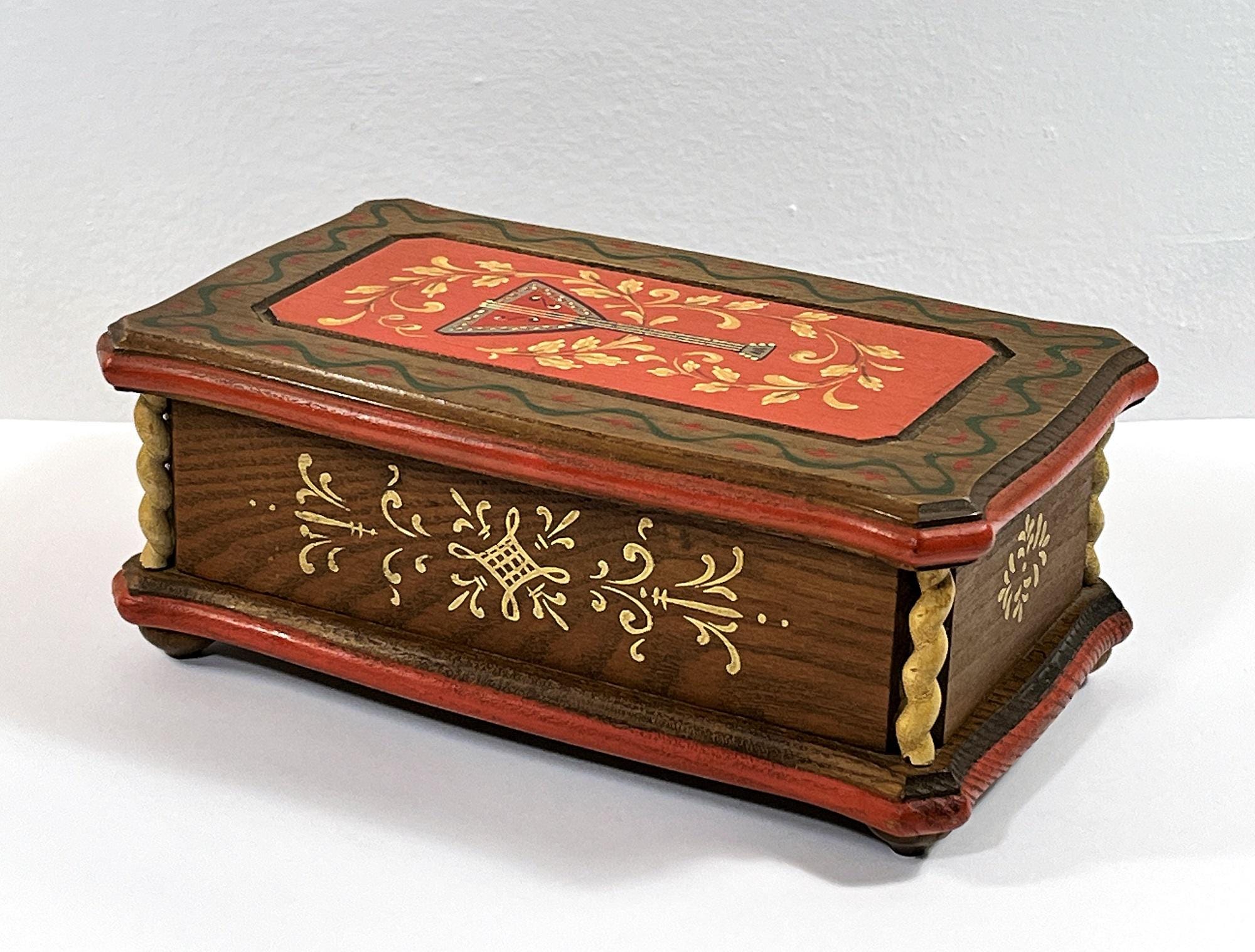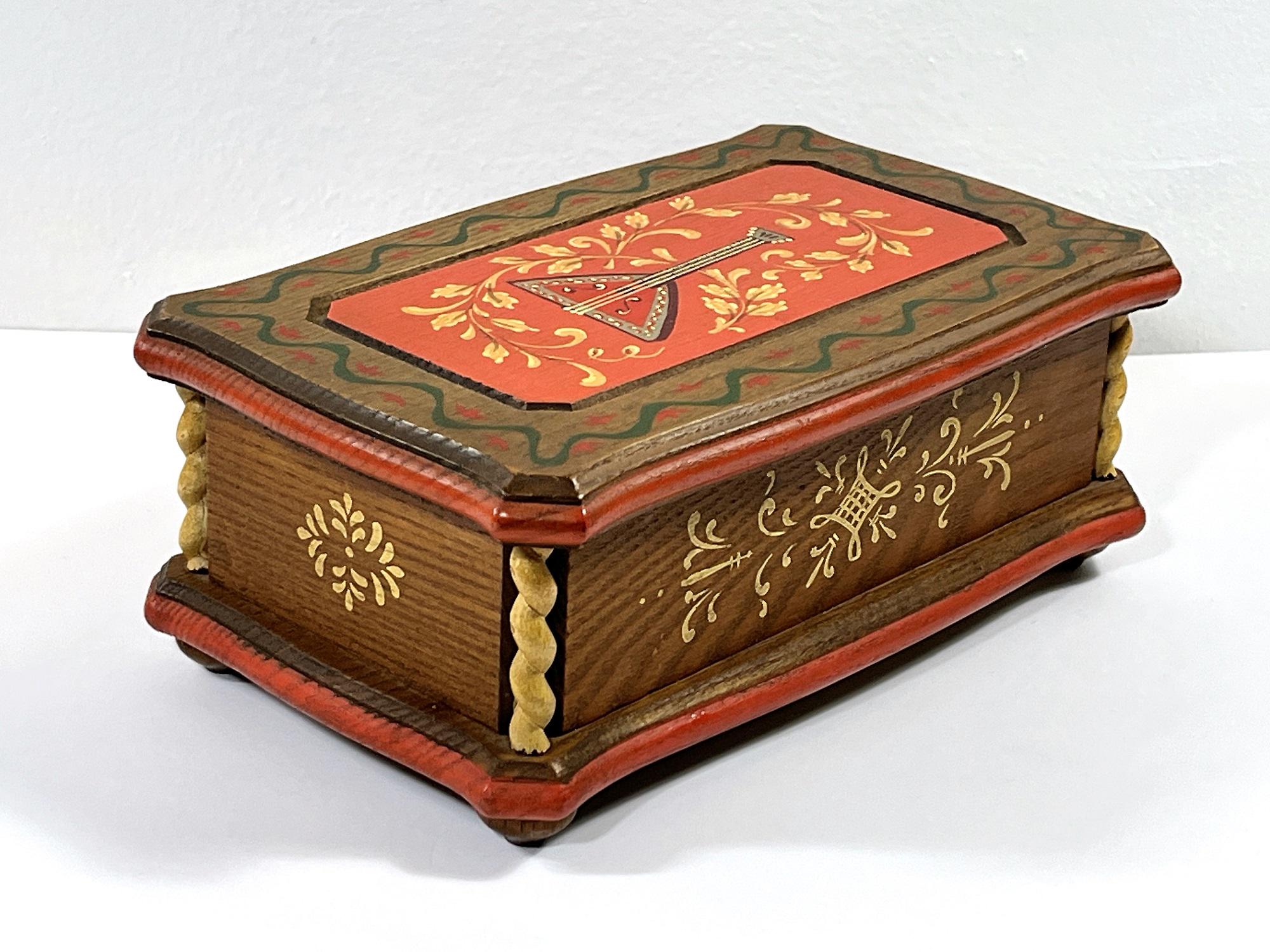 - HAND PAINTED PATTERNS ON TOP, ANTIQUE MUSIC INSTRUMENT SURROUNDED BY LEAVES,