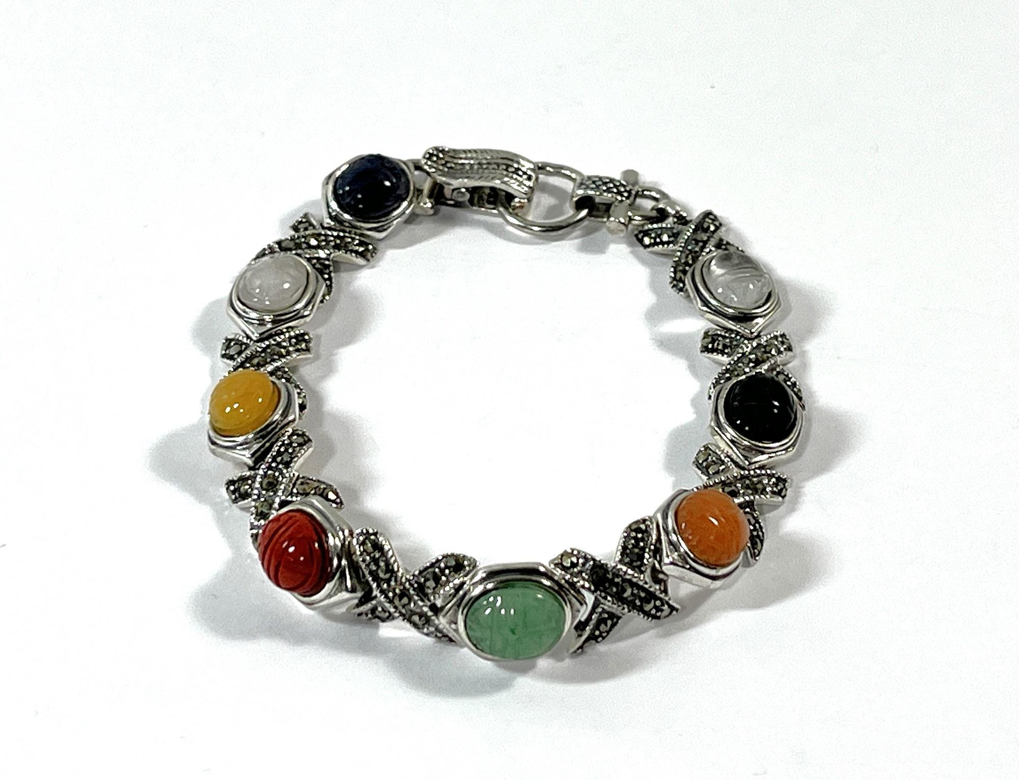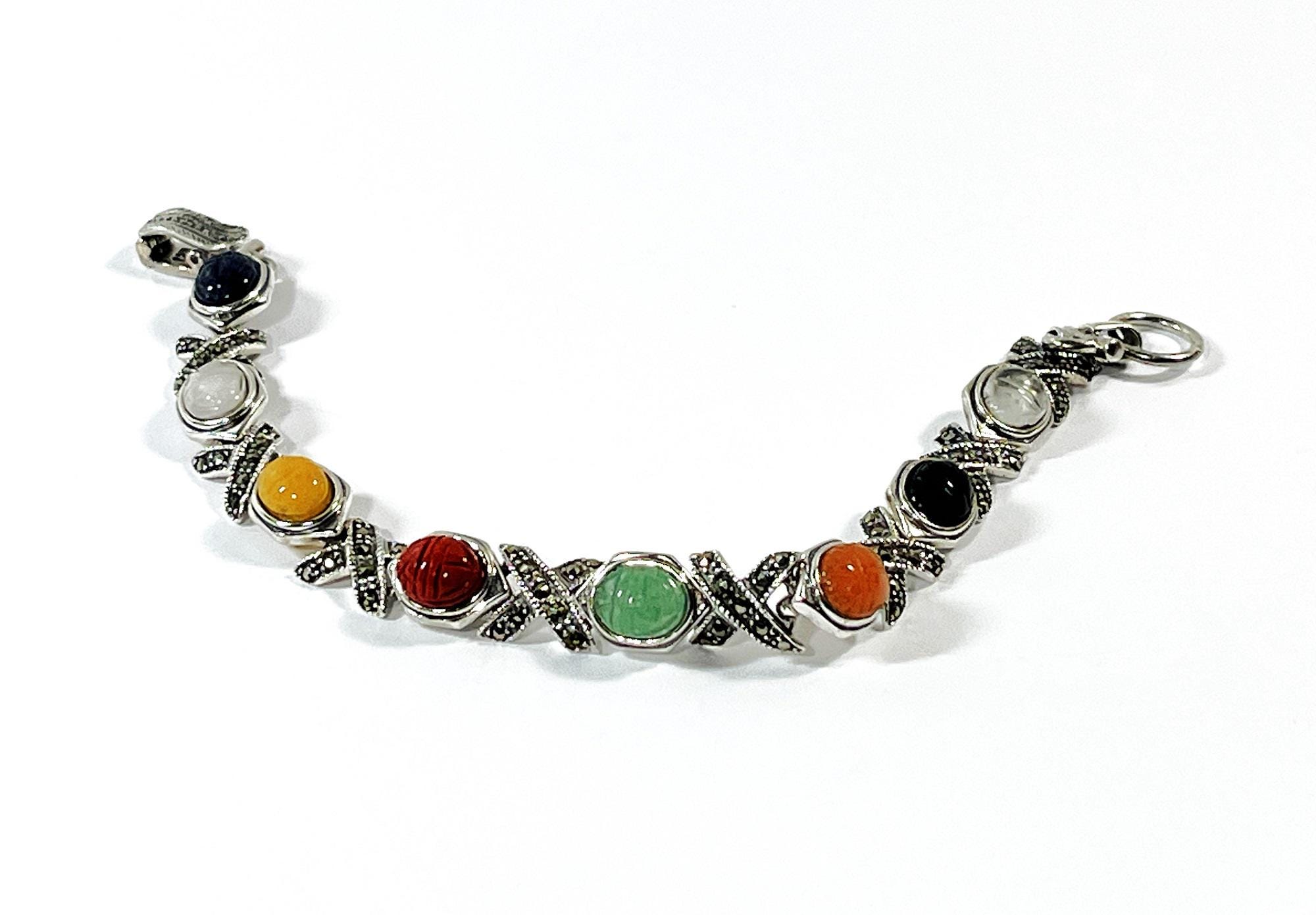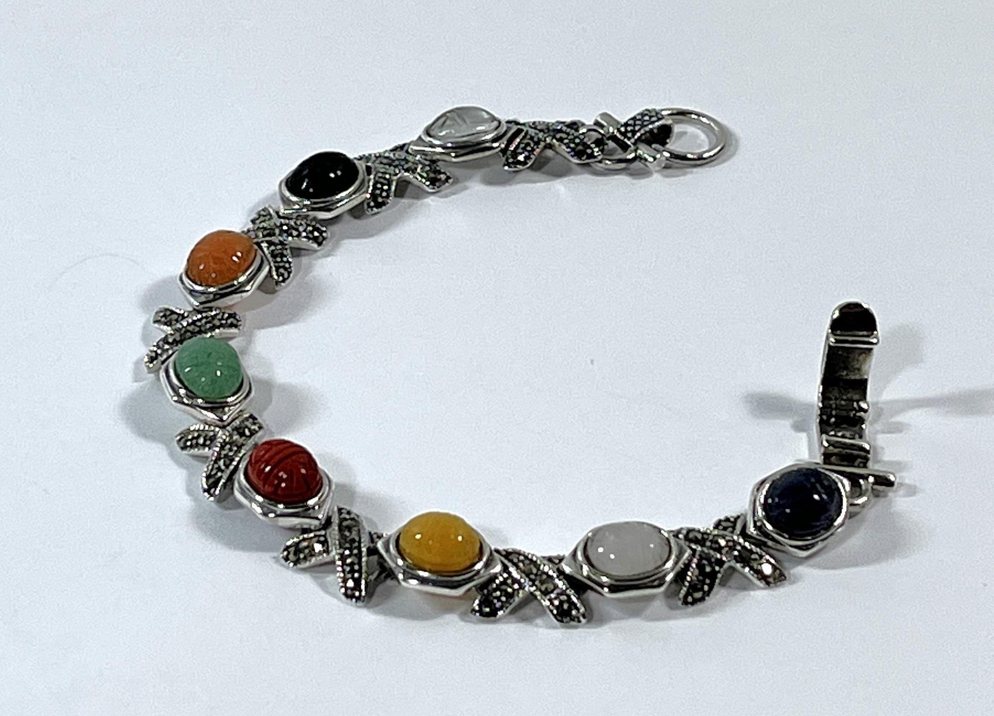 VINTAGE STERLING SILVER, MARCASITE & GEMSTONE SCARABS BRACELET. CIRCA 1980's