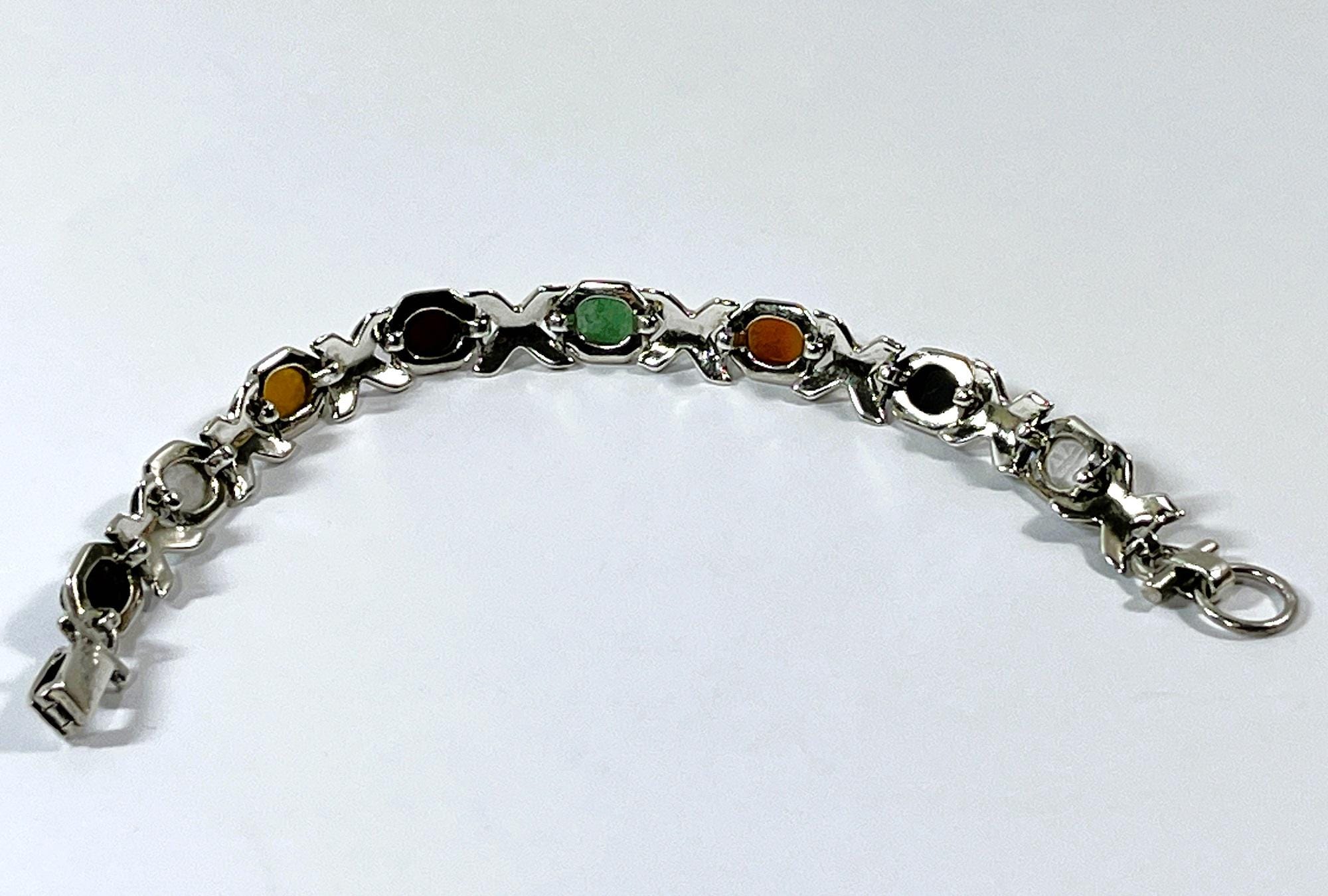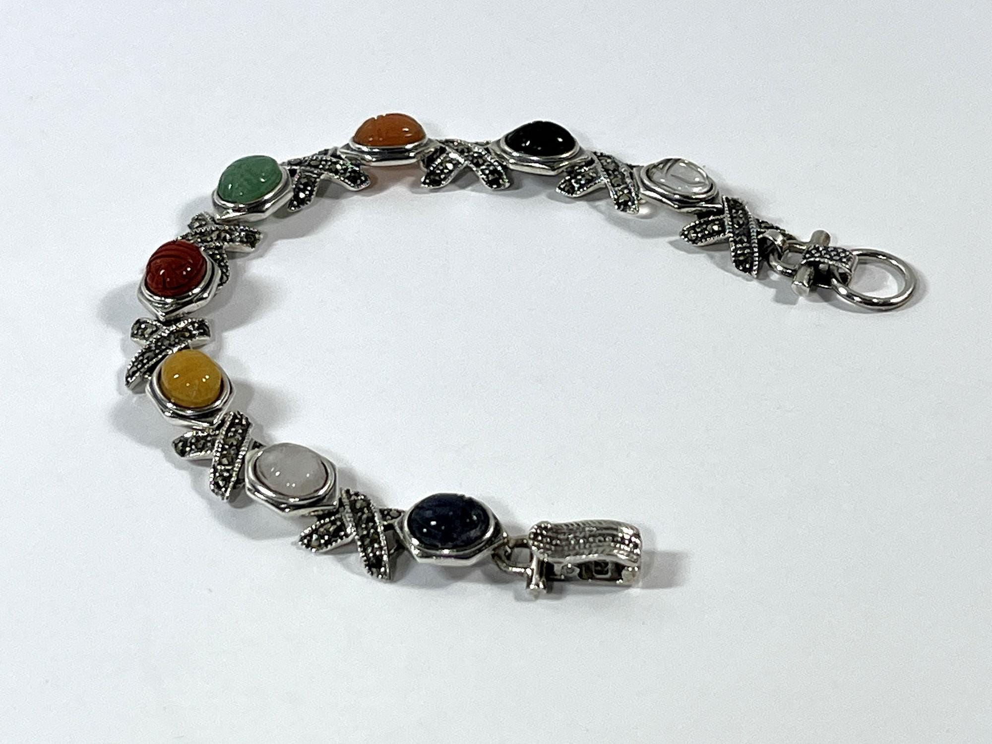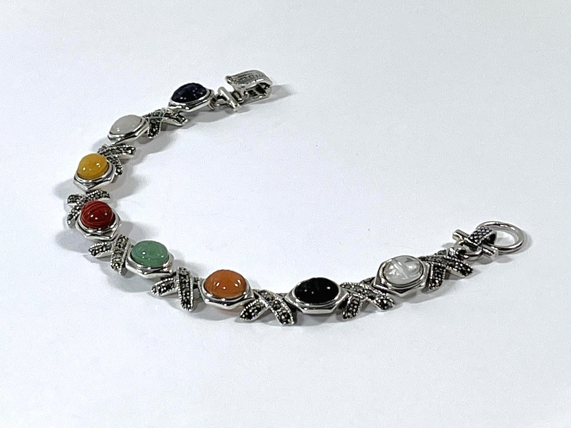 VINTAGE STERLING SILVER, MARCASITE & GEMSTONE SCARABS BRACELET. CIRCA 1980's