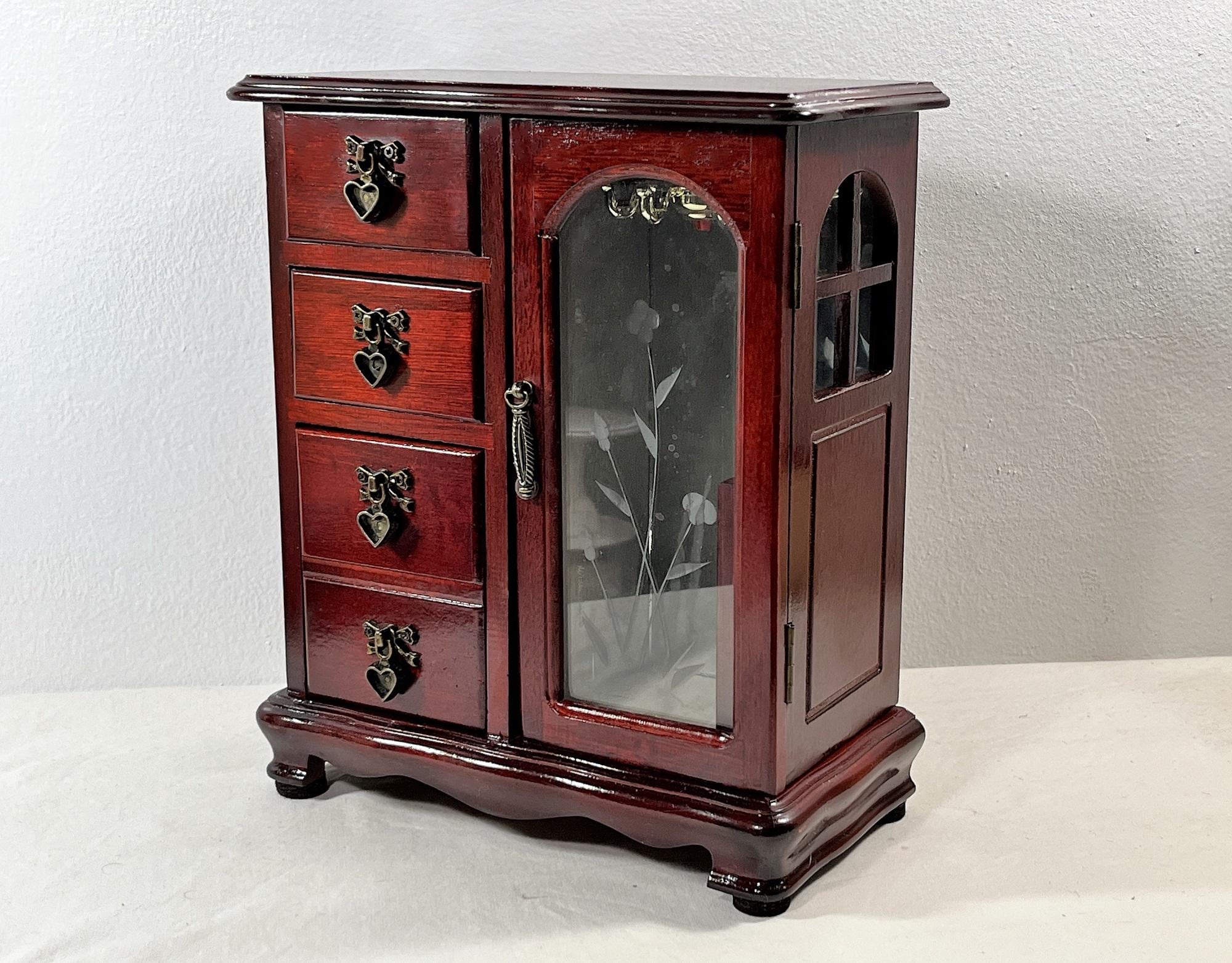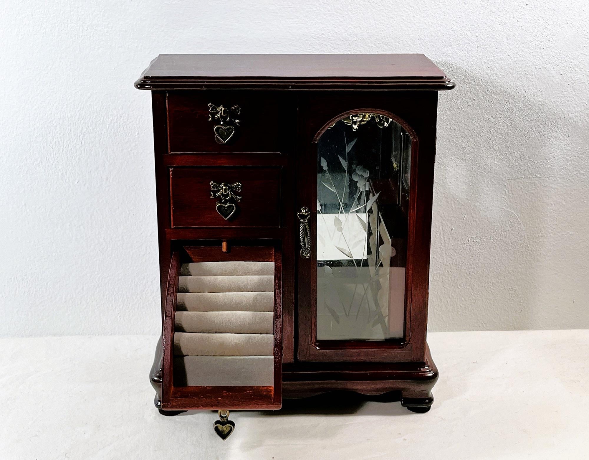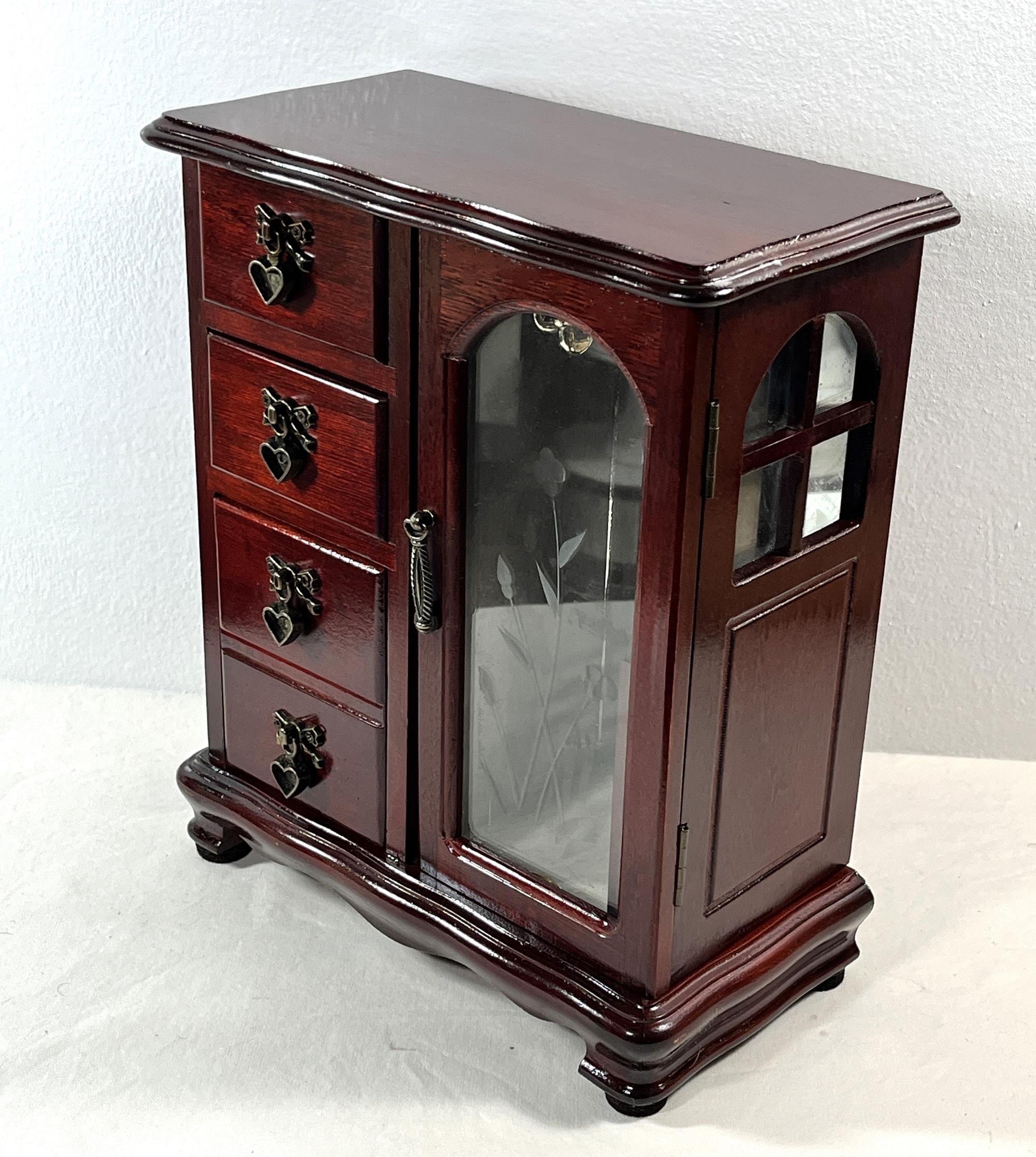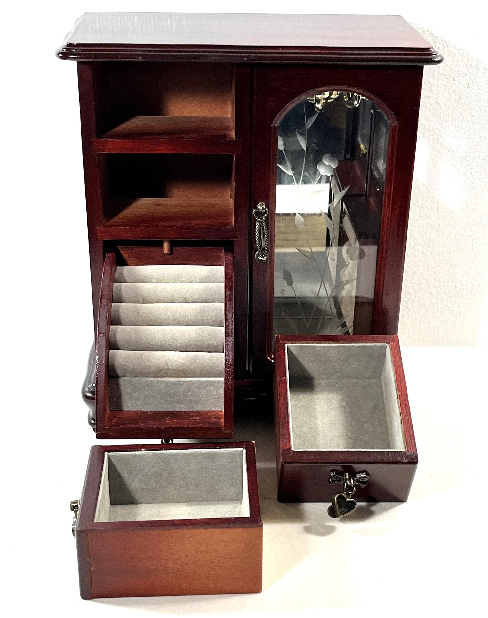 VINTAGE CARVED MAHOGANY WOOD JEWELRY ARMOIRE.