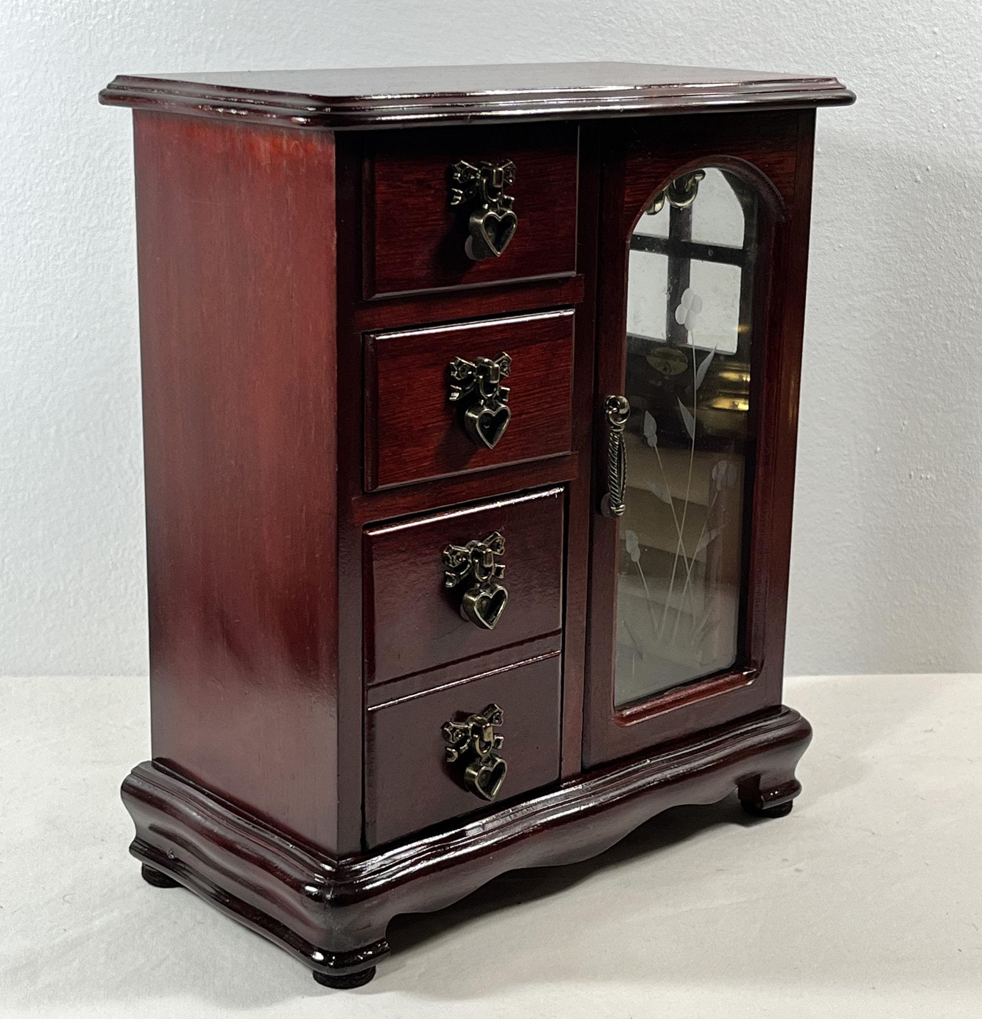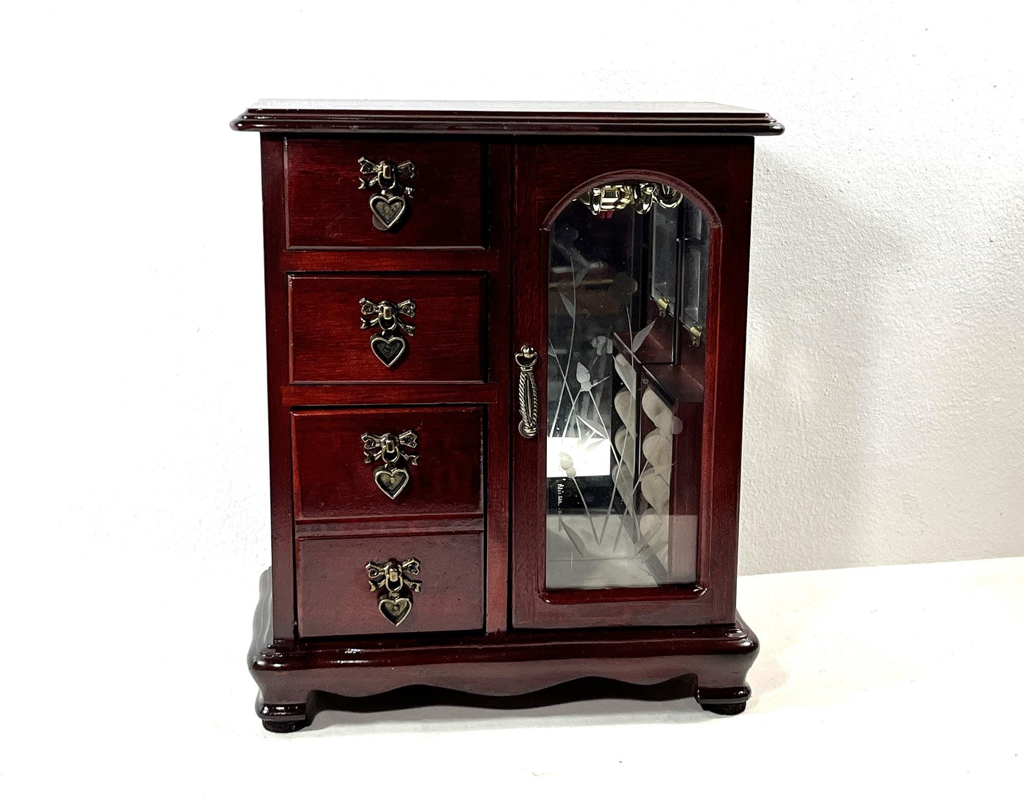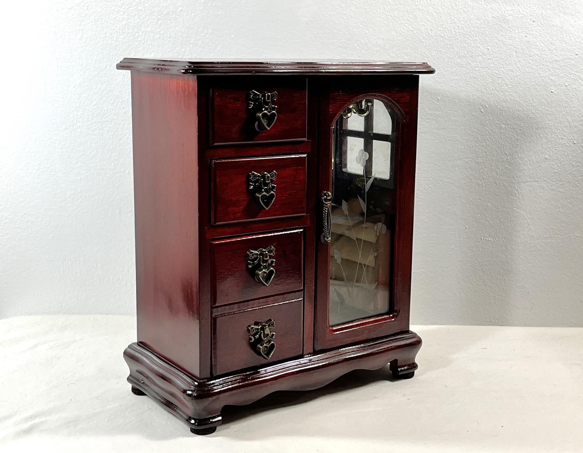 VINTAGE CARVED MAHOGANY WOOD JEWELRY ARMOIRE.