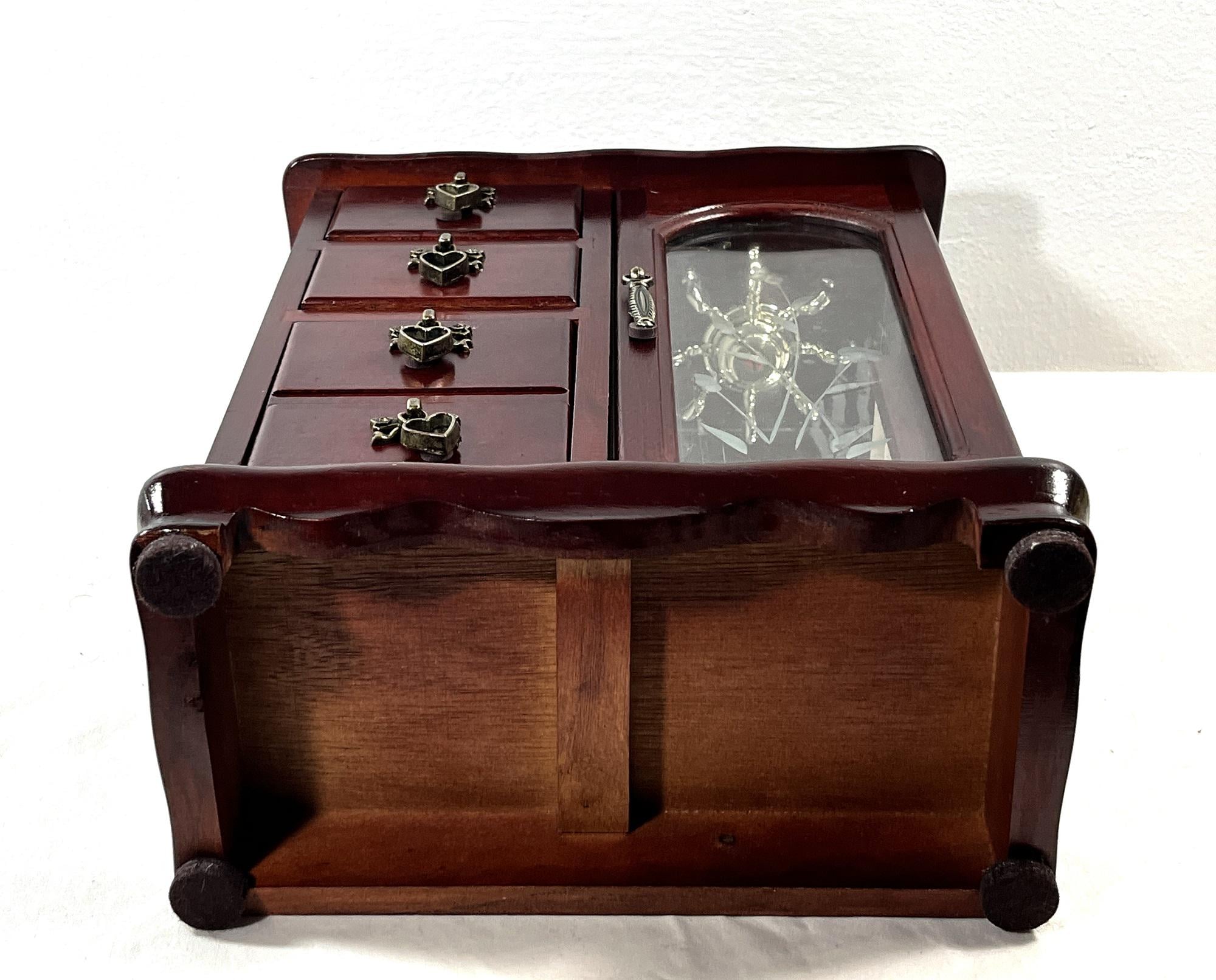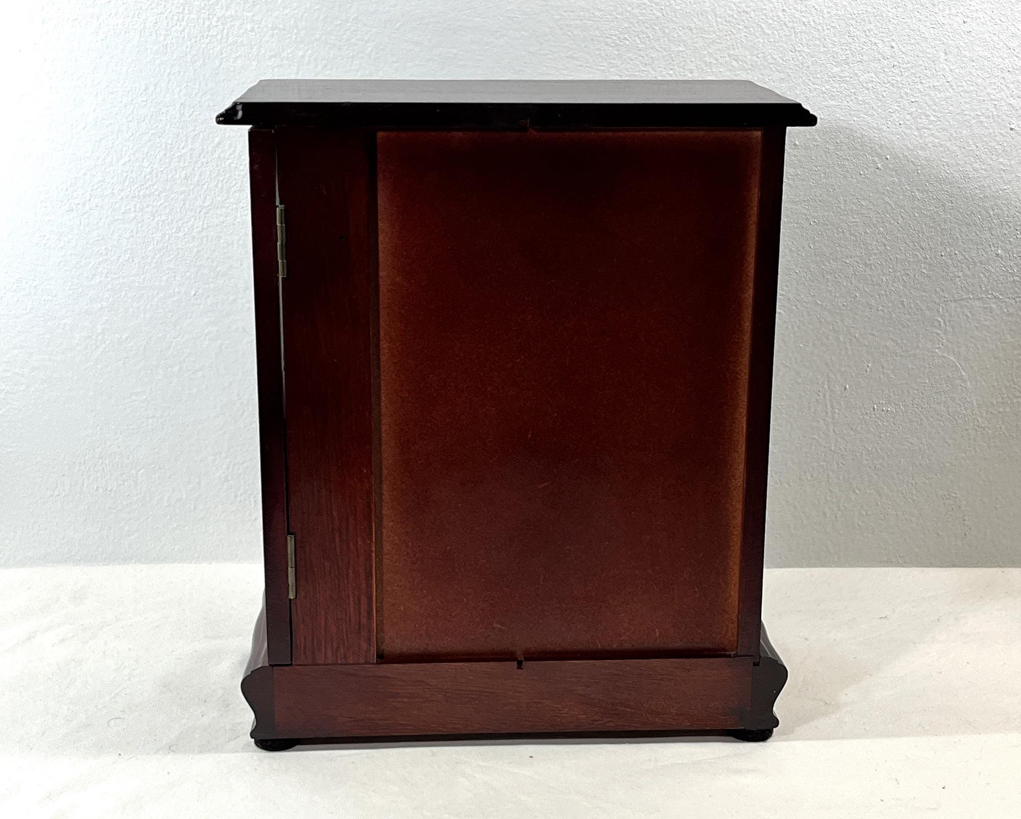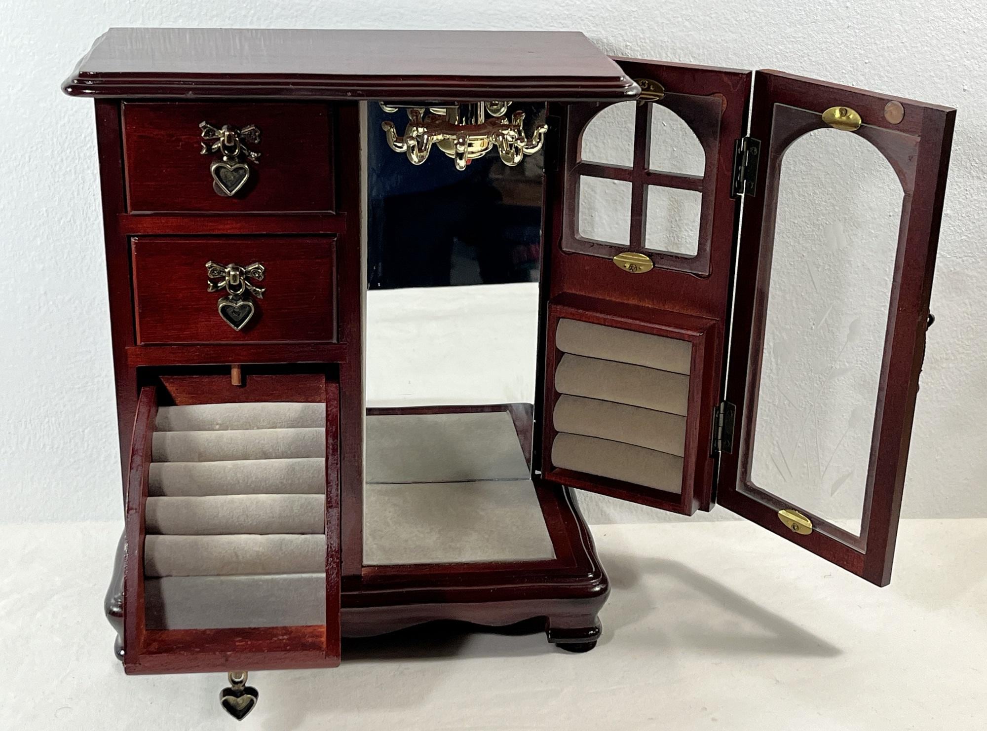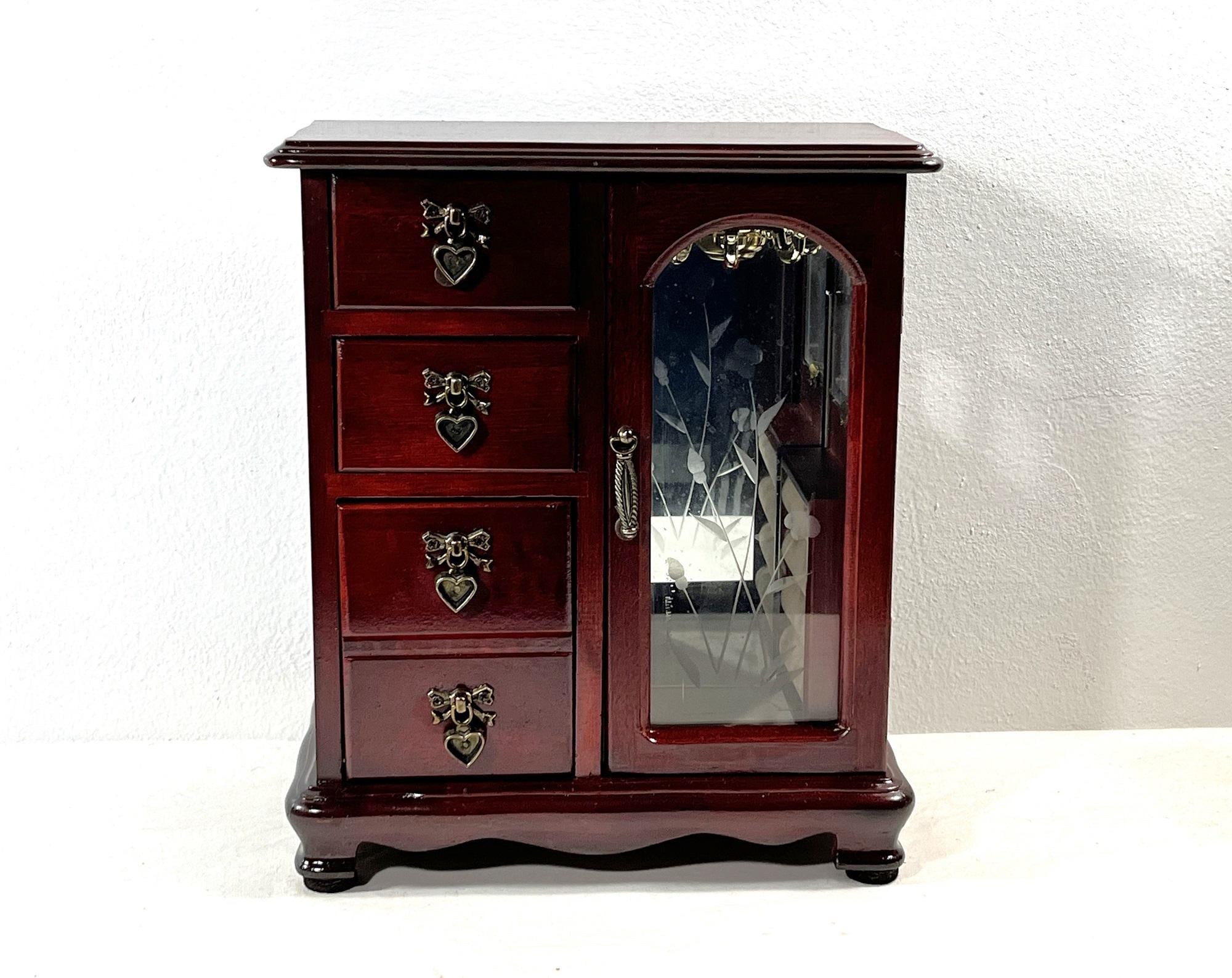 VINTAGE CARVED MAHOGANY WOOD JEWELRY ARMOIRE.