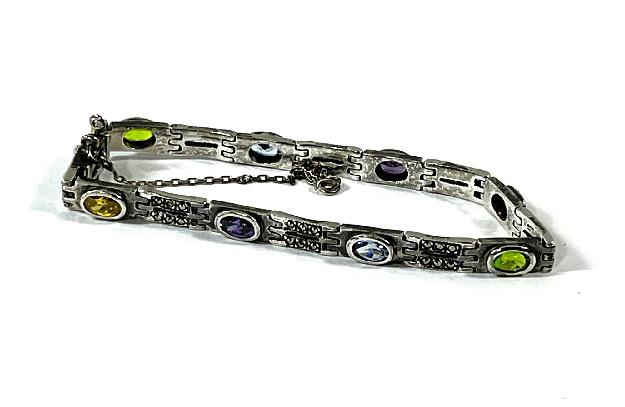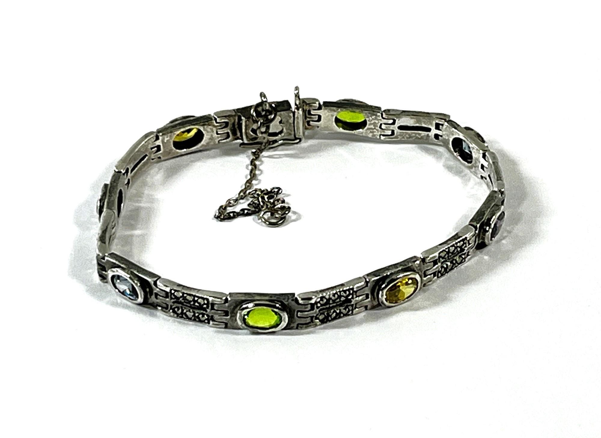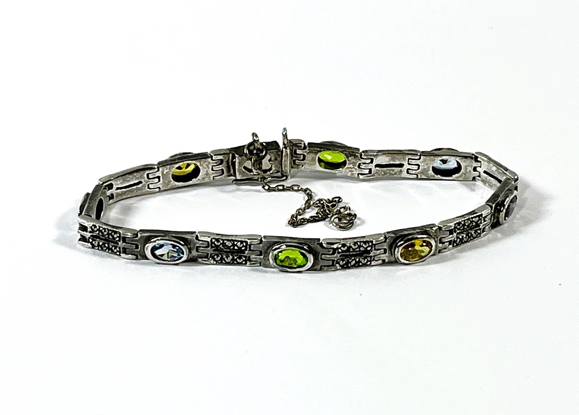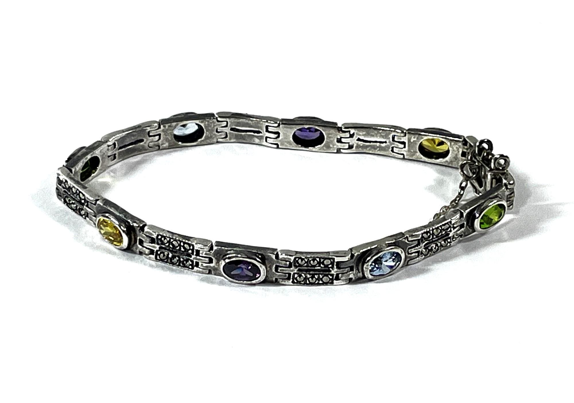 VINTAGE STERLING SILVER MARCASITE AND MULTI GEMSTONE BRACELET.