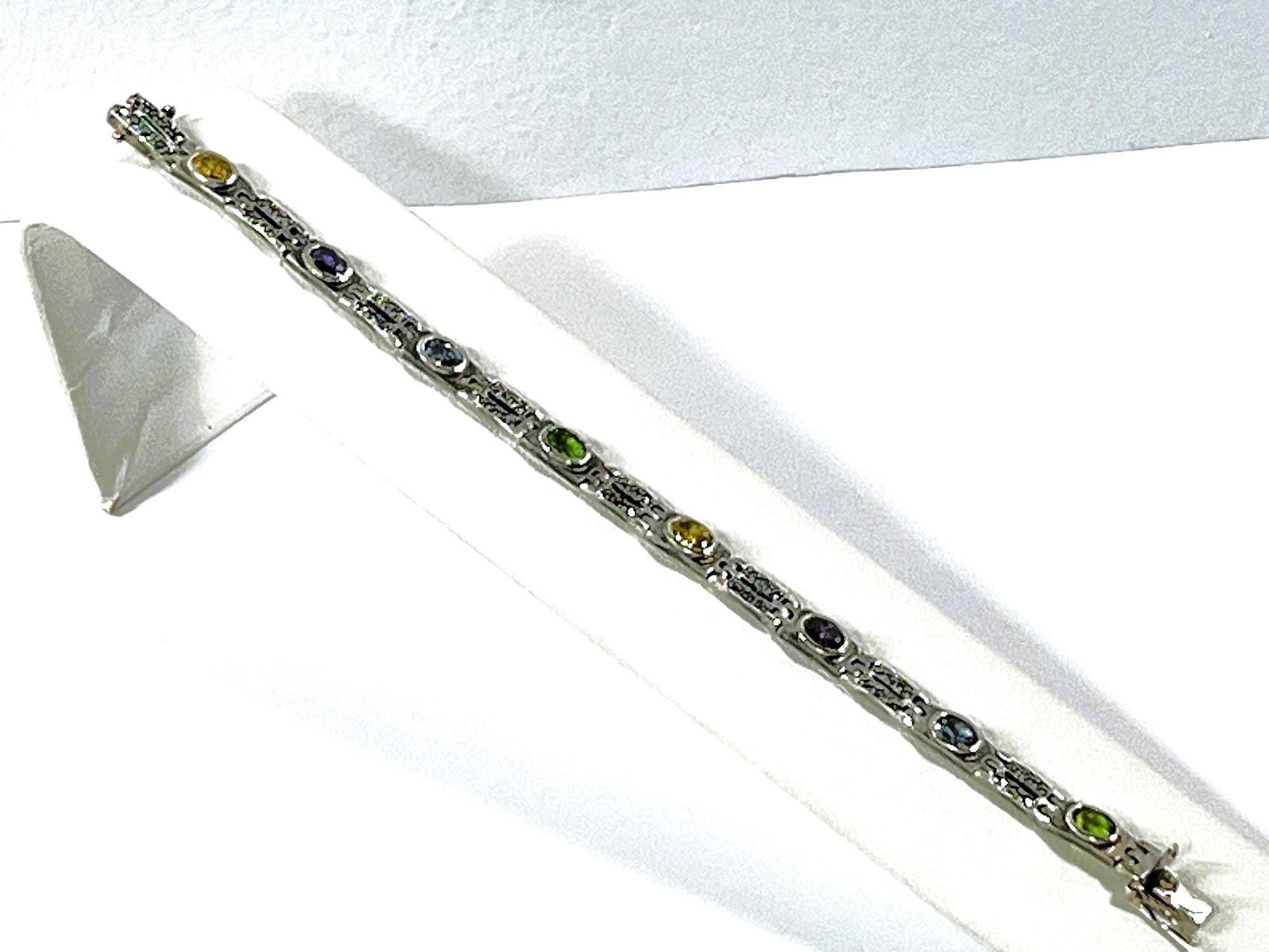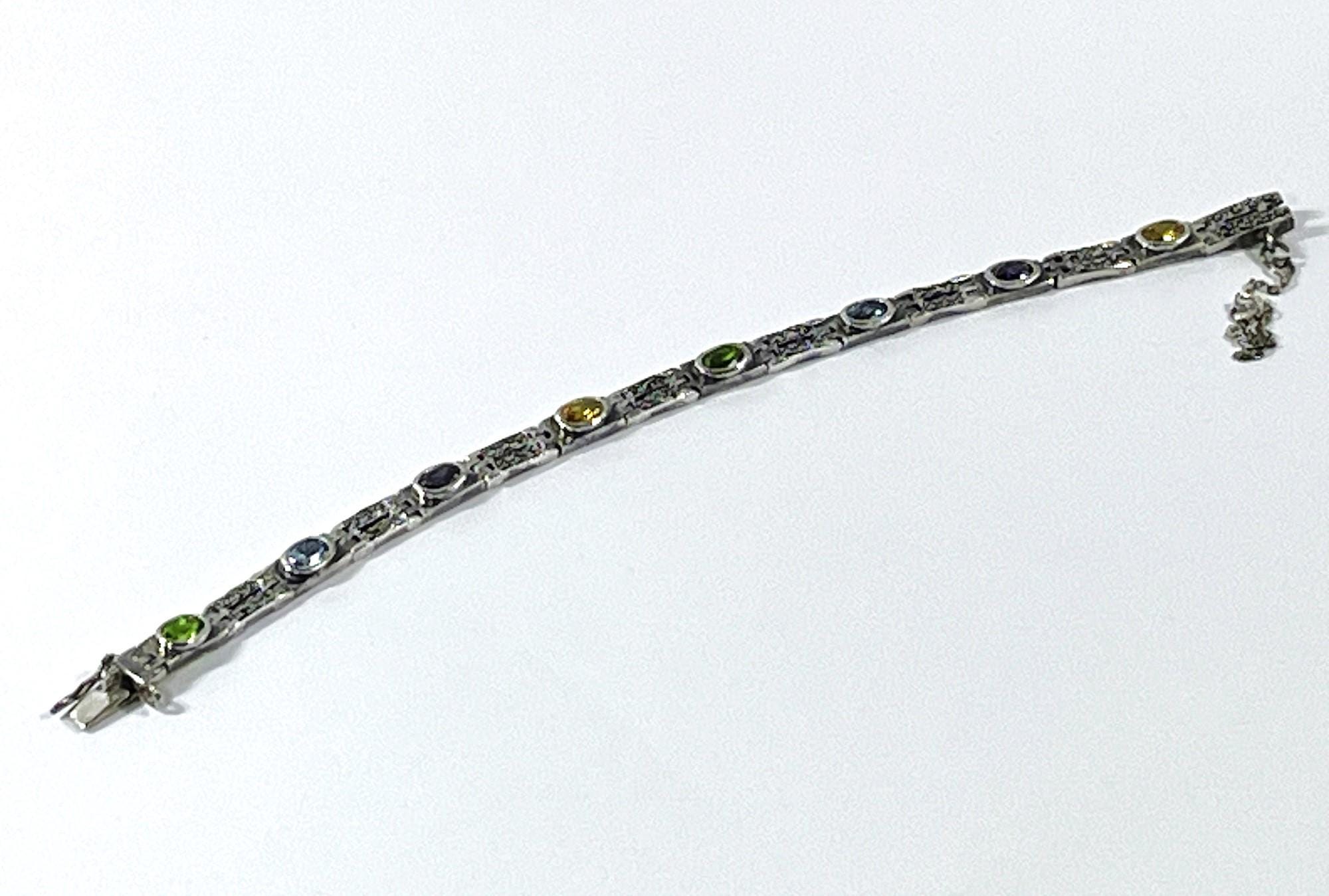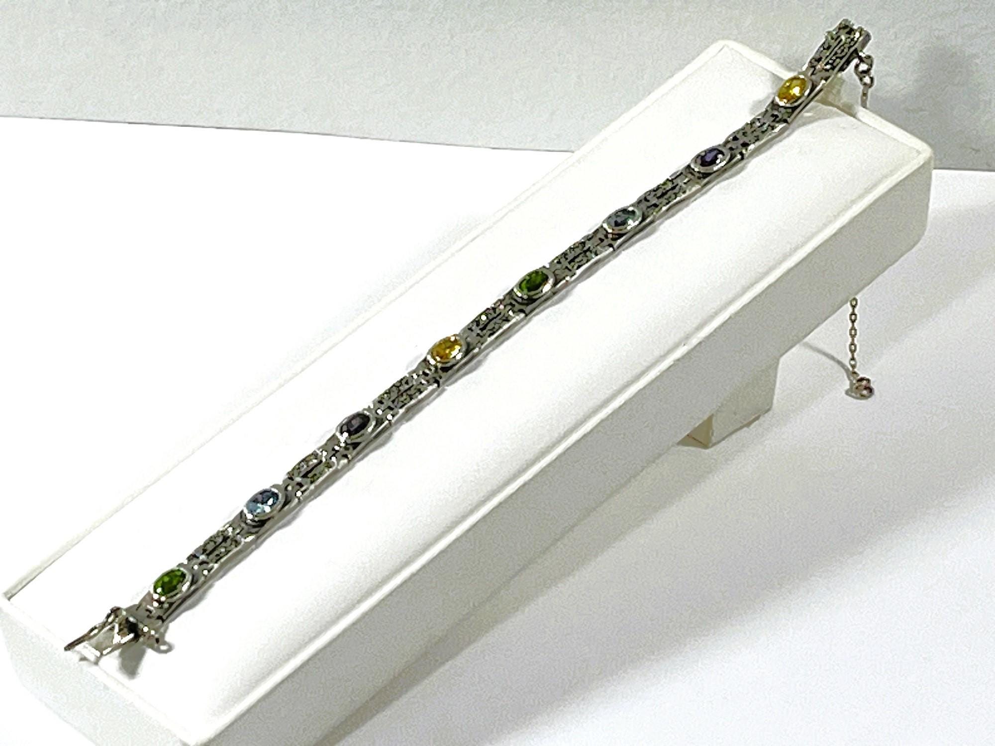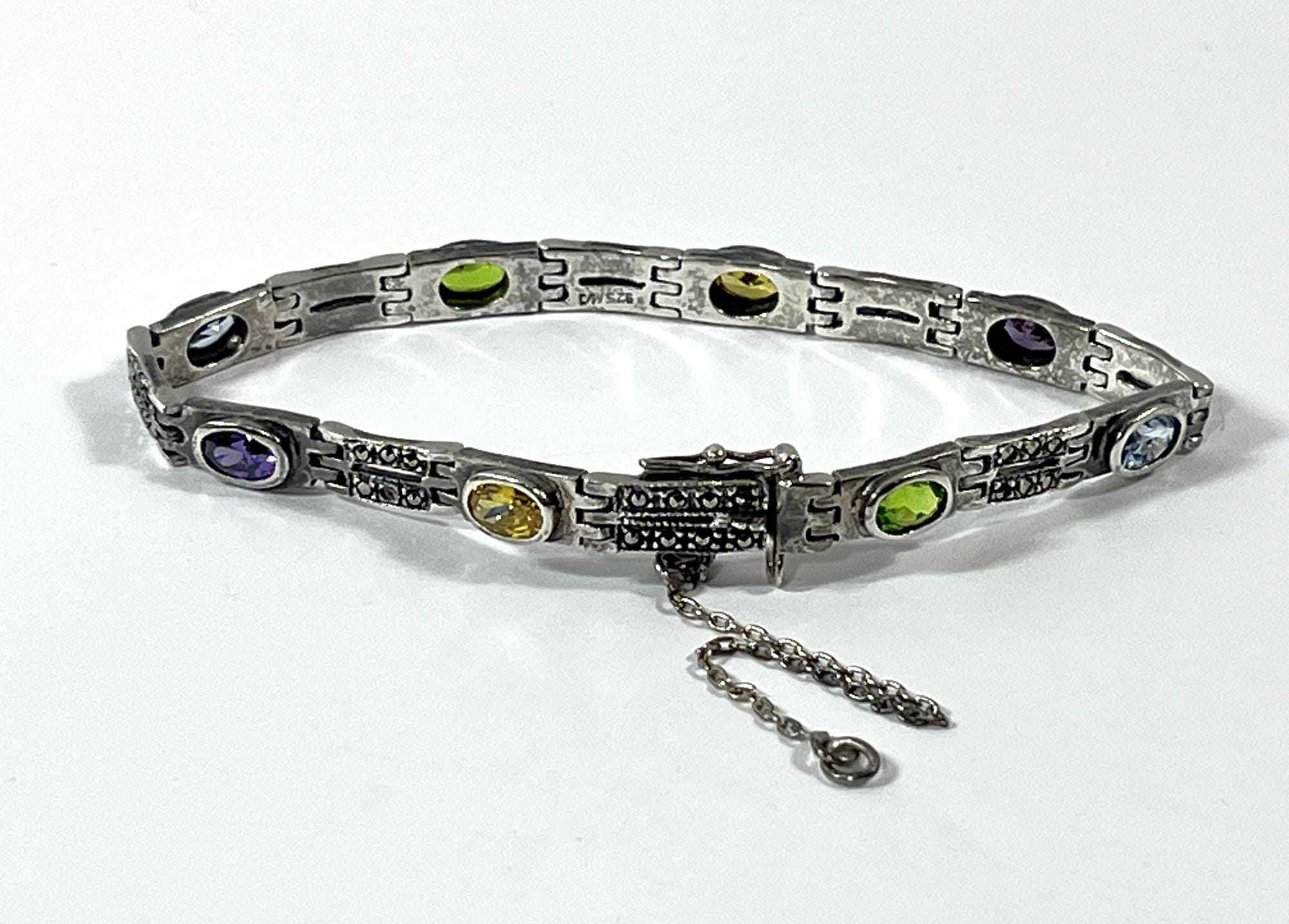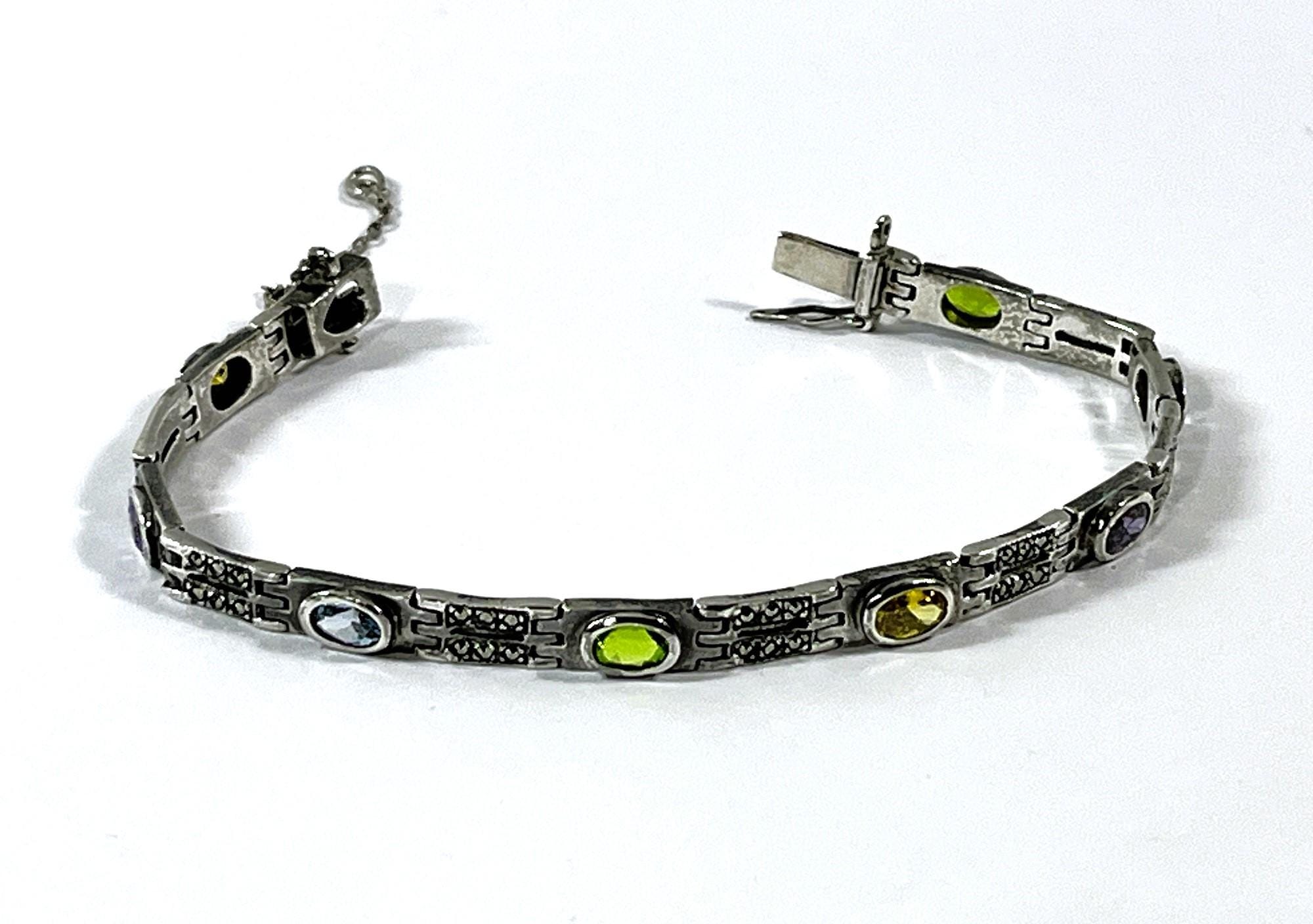 VINTAGE STERLING SILVER MARCASITE AND MULTI GEMSTONE BRACELET.