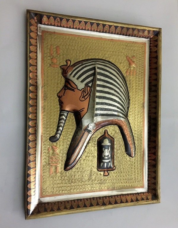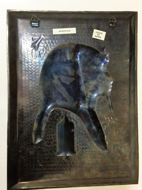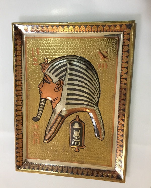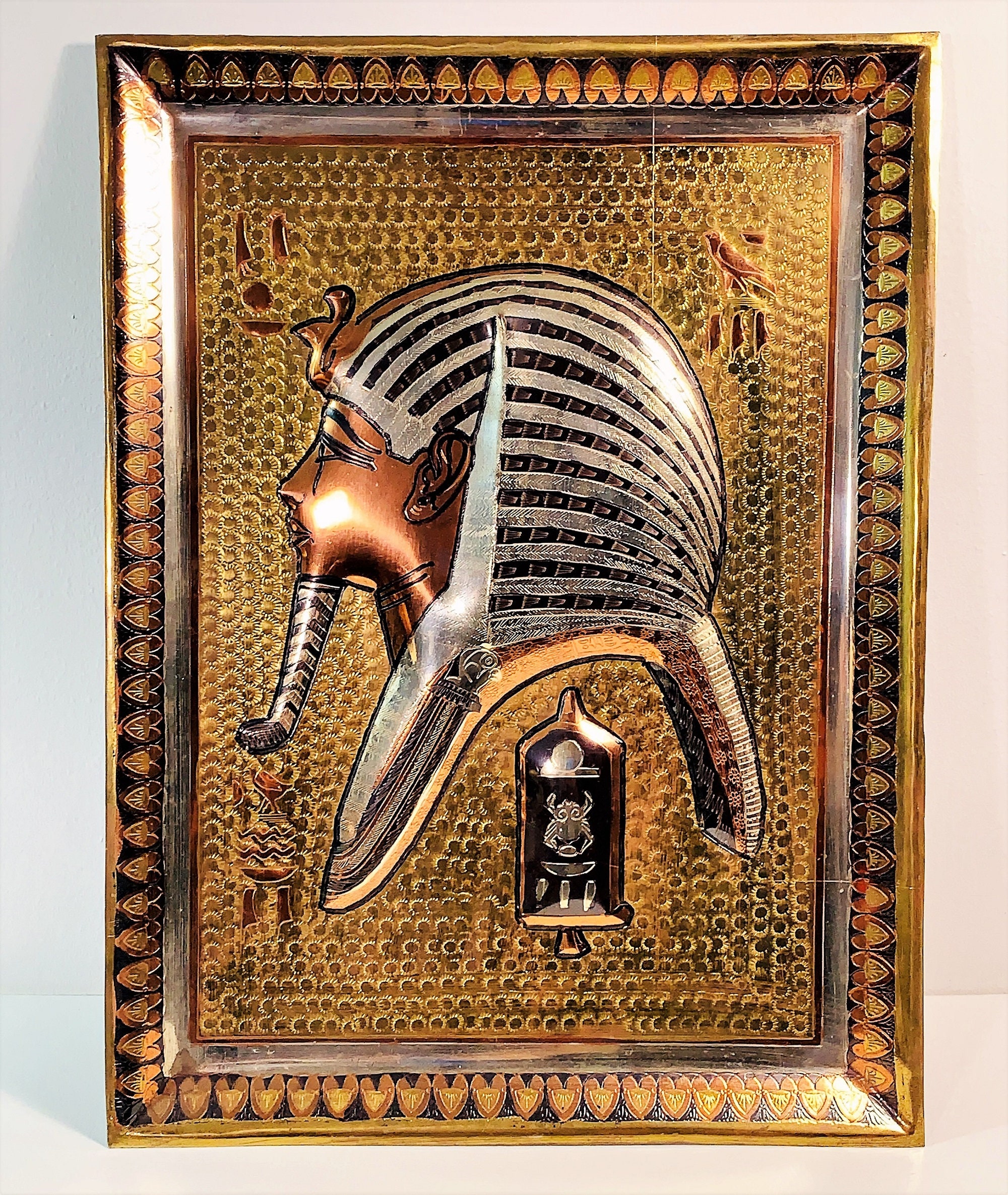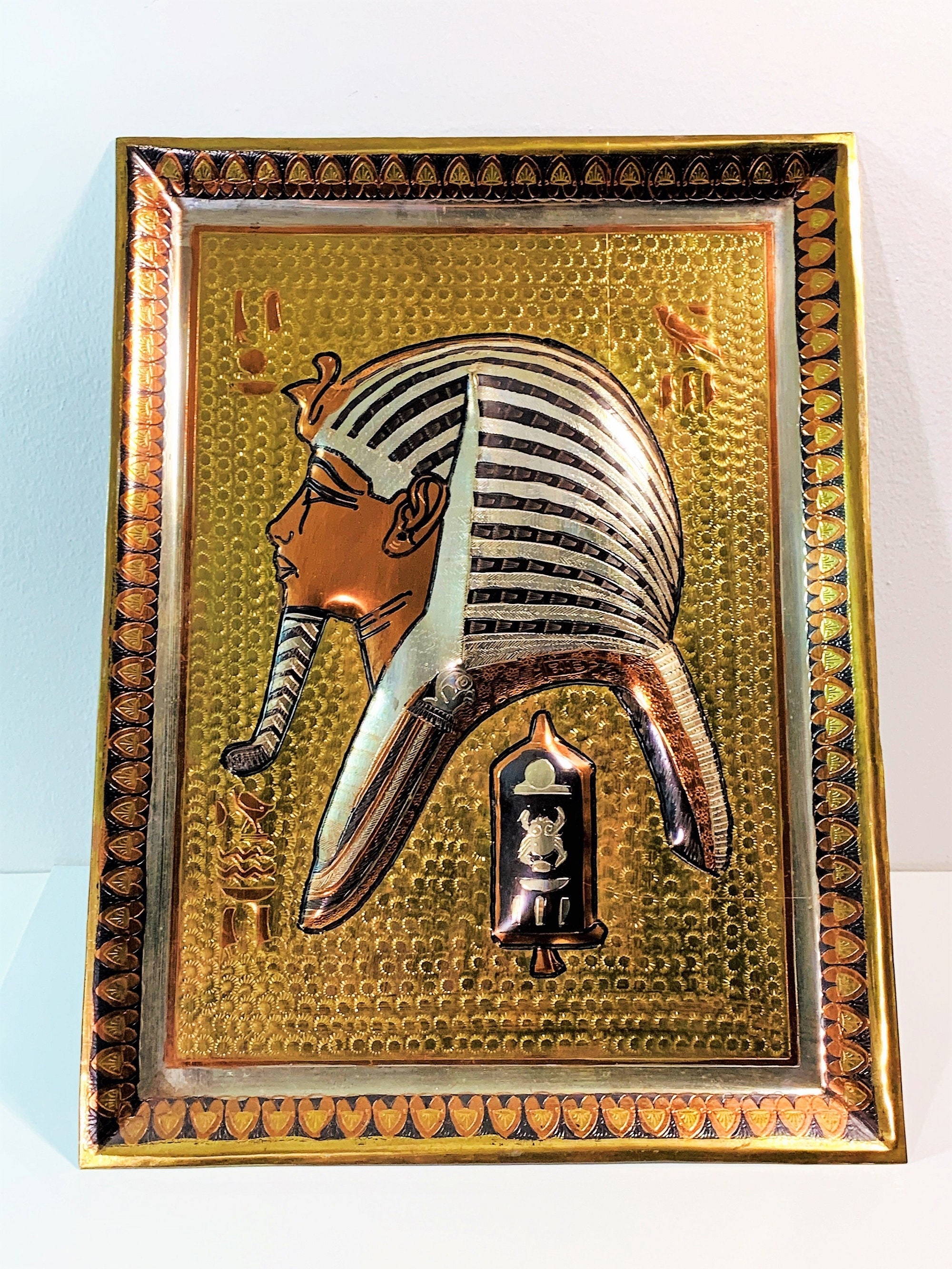 - EMBOSSED HAMMERED OUT RELIEF OF KING TUT GOLD MASK & HIEROGLYPHICS.