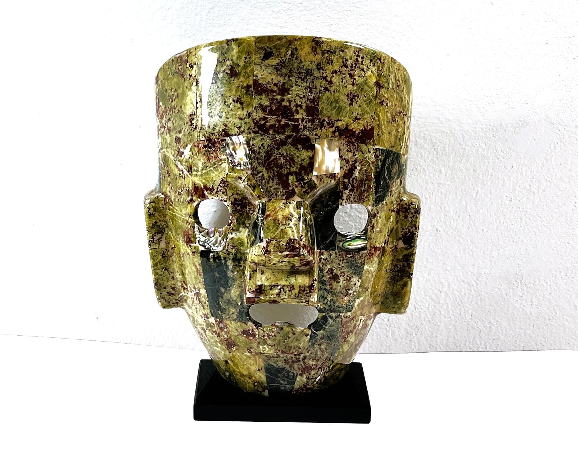 VINTAGE MAYAN AZTEC INCA BURIAL GEMSTONE FACE MASK ON STAND.