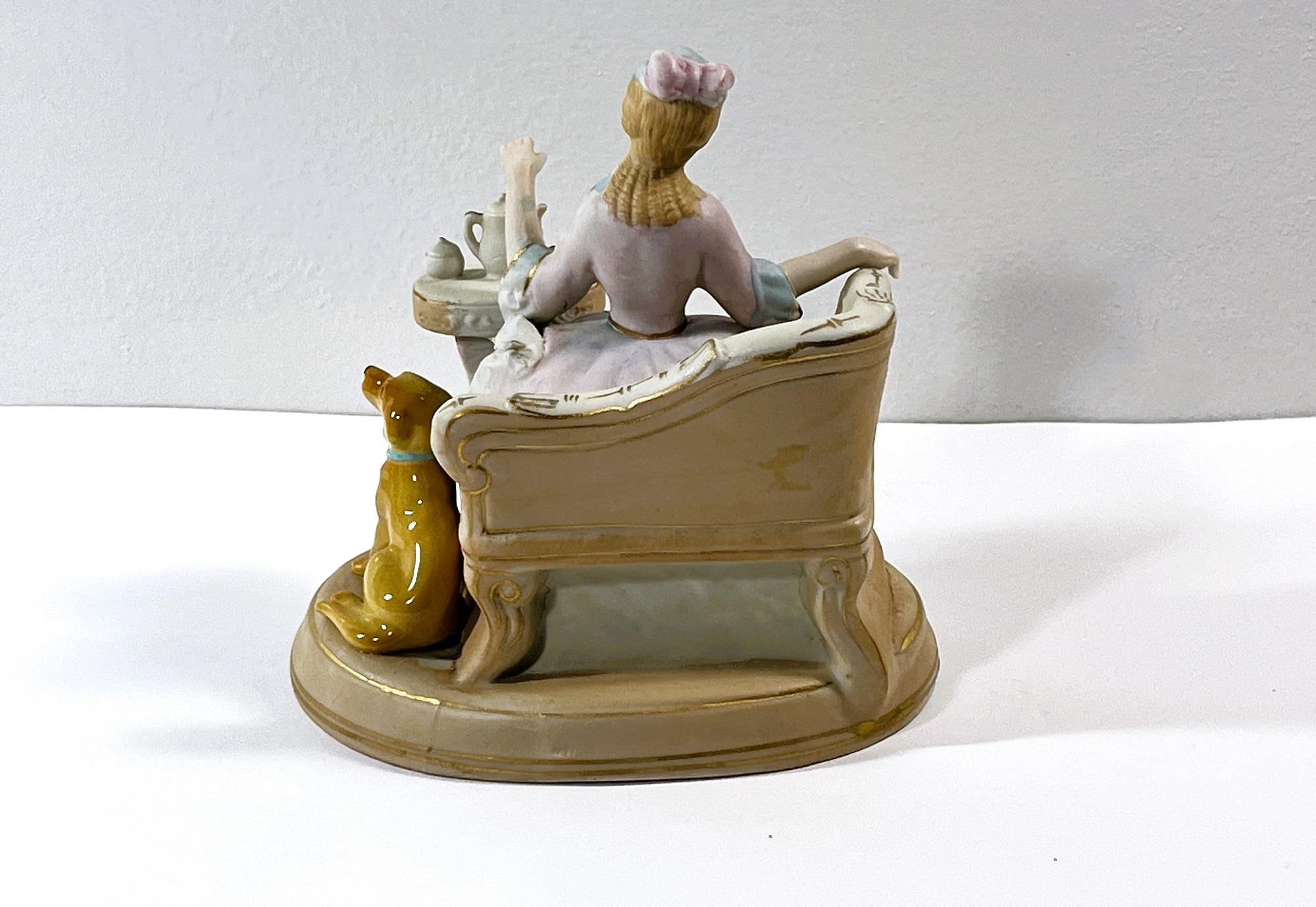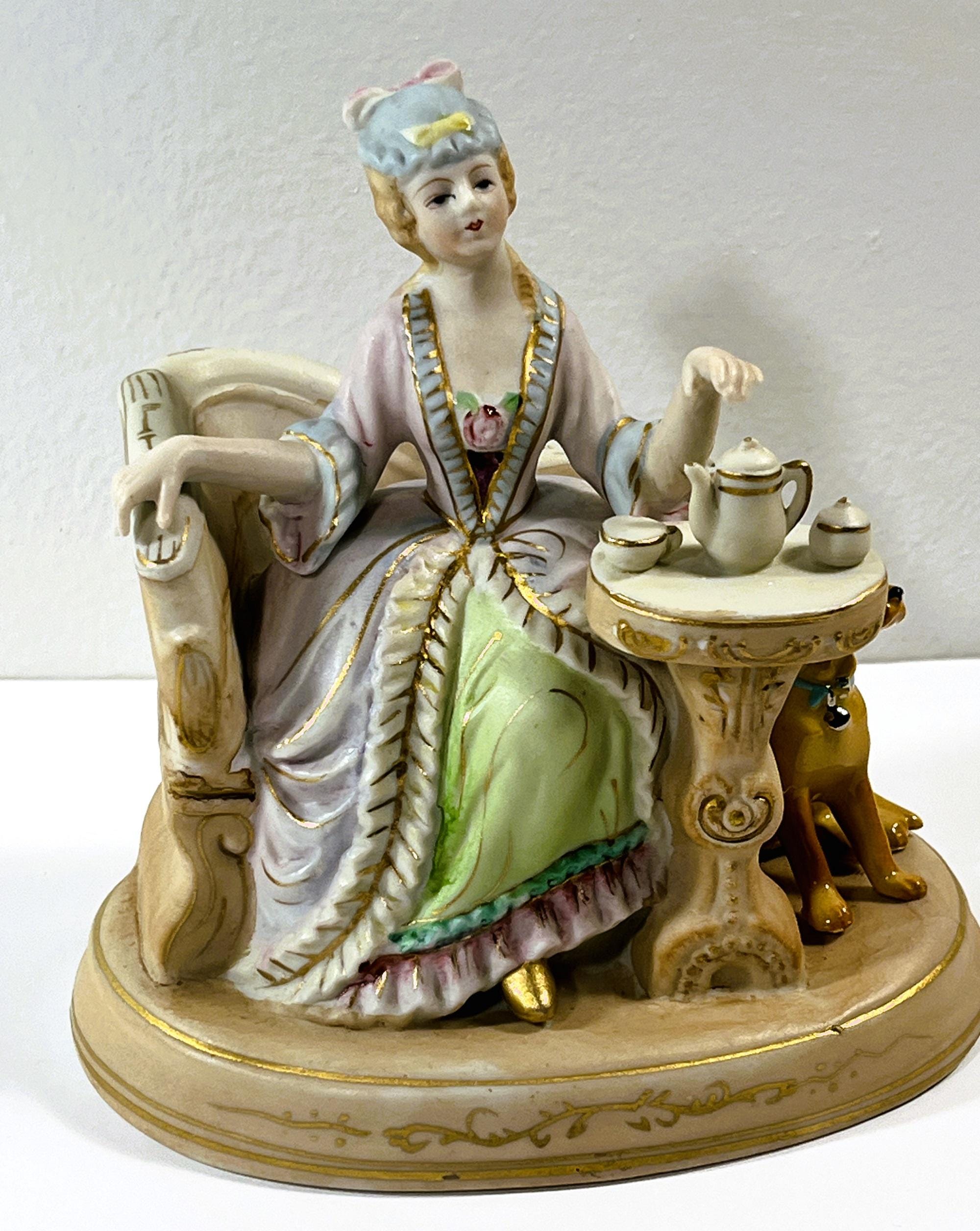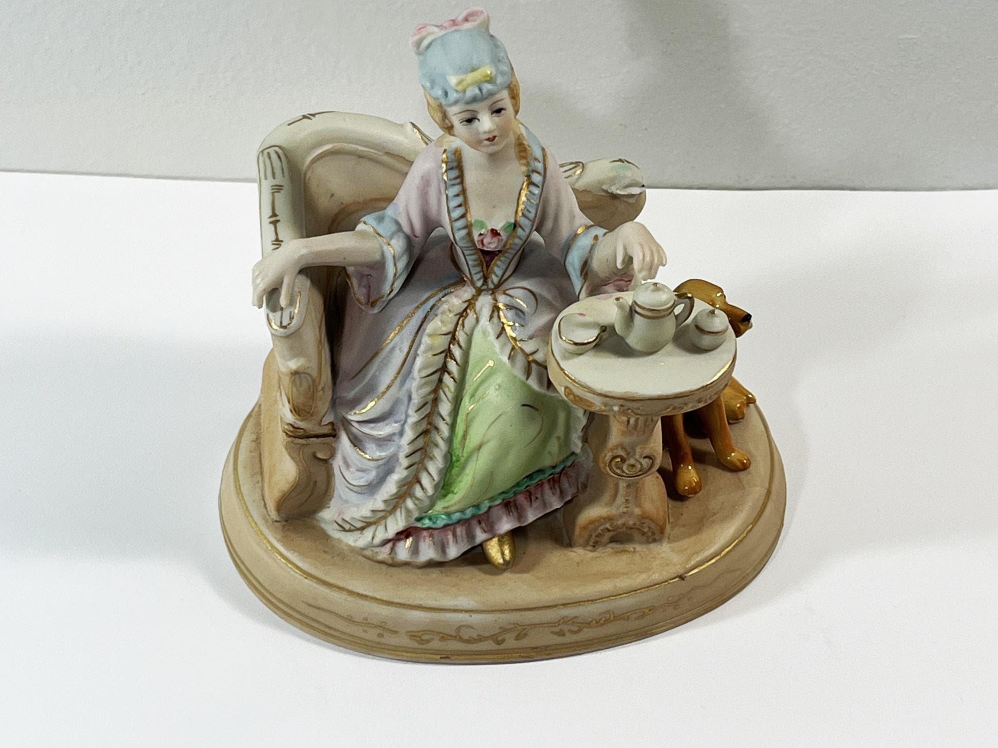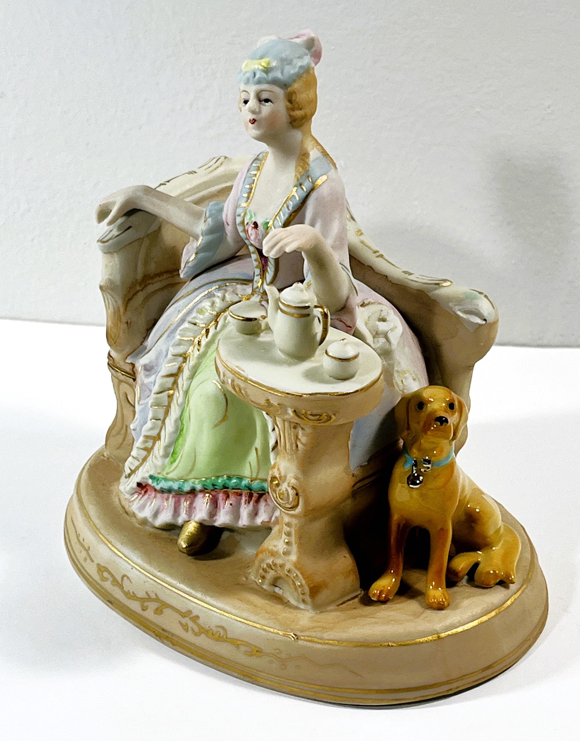 - LADY LOUNGING "TEA TIME" WITH HER DOG. SIGNED ON THE BOTTOM WITH THE LOGO.