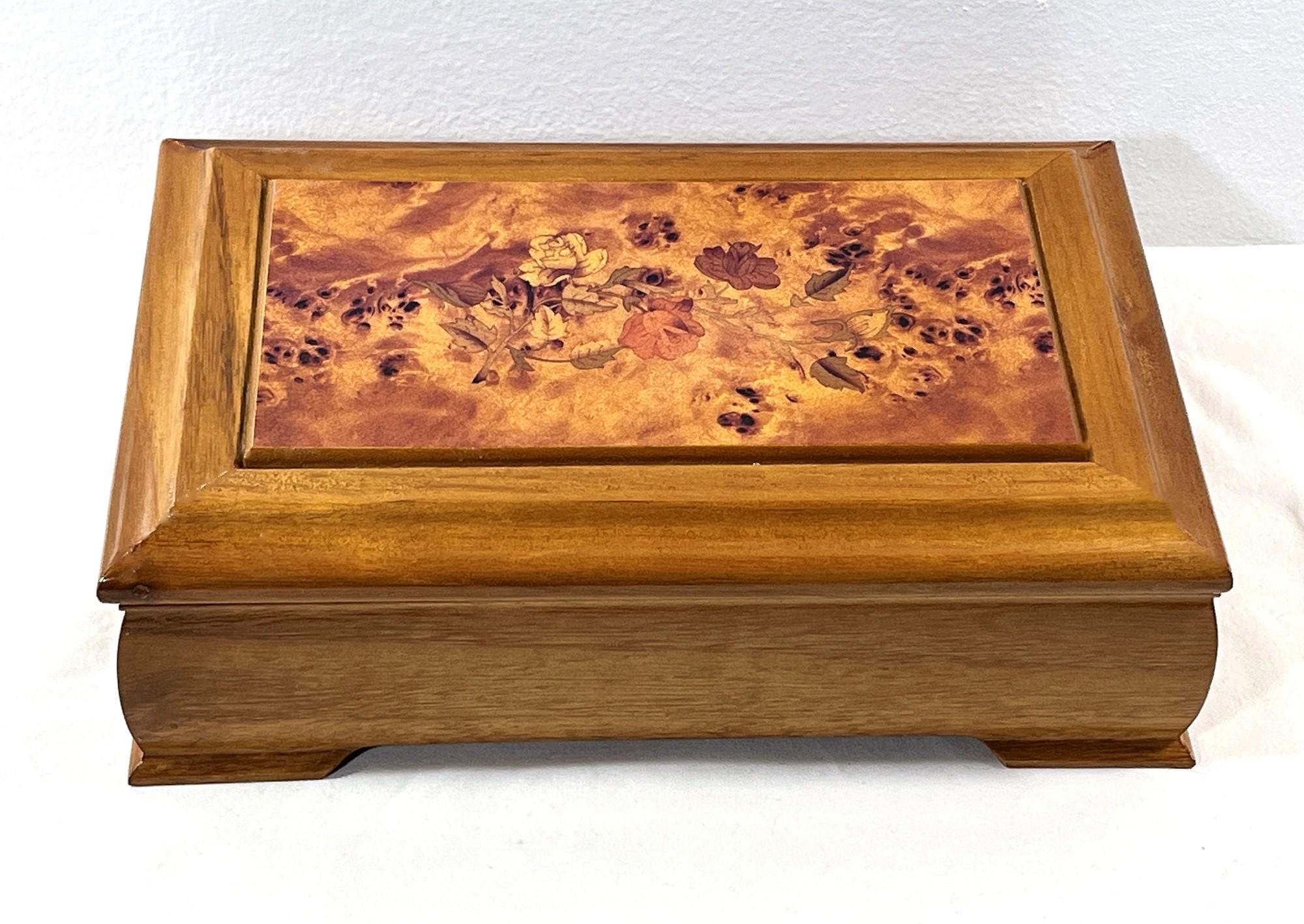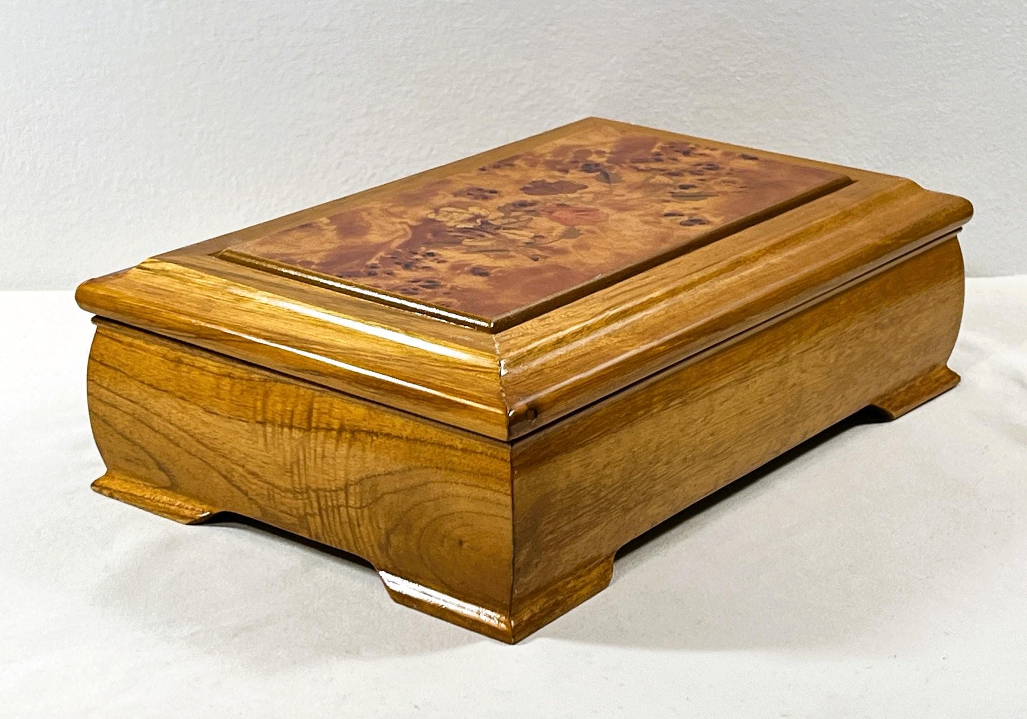 - CARVED WOOD, GOLDEN OAK & BURL WOOD WITH FLOWER SCENERY ON TOP.