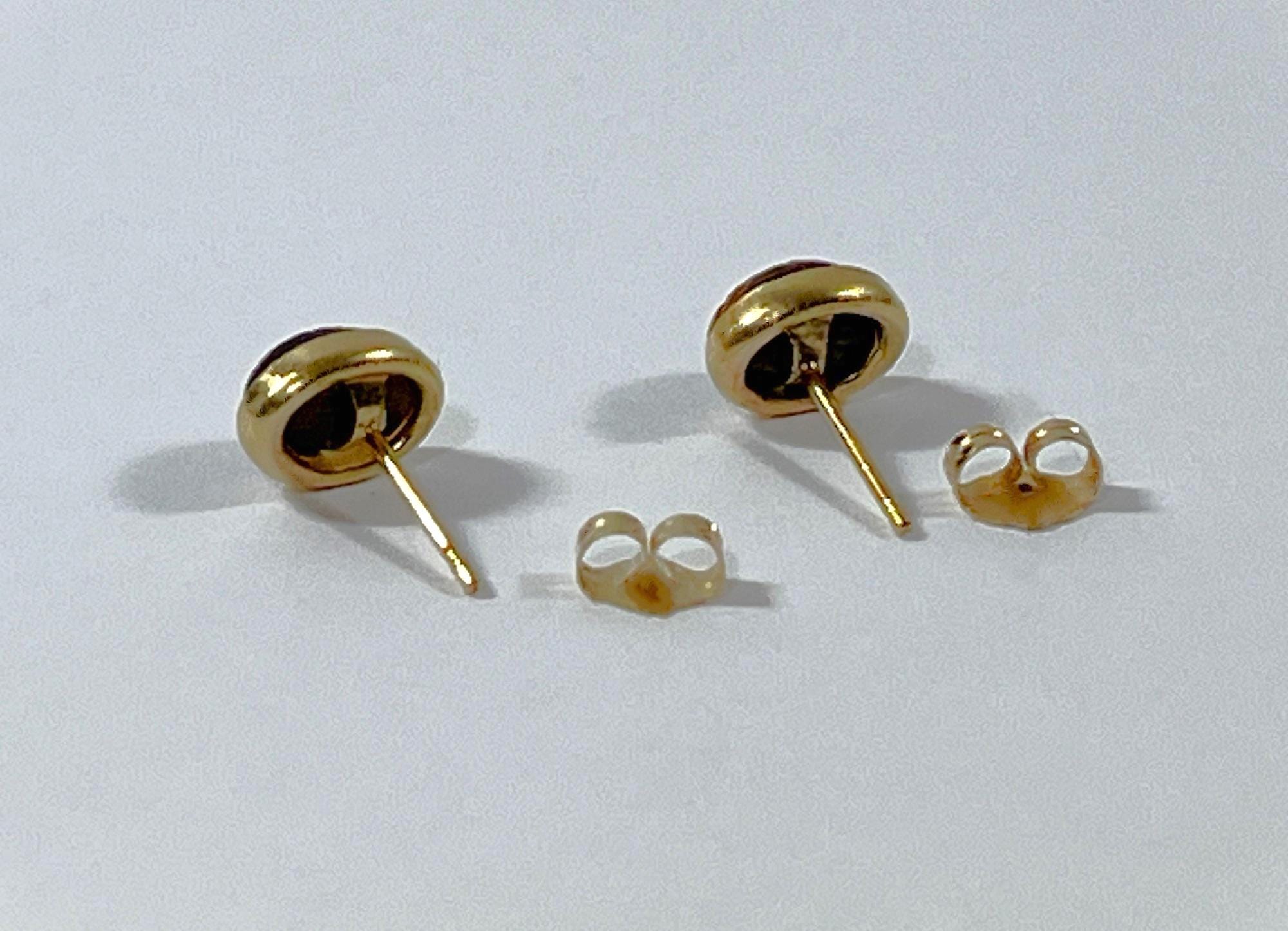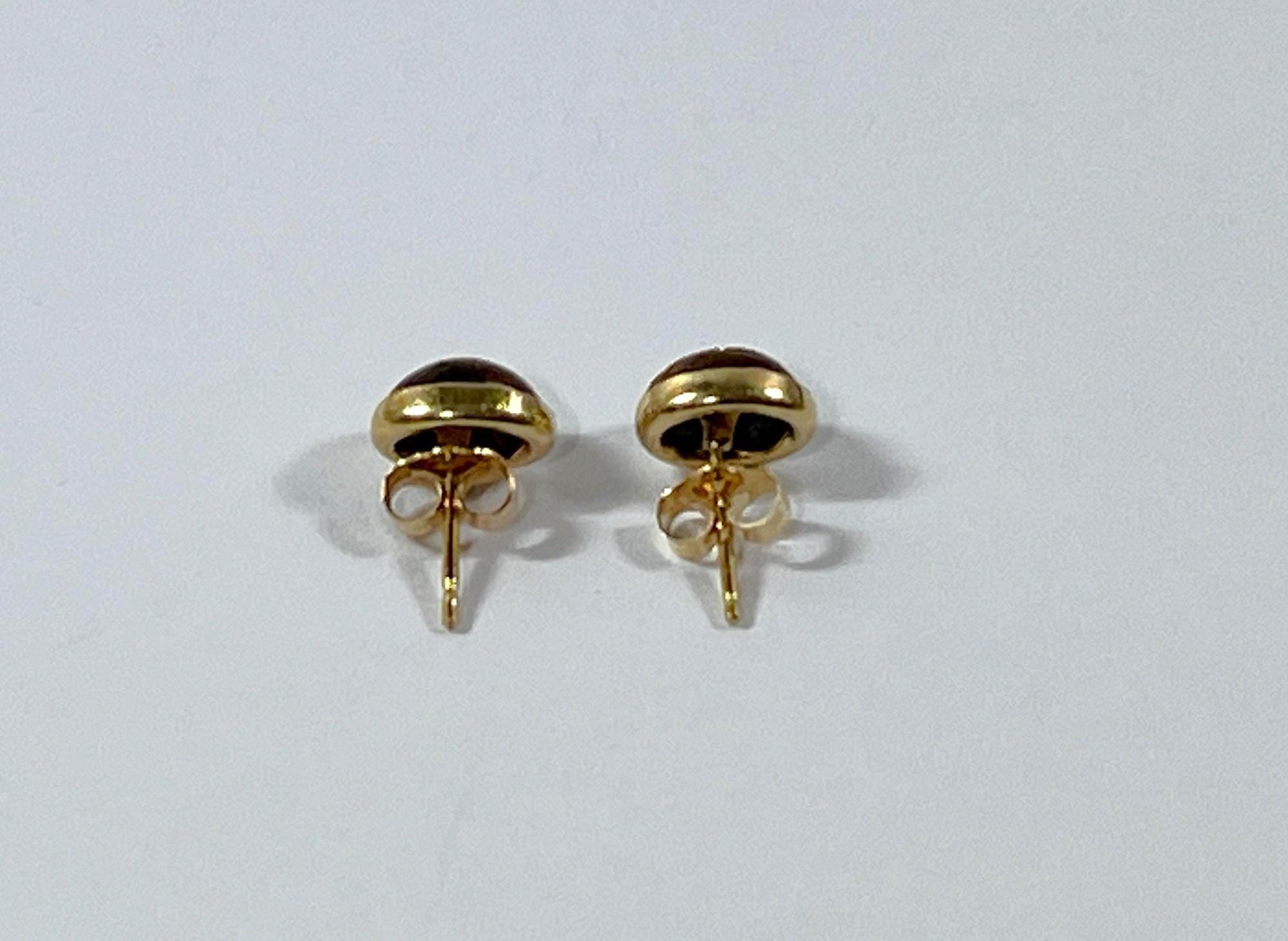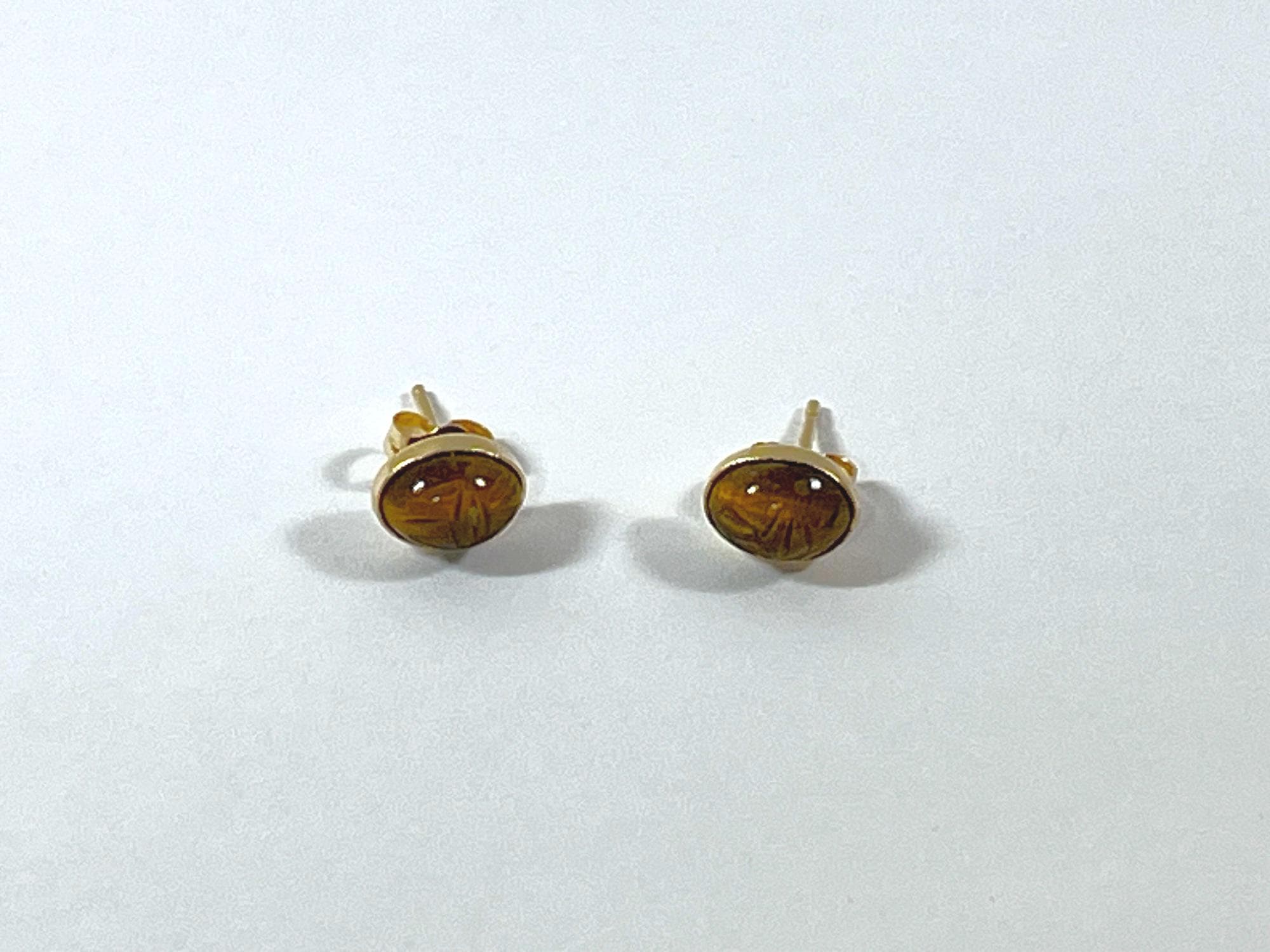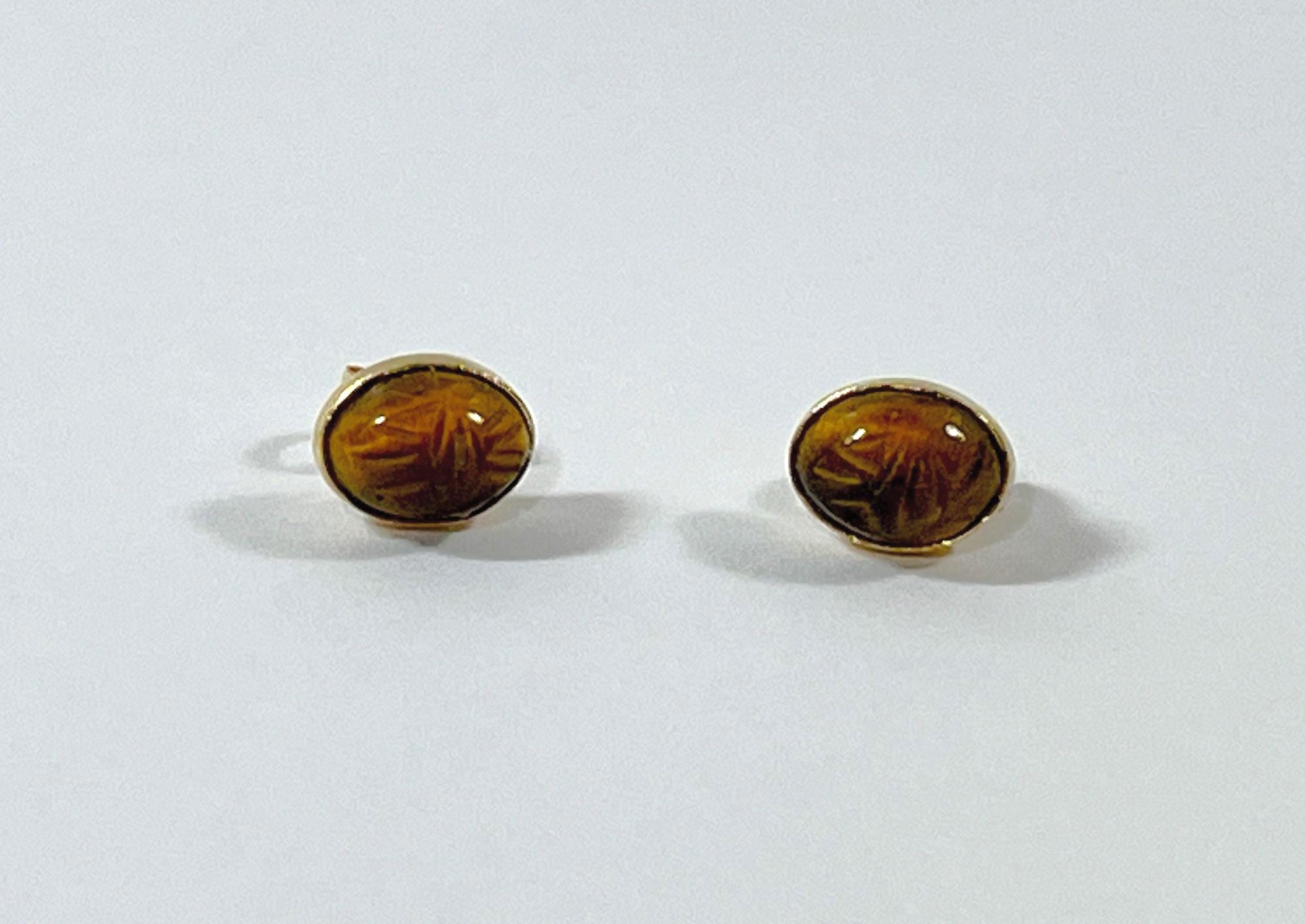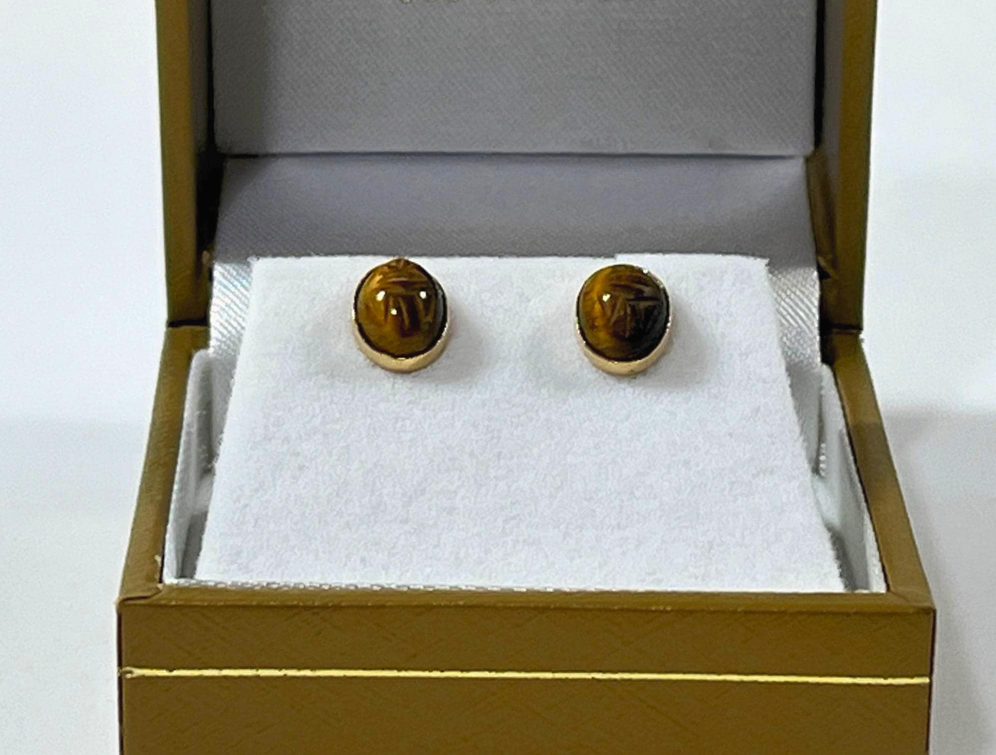 VINTAGE 14K SOLID YELLOW GOLD TIGER'S EYE GEMSTONE SCARABS STUD EARRINGS.