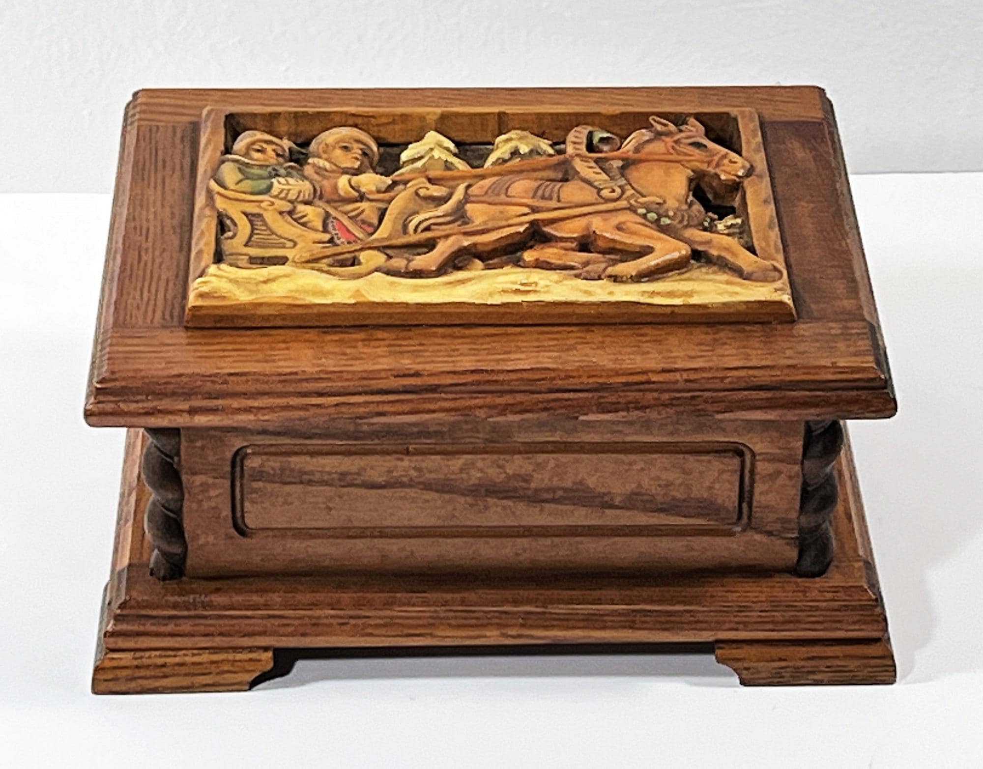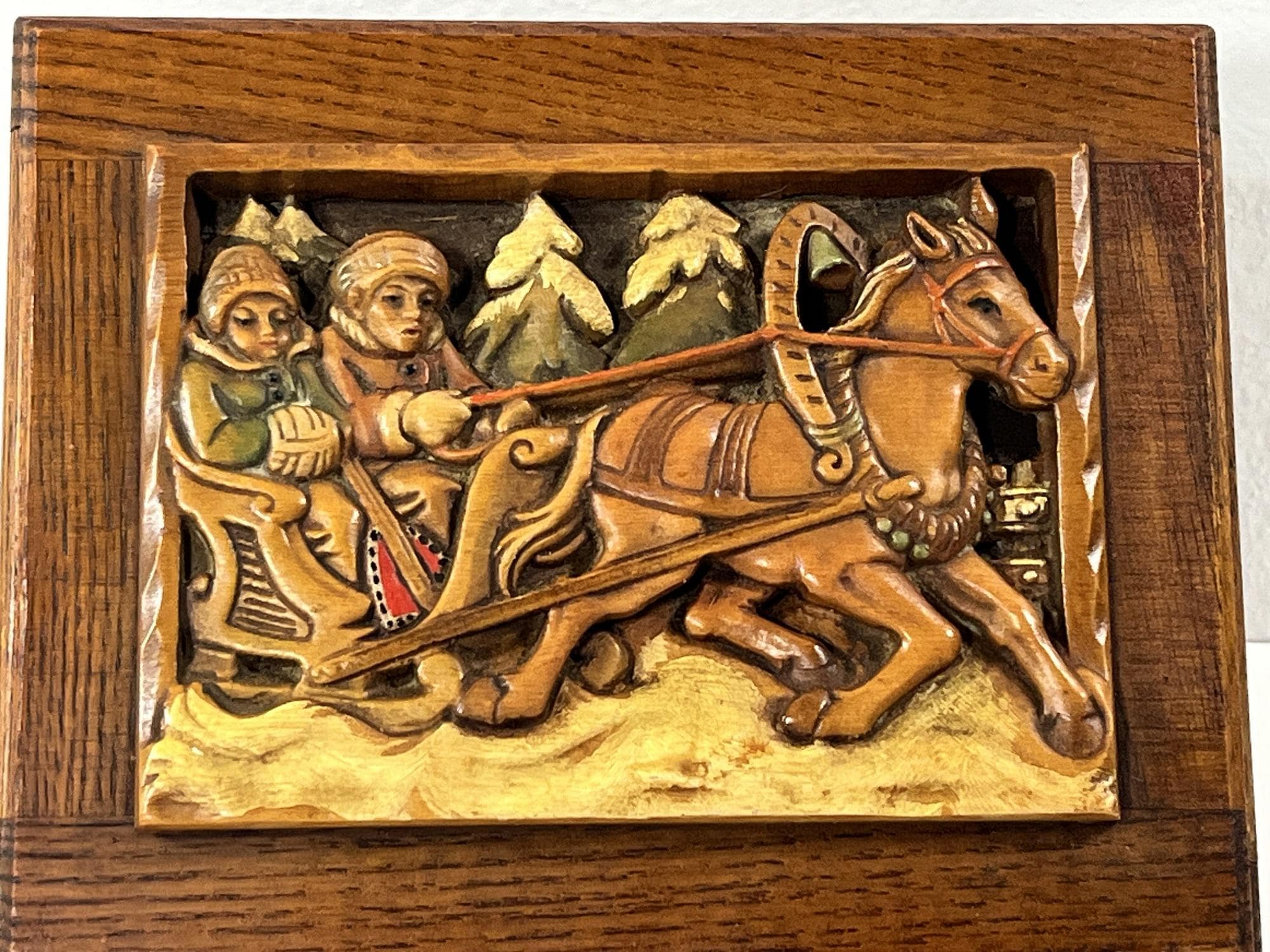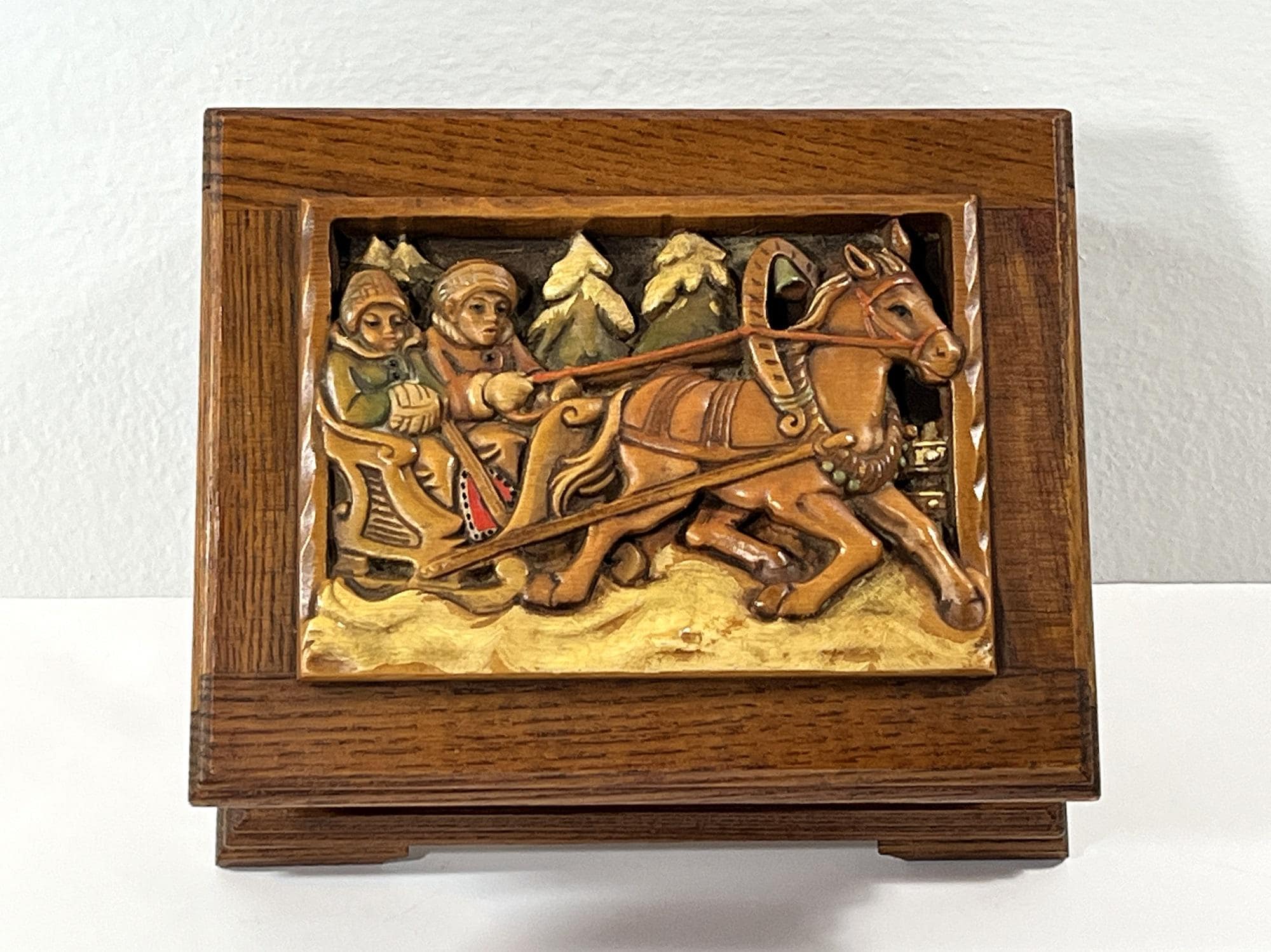 - CARVED FINE WOOD, CARVED 3 DIMENSIONS HORSE SLEIGH ON TOP (PICTURED). INCREDIBLE REALISTIC DETAILS, LIGHT TOUCH PAINT. HANDCRAFTED IN SWITZERLAND.