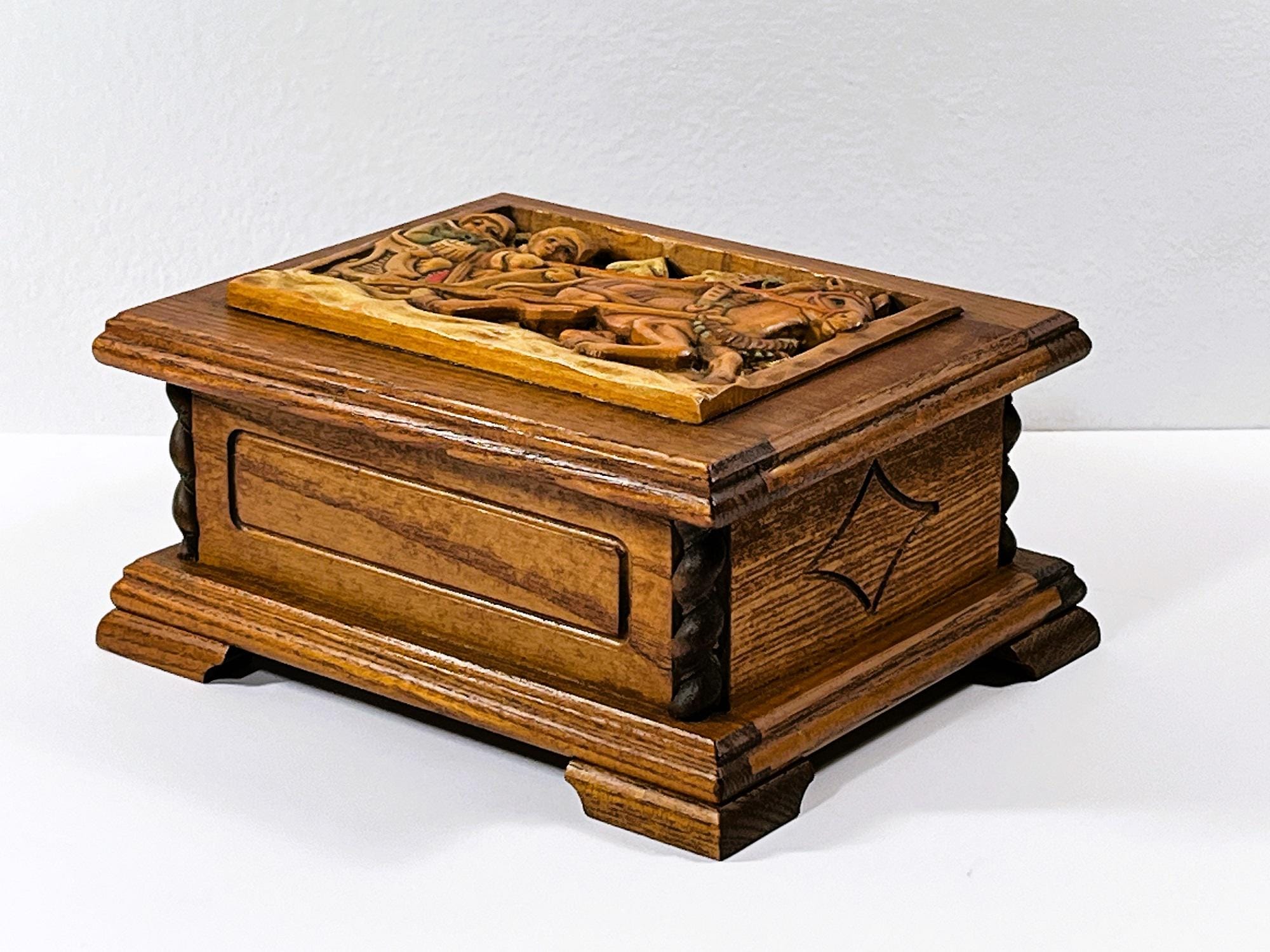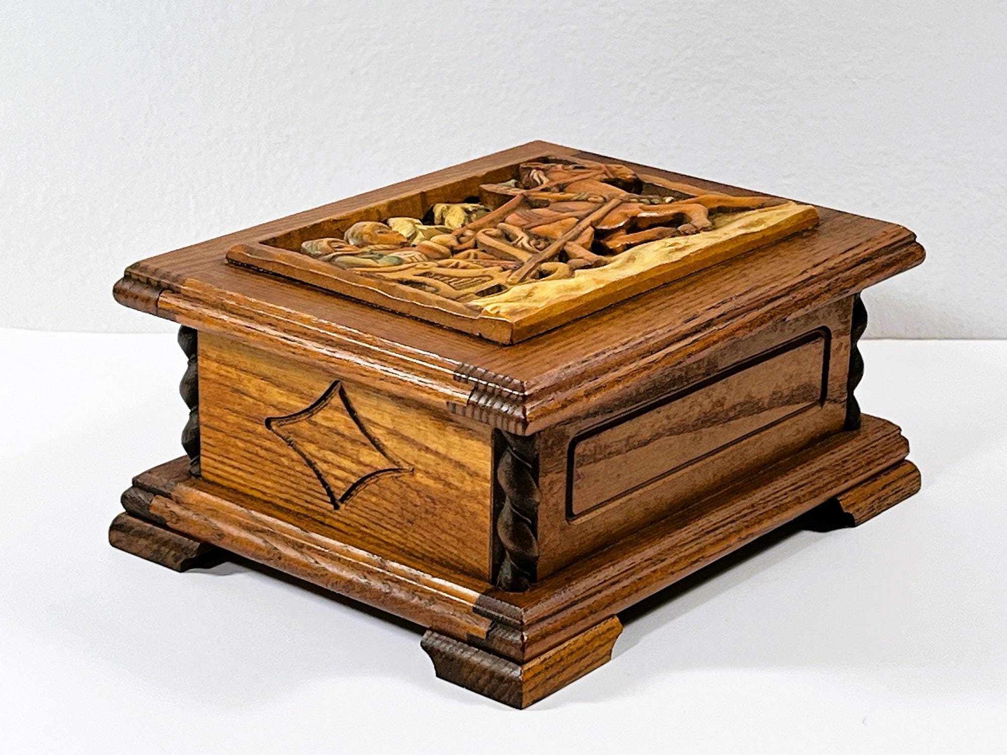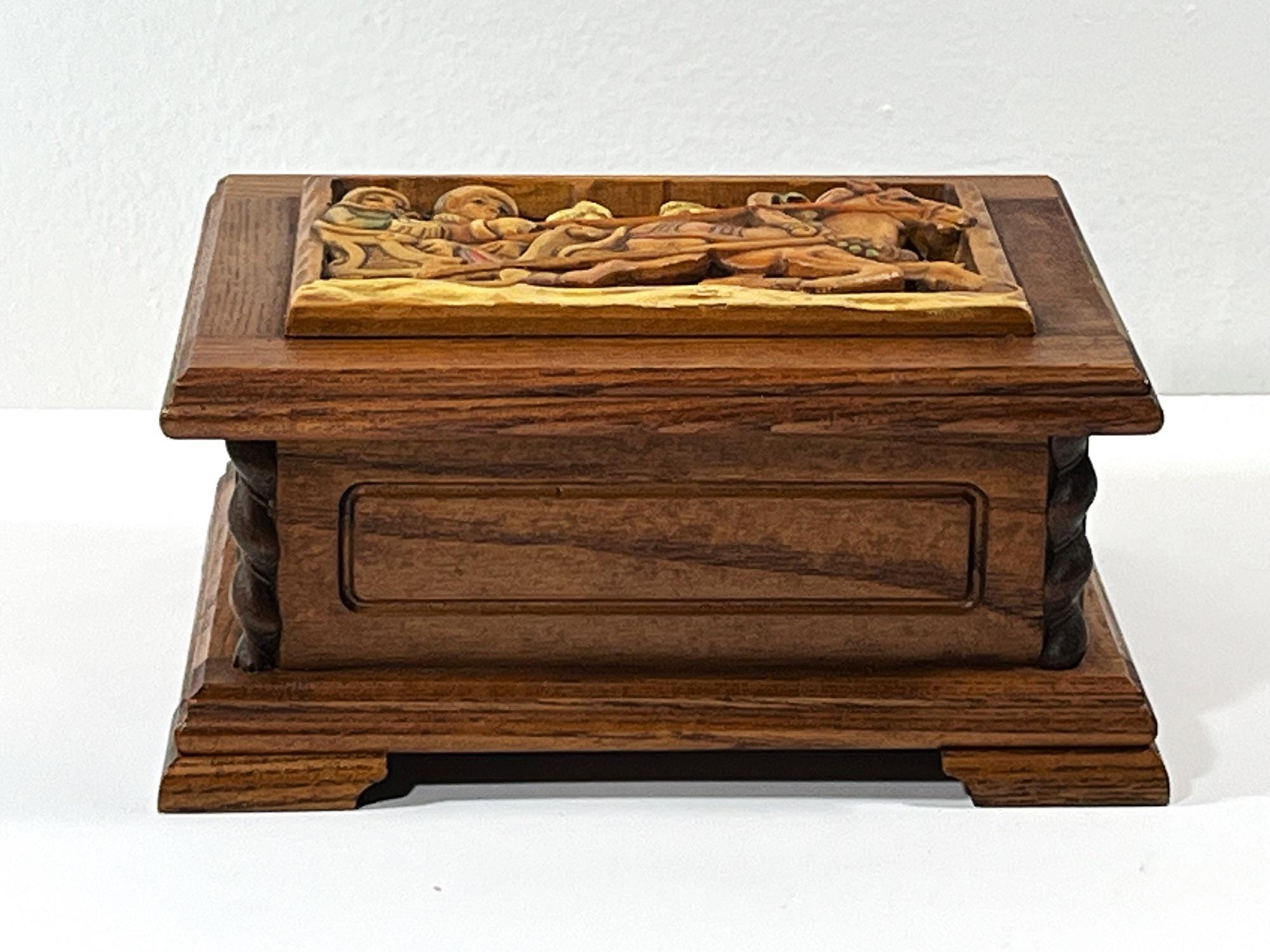 - CARVED FINE WOOD, CARVED 3 DIMENSIONS HORSE SLEIGH ON TOP (PICTURED). INCREDIBLE REALISTIC DETAILS, LIGHT TOUCH PAINT. HANDCRAFTED IN SWITZERLAND.