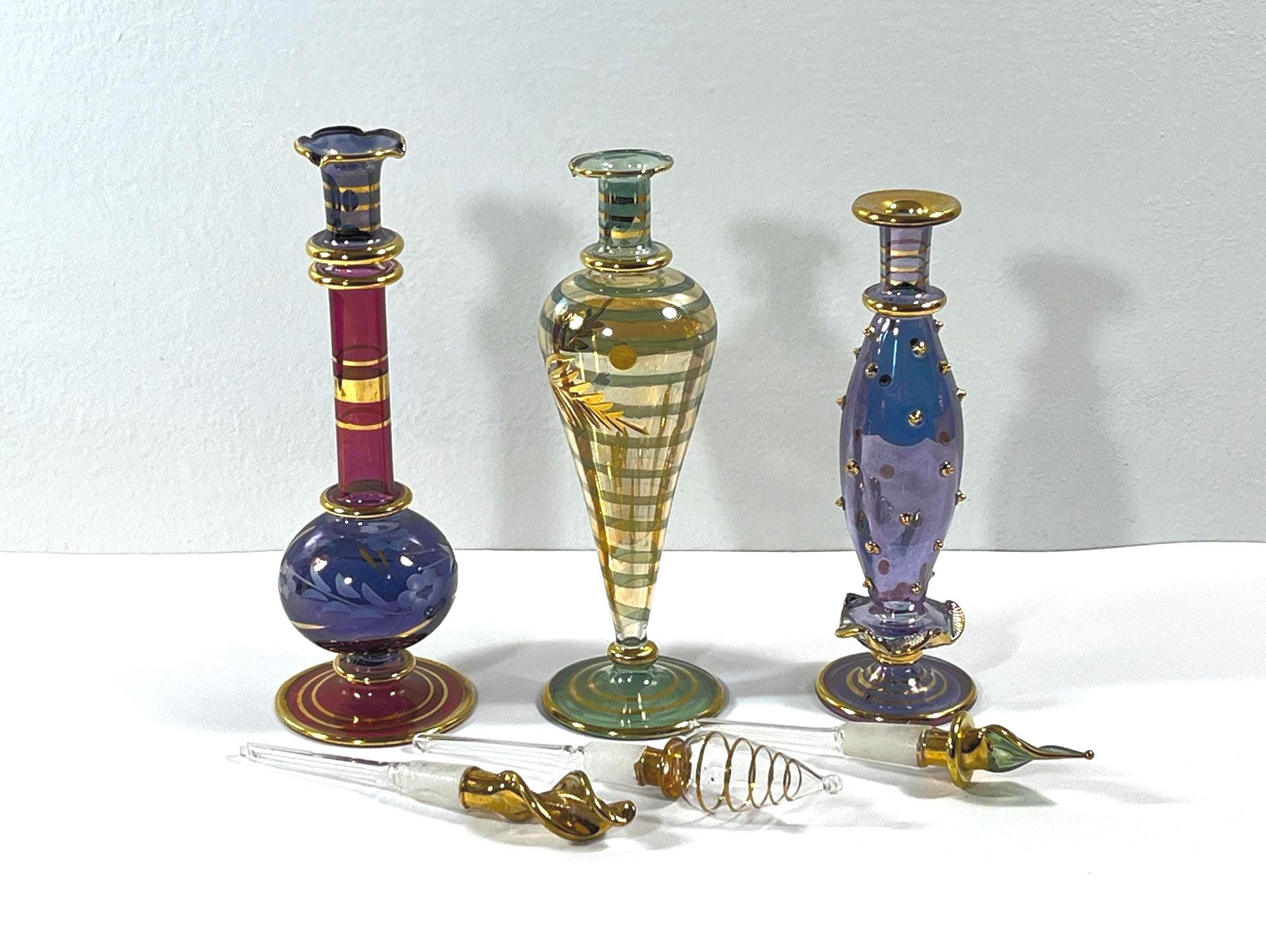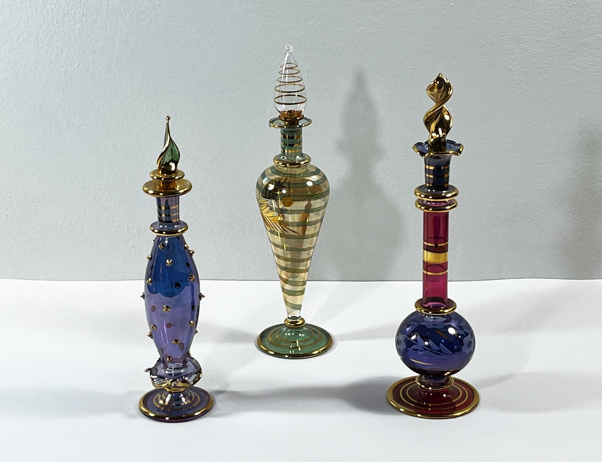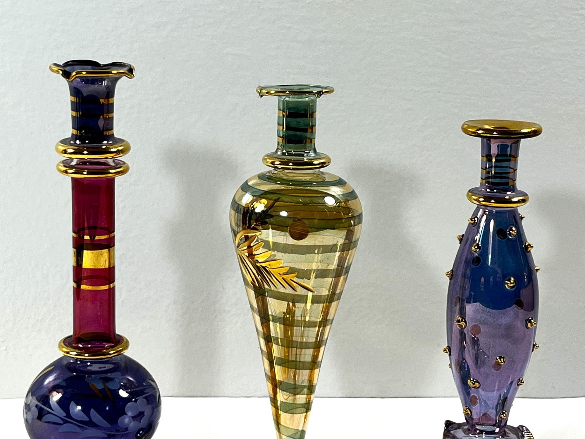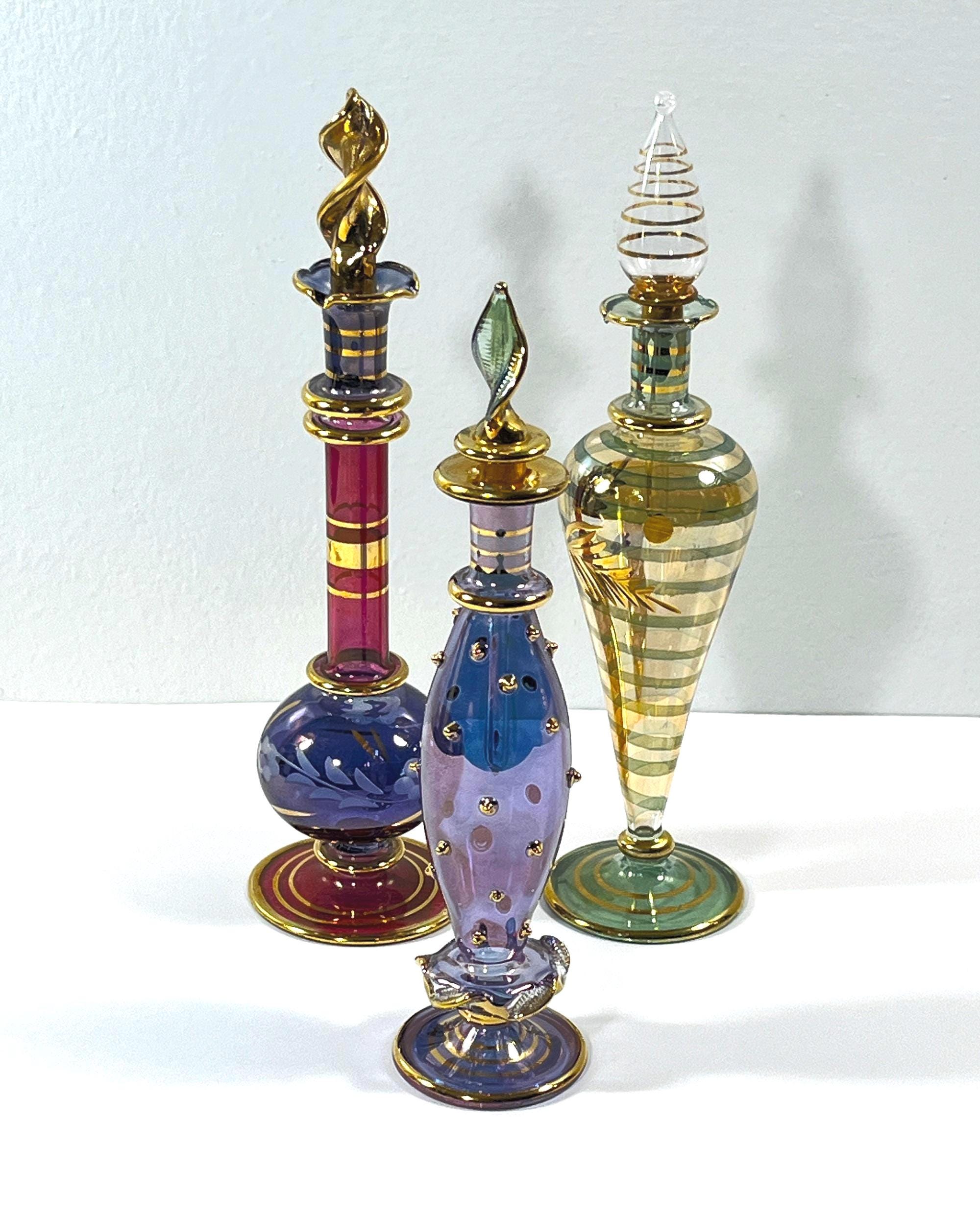 In old Cairo, Egypt Crafters and Glass Blowers Create Exquisite Works of Art. Each Piece is Individually Mouth-Blown of Pyrex Glass, Colored and has Gold leaf Accents Applied. Glass art has a Rich Cultural History and Been Found as Early as the New Kingdom (1550 – 1070 BC) in Ancient Egypt.