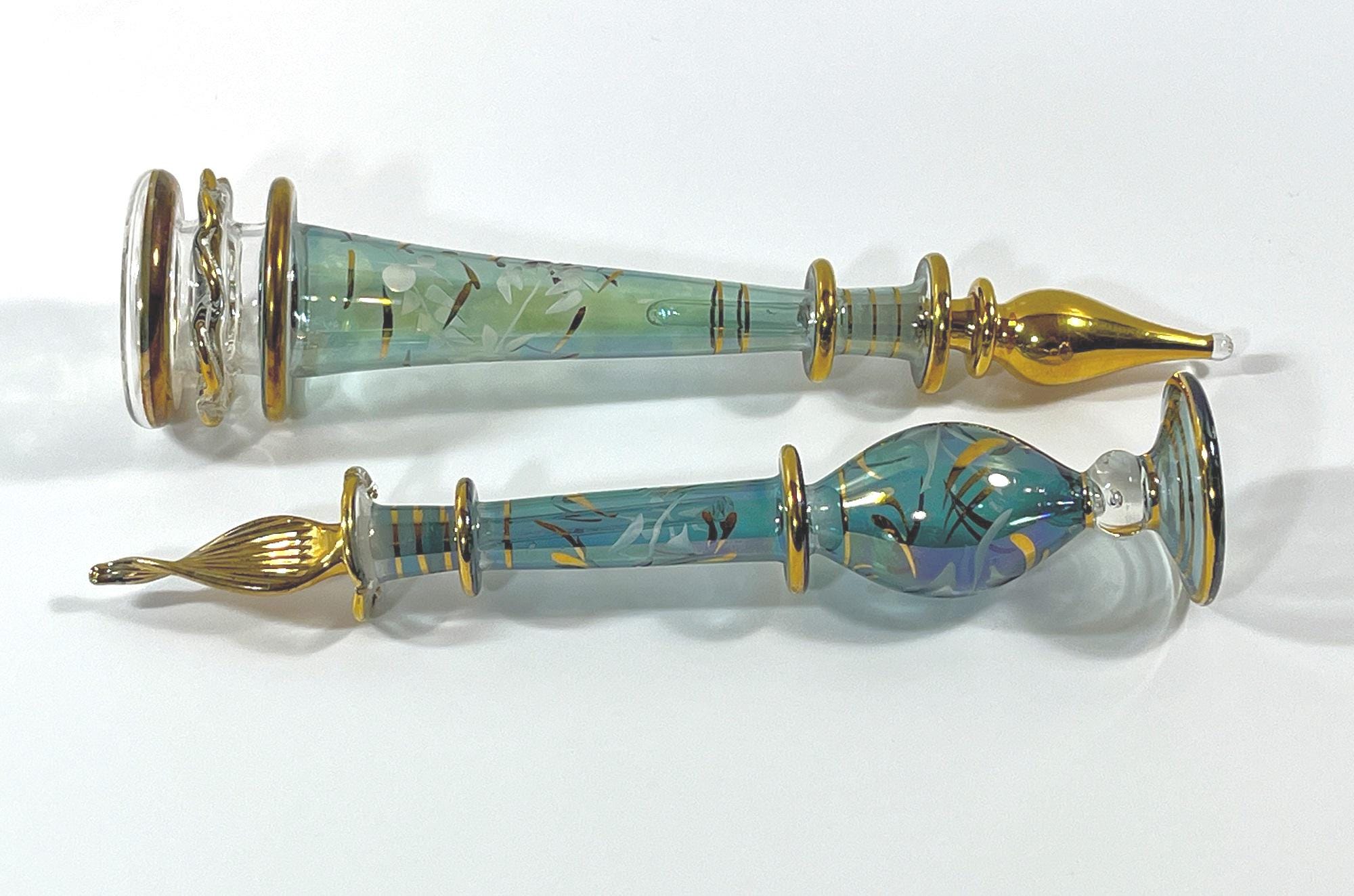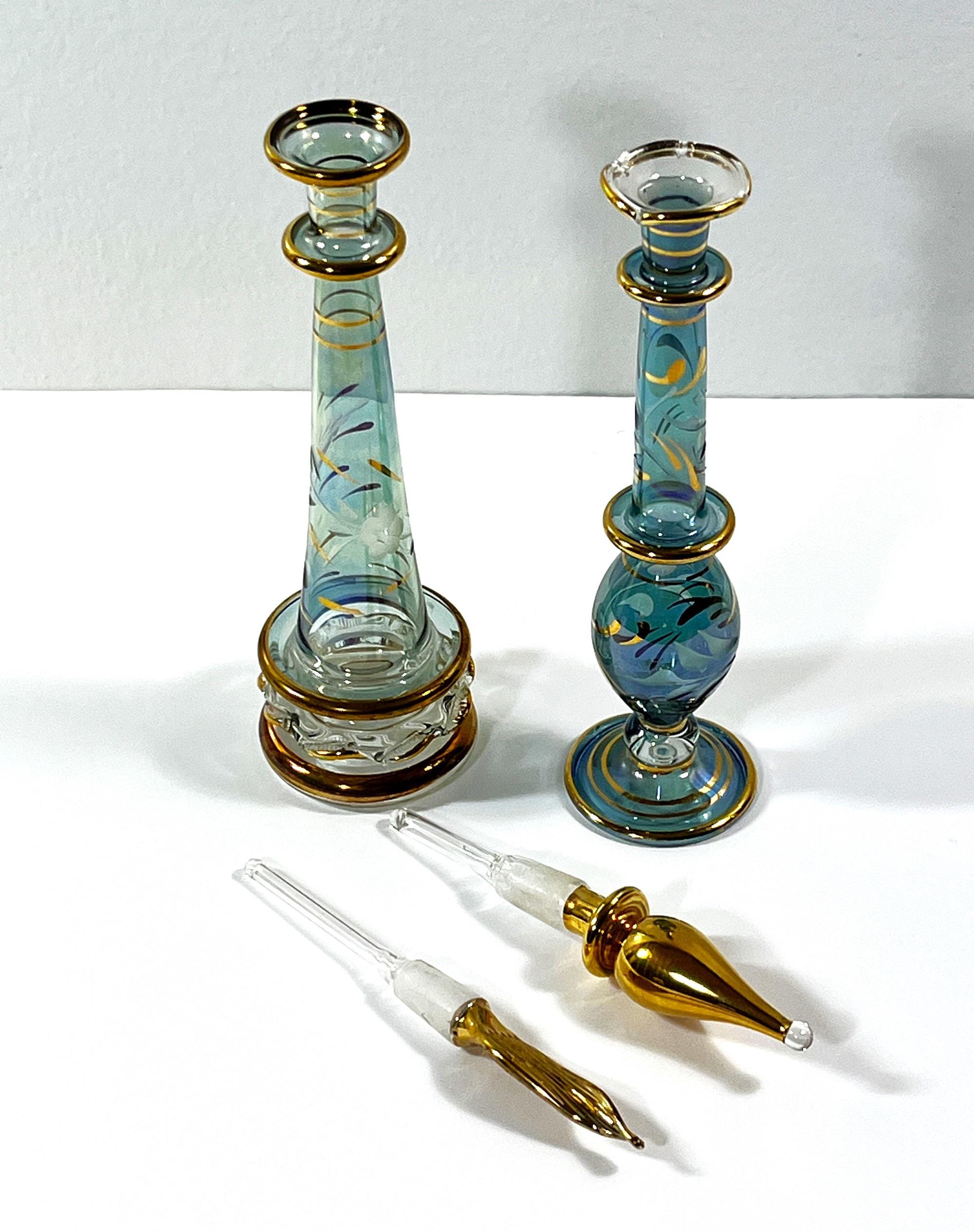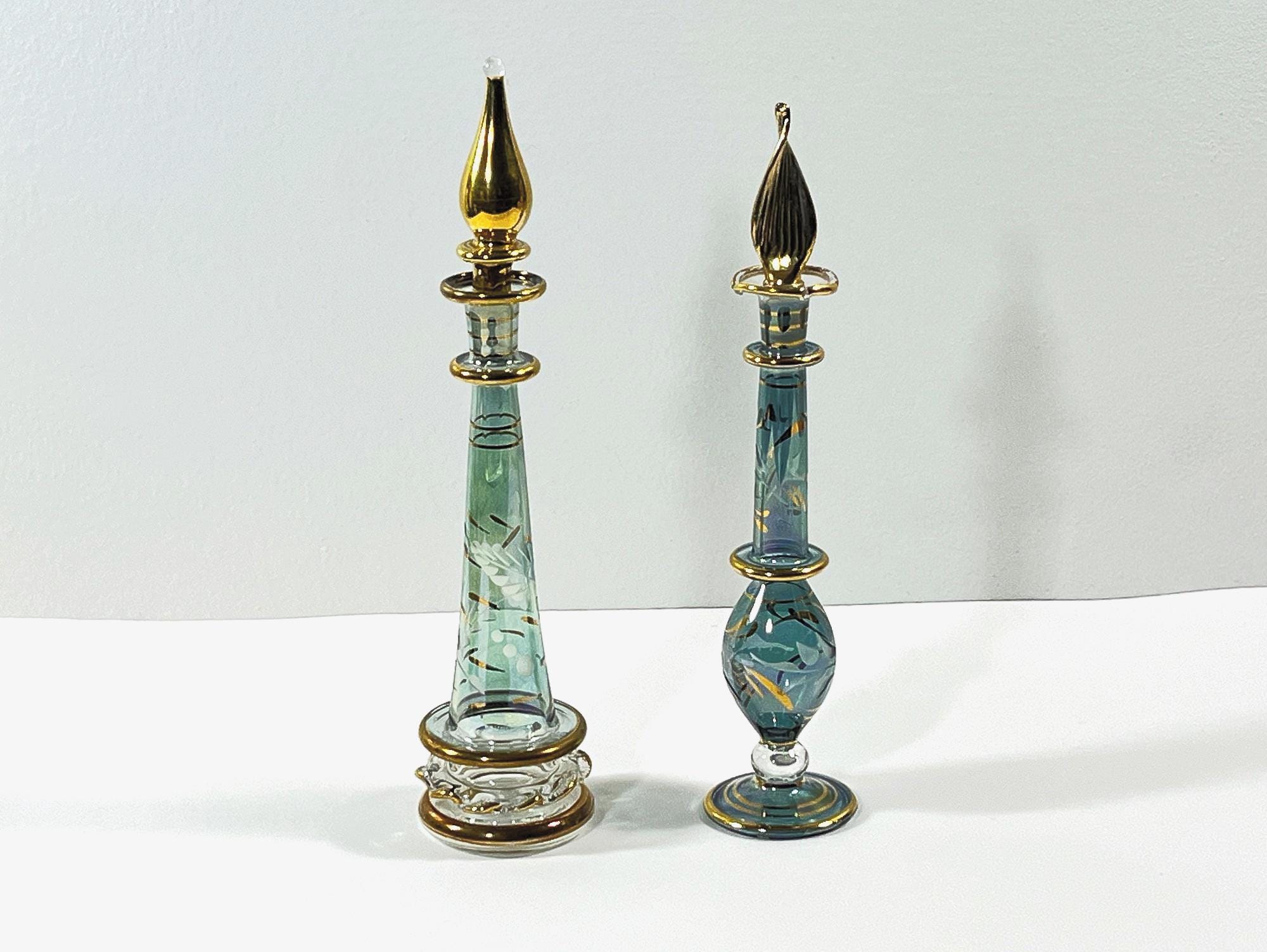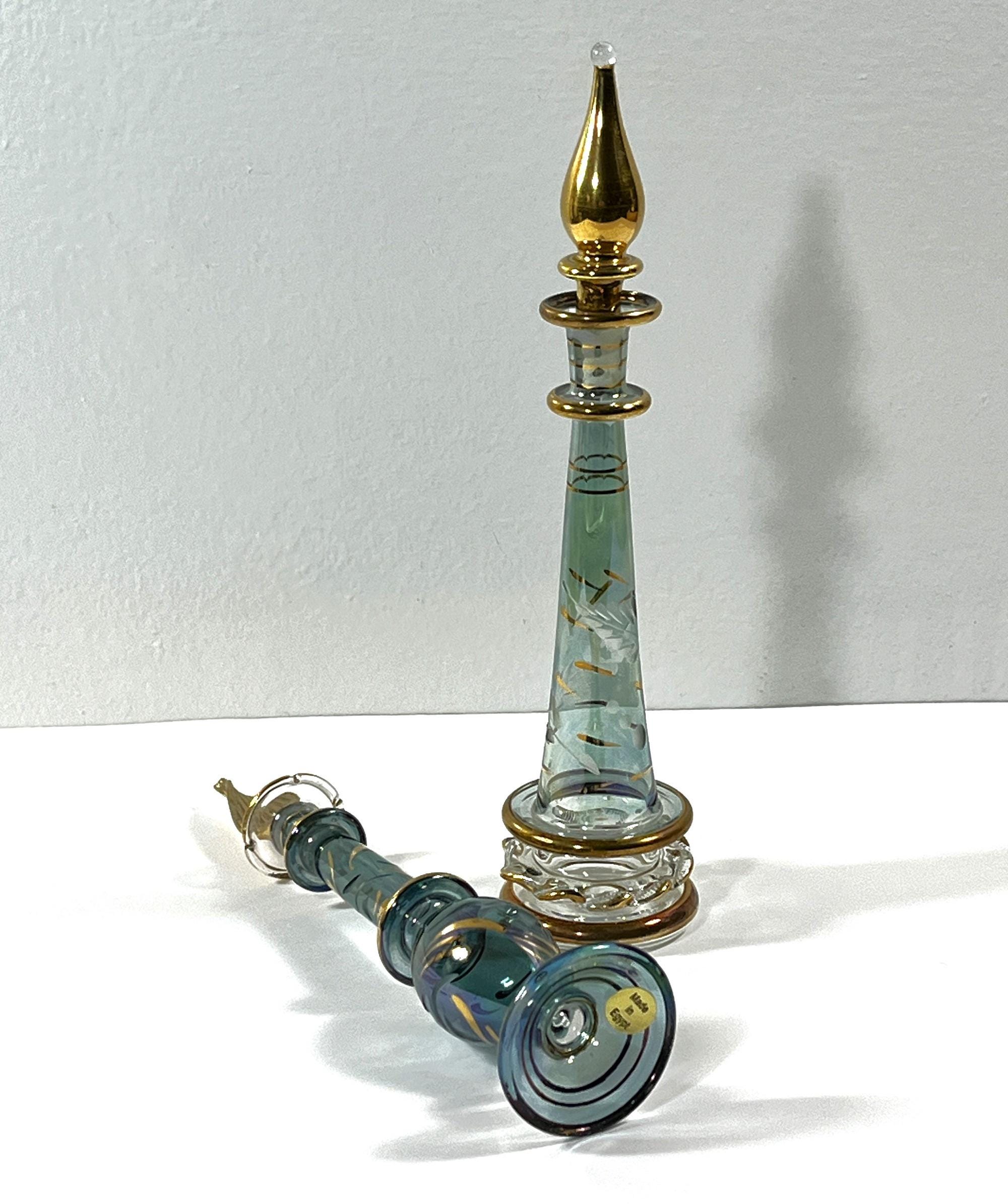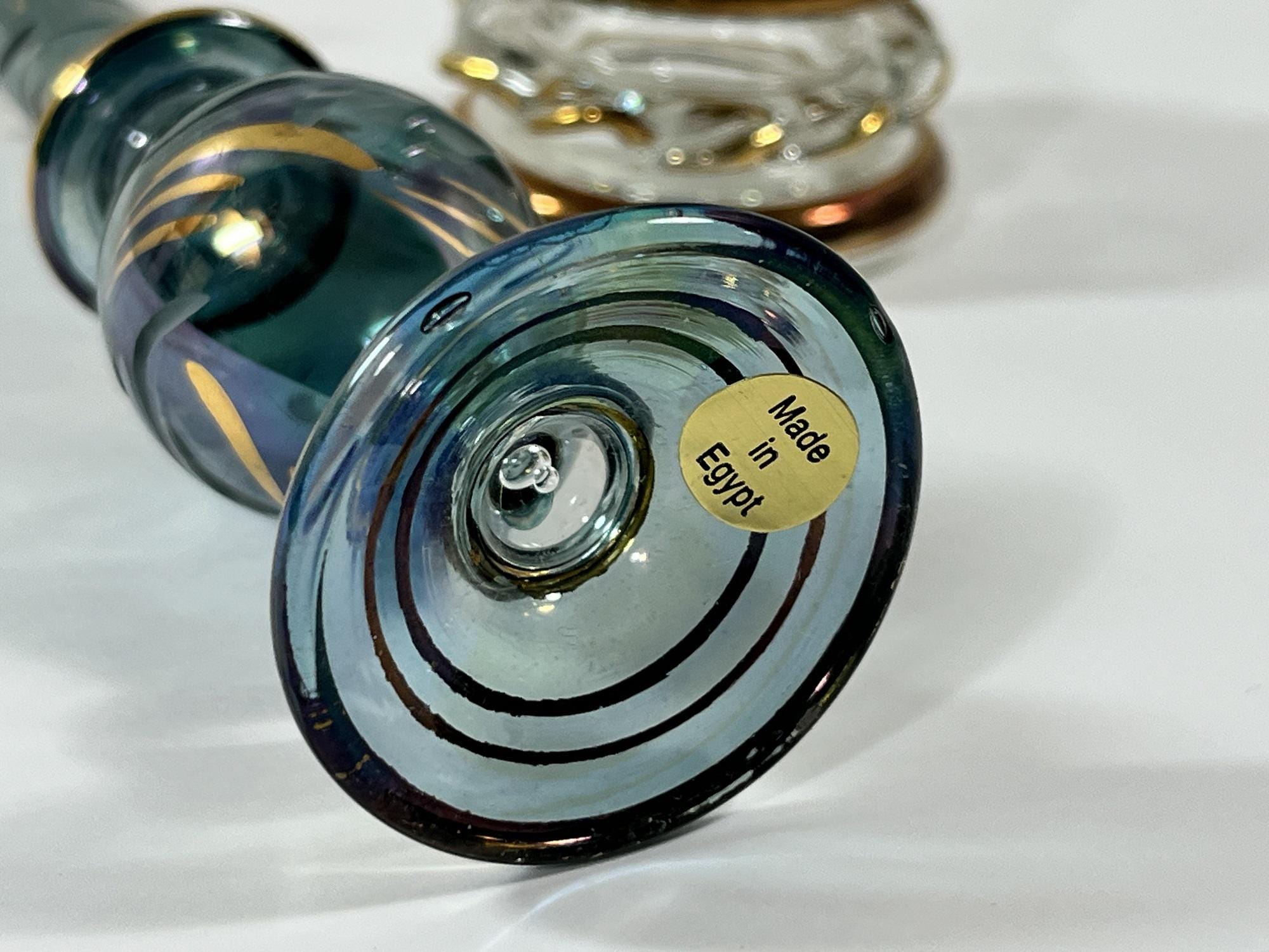 In old Cairo, Egypt Crafters and Glass Blowers Create Exquisite Works of Art. Each Piece is Individually Mouth-Blown of Pyrex Glass, Colored and has Gold leaf Accents Applied. Glass art has a Rich Cultural History and Been Found as Early as the New Kingdom (1550 – 1070 BC) in Ancient Egypt.