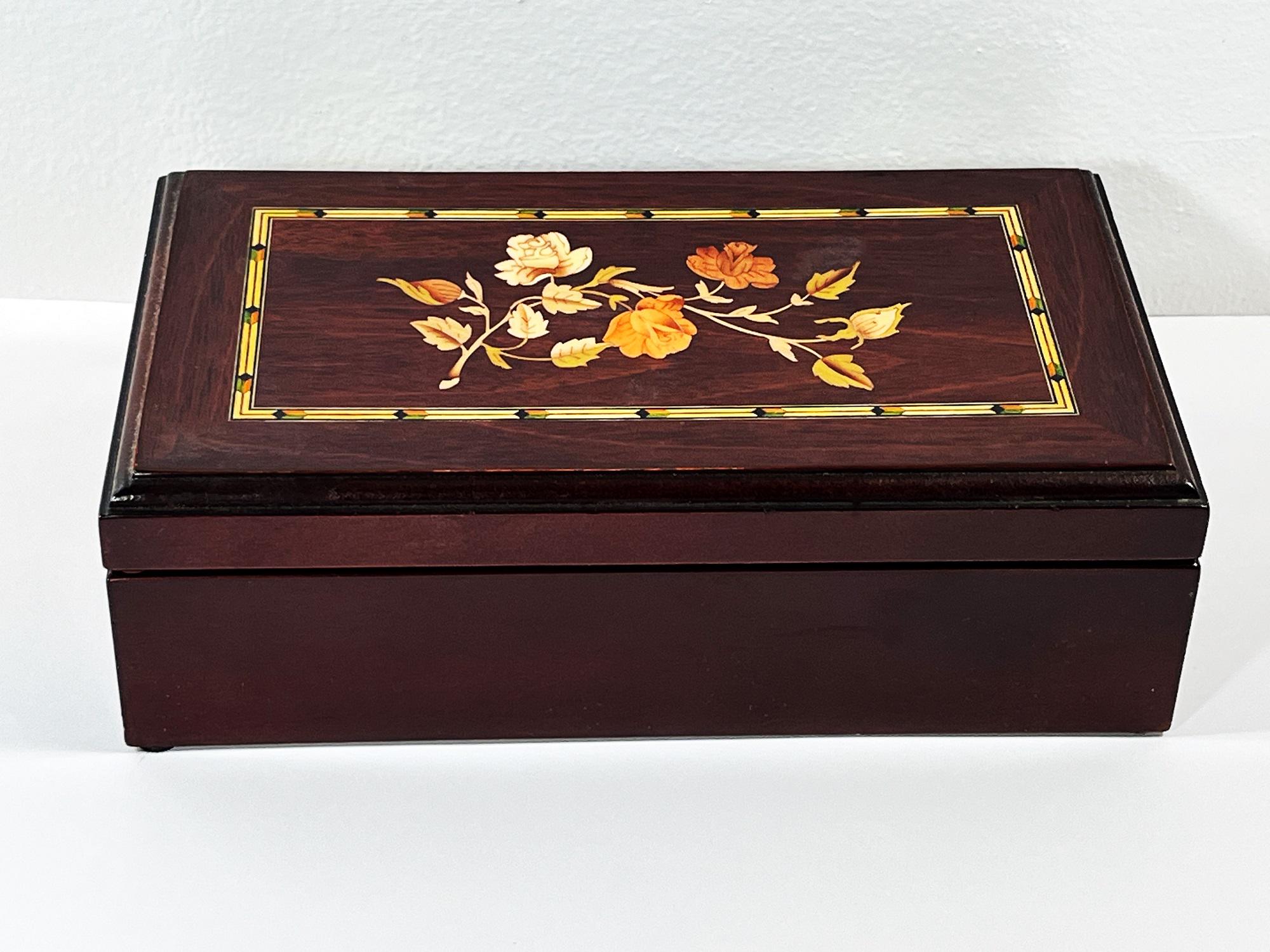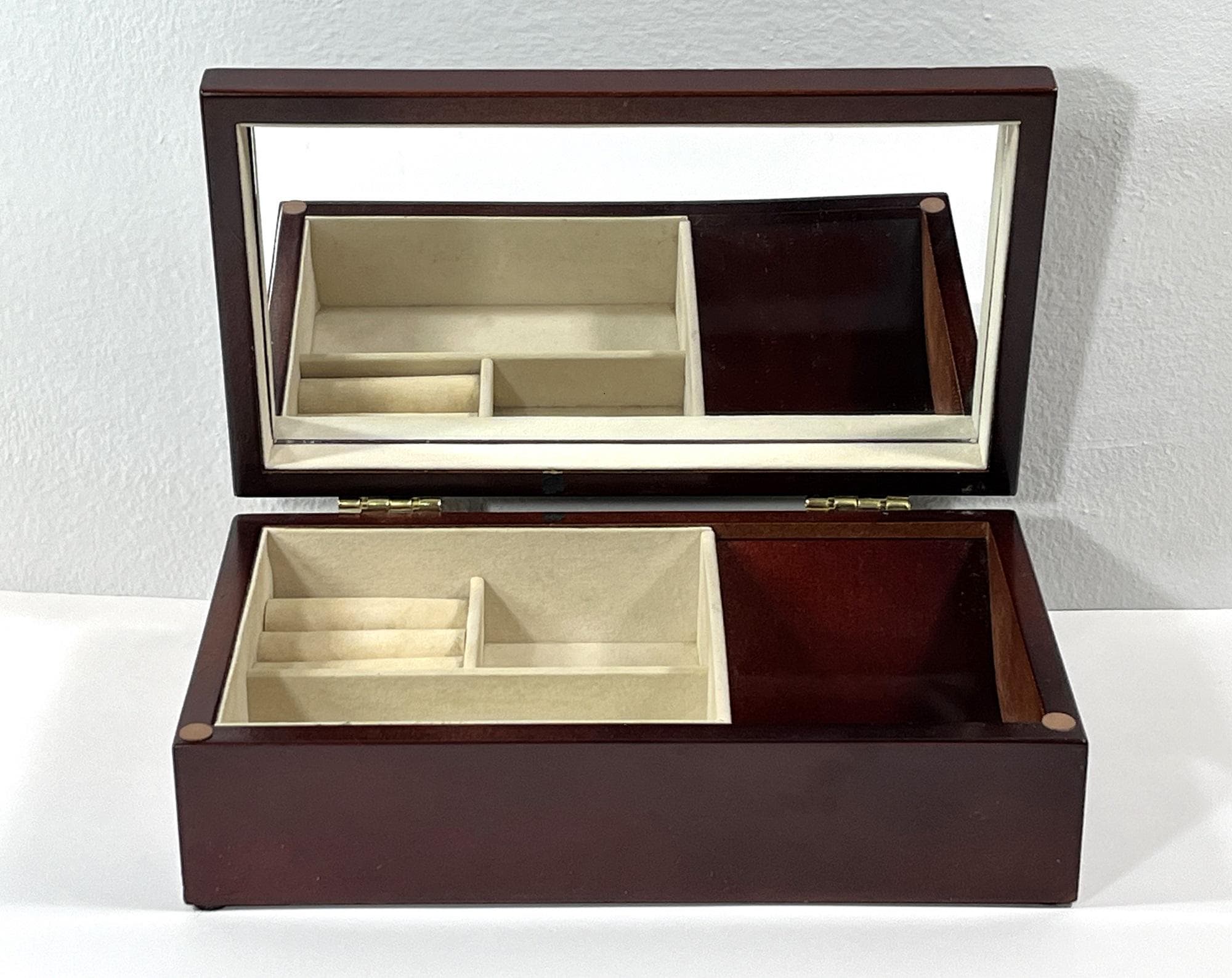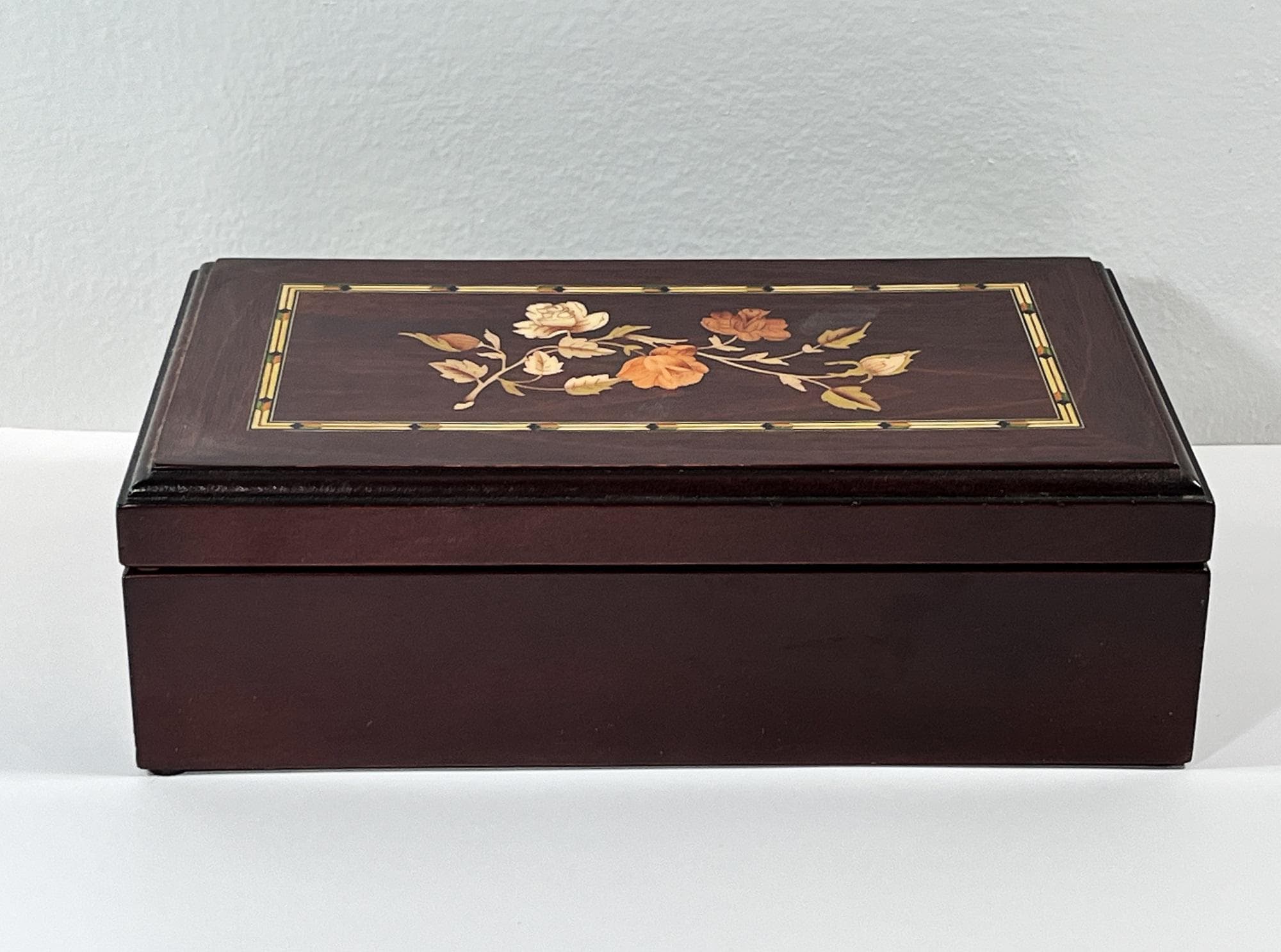 VINTAGE MAHOGANY WOOD FLORAL JEWELRY BOX. TAIWAN 1980's.