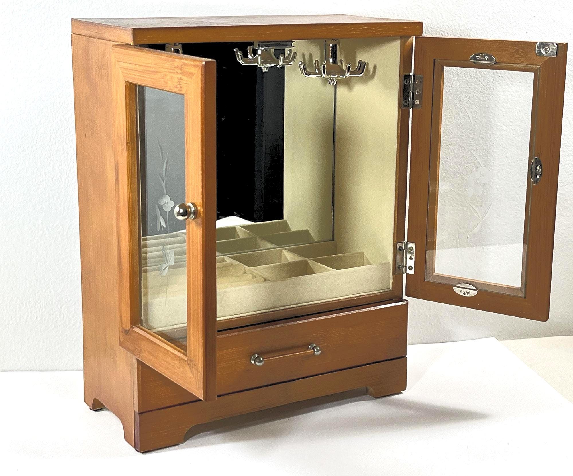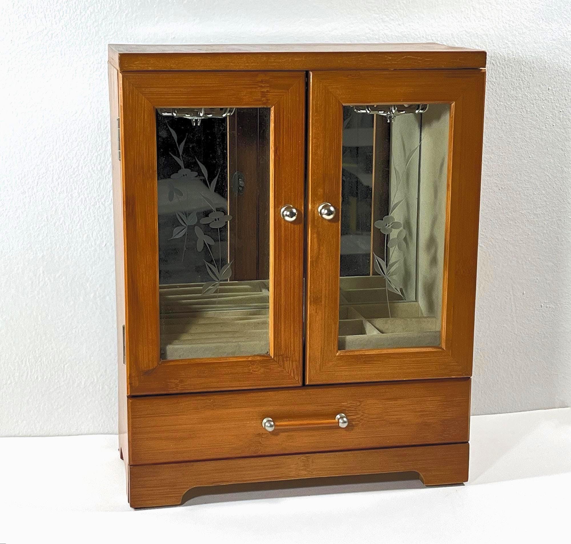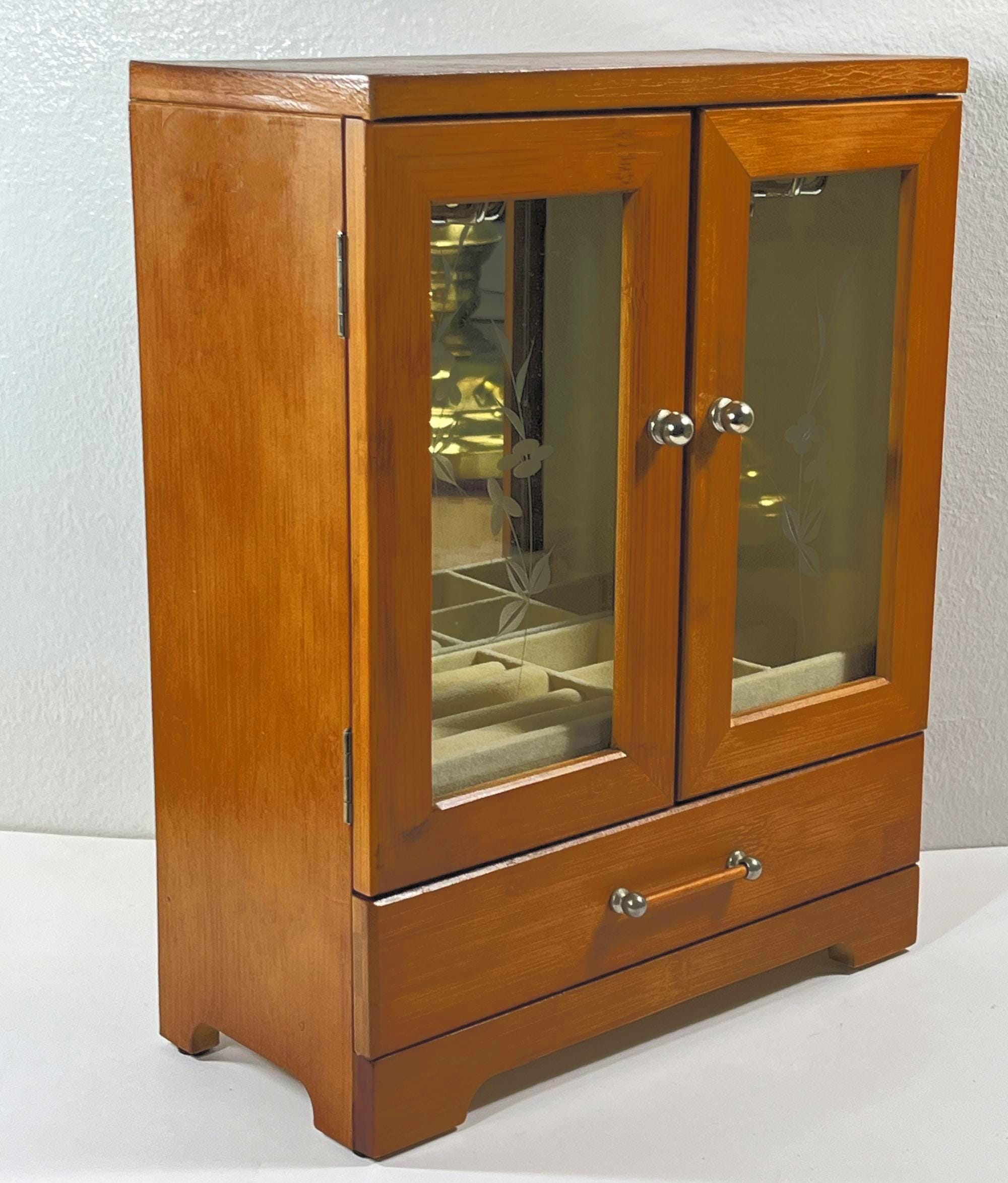 VINTAGE WOOD JEWELRY ARMOIRE. GOLDEN OAK FINISH