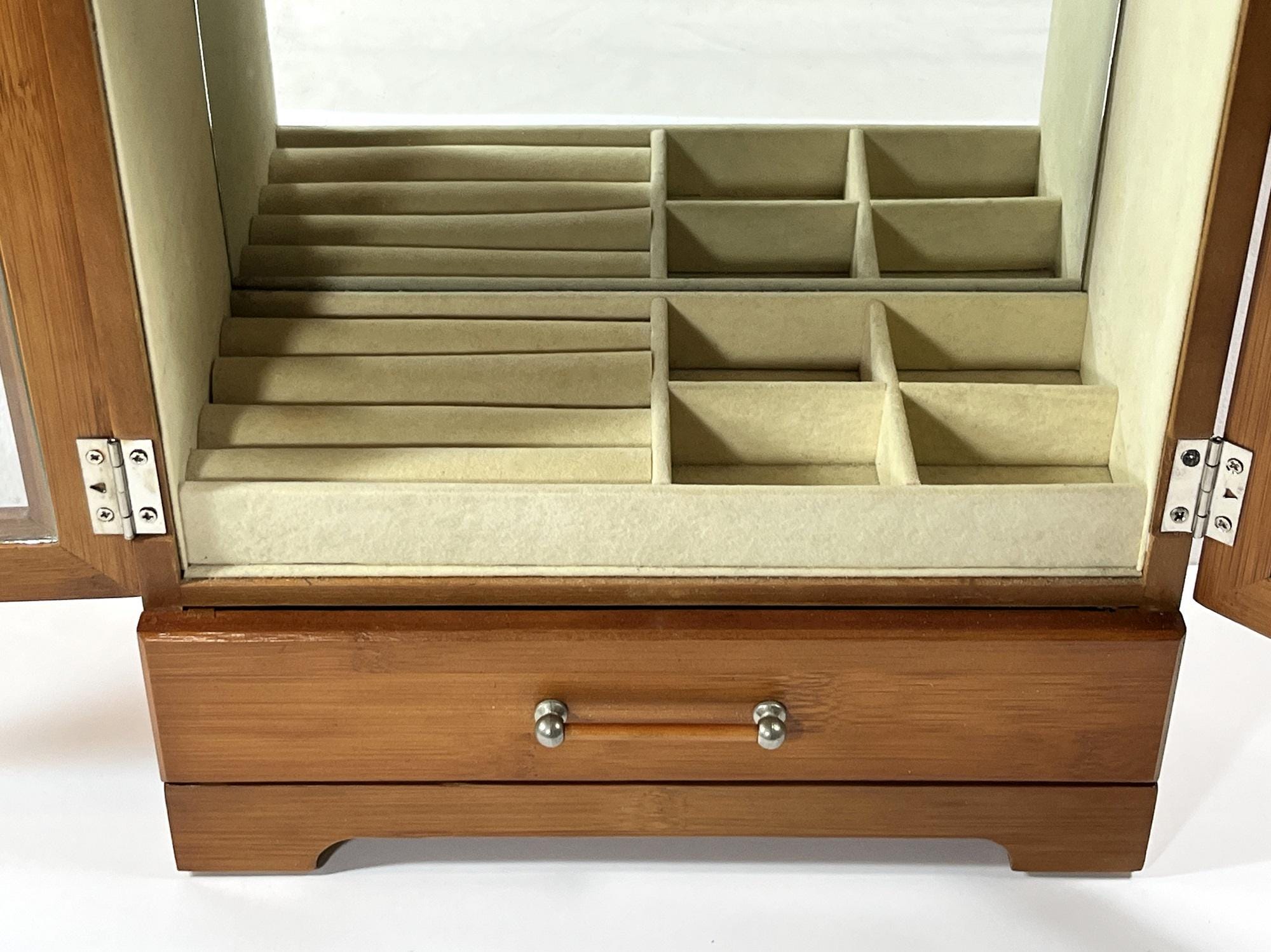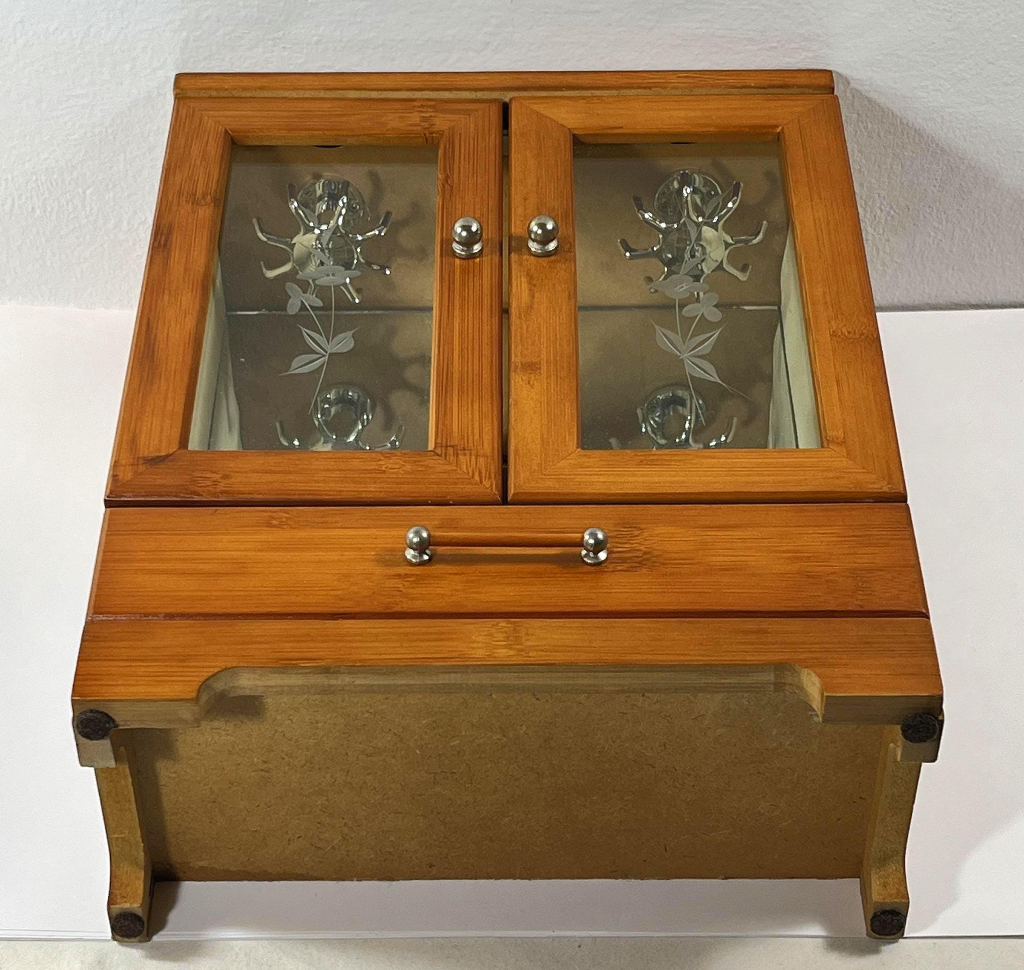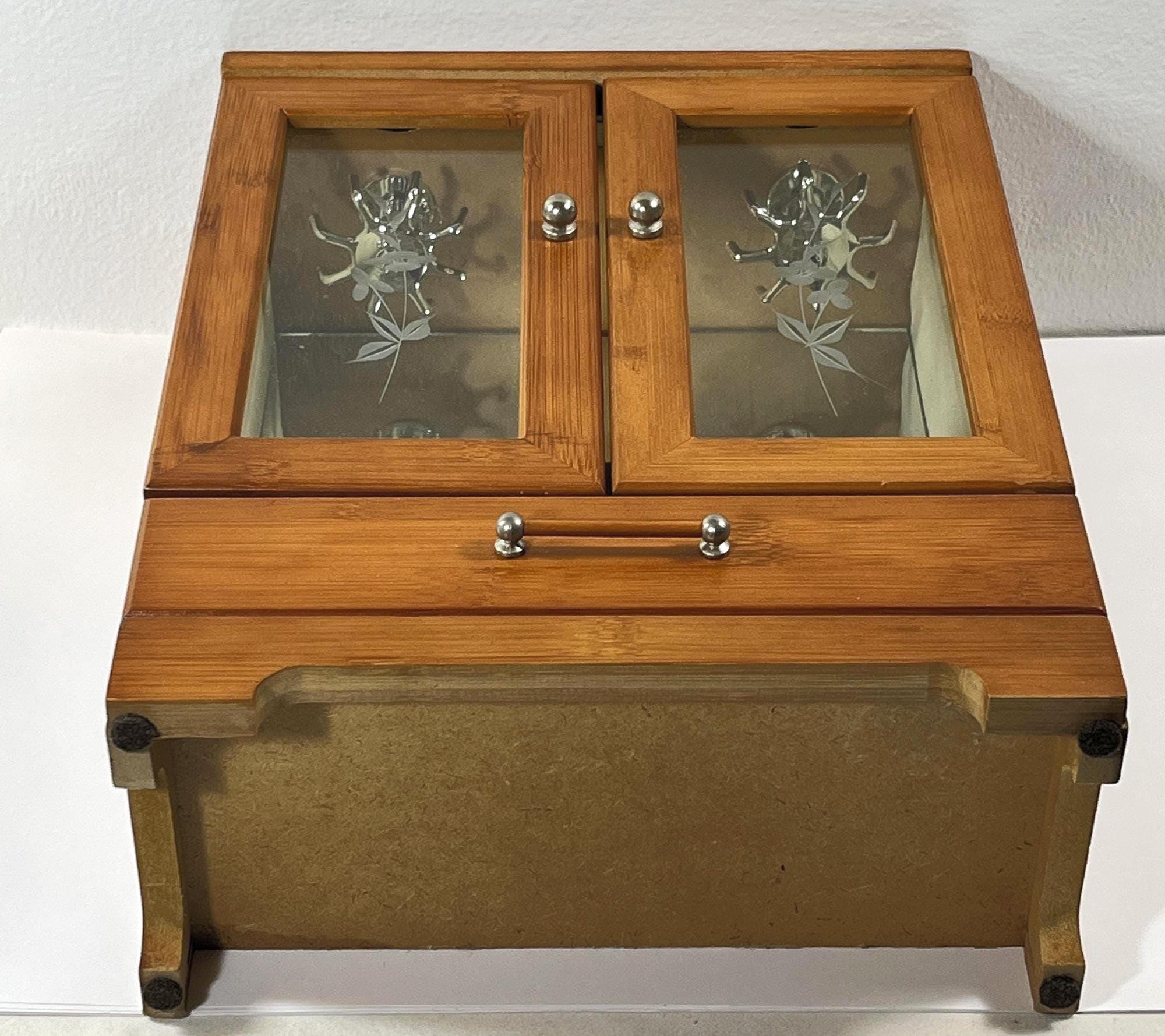 VINTAGE WOOD JEWELRY ARMOIRE. GOLDEN OAK FINISH