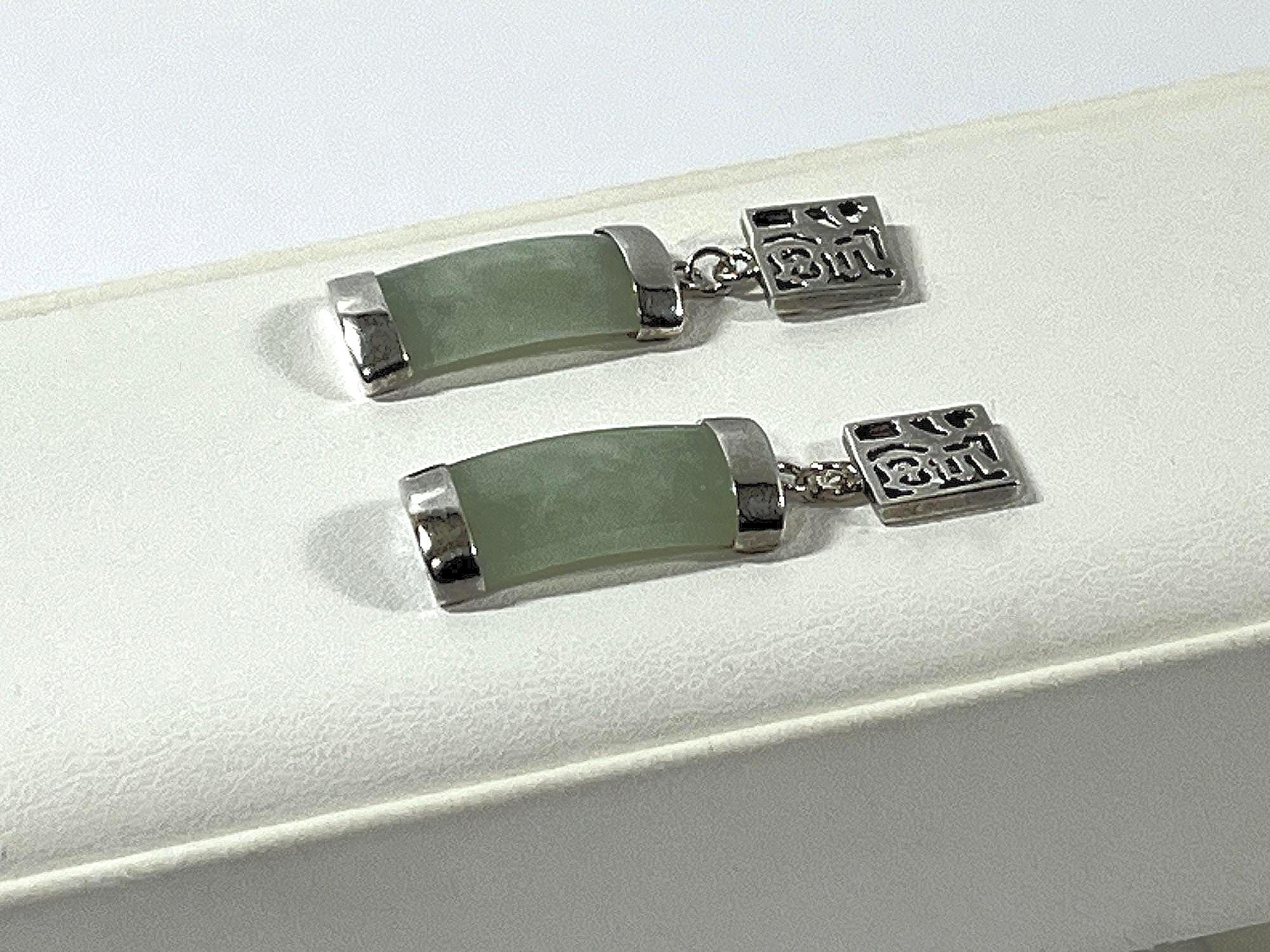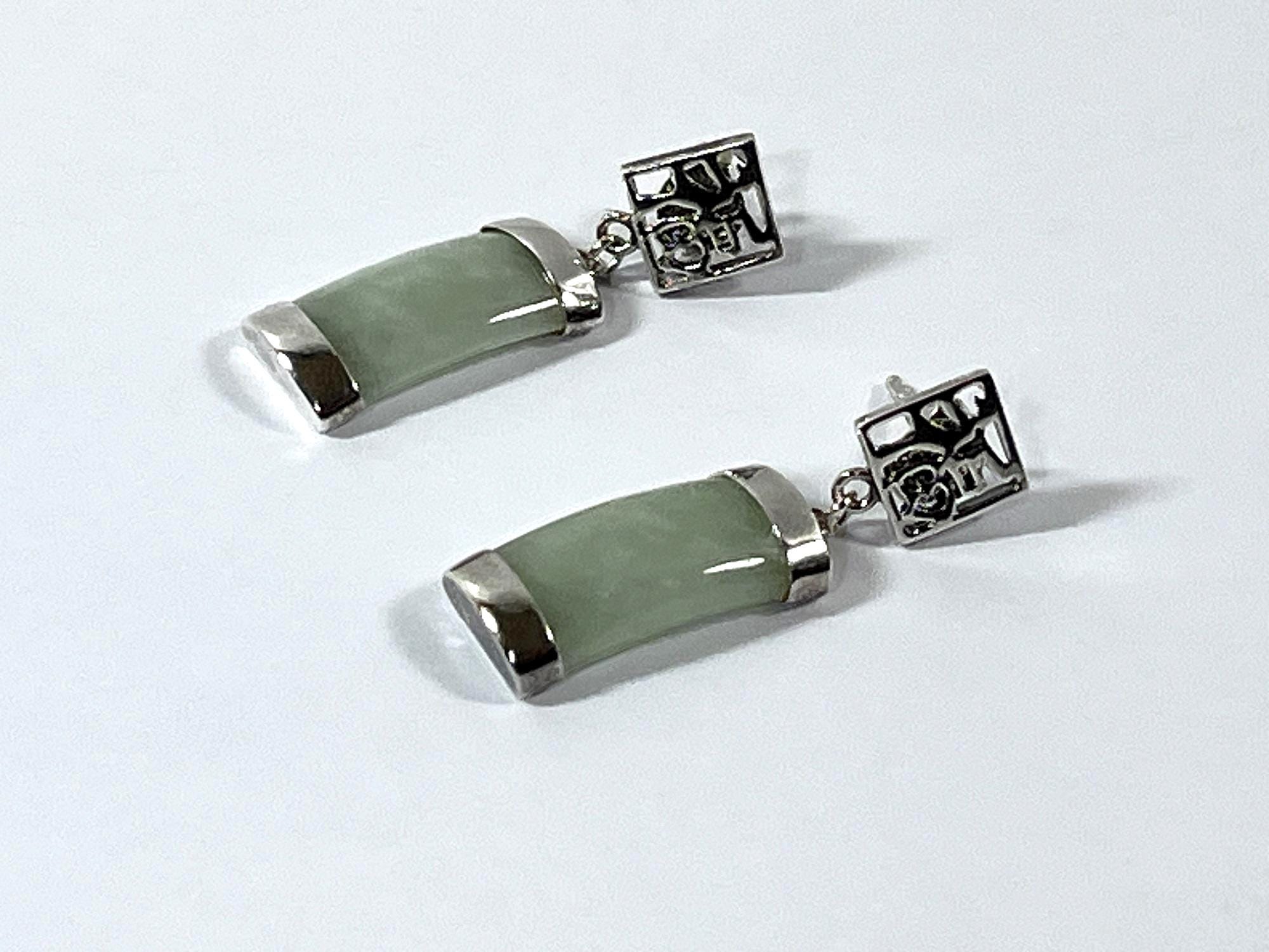 VINTAGE STERLING SILVER & LIGHT GREEN JADE GEMSTONE DANGLE EARRINGS.