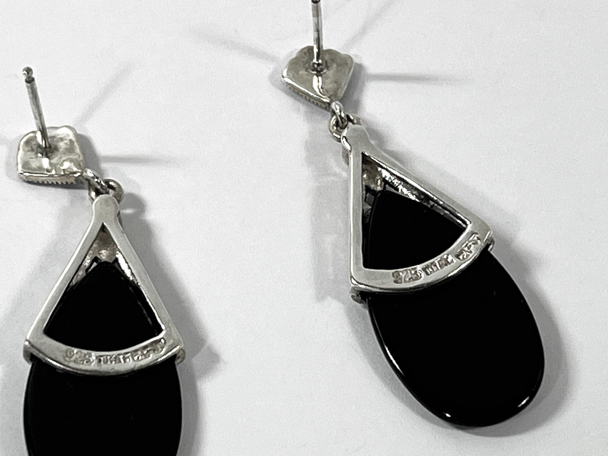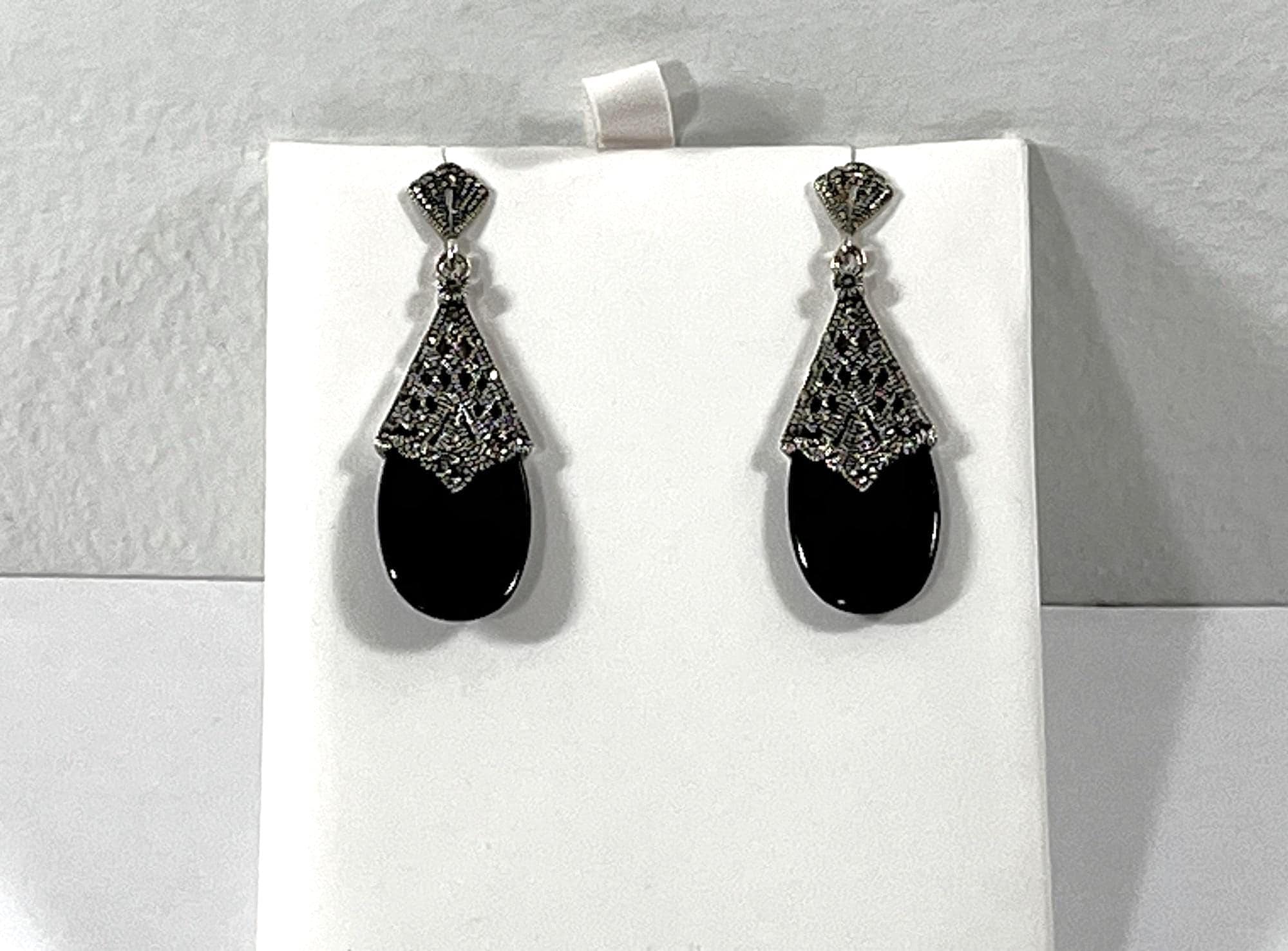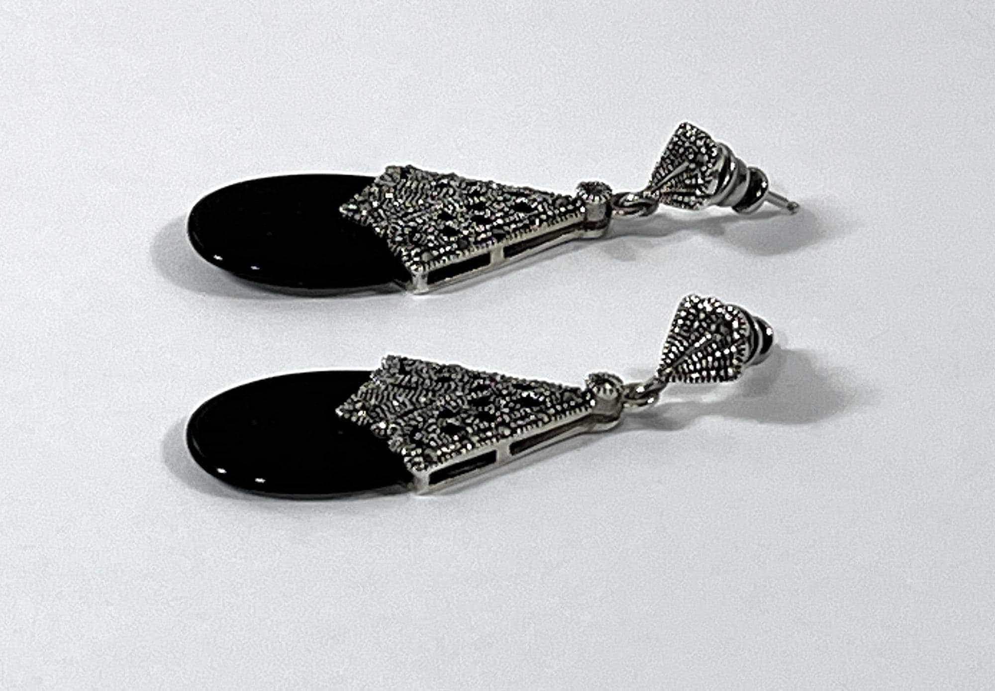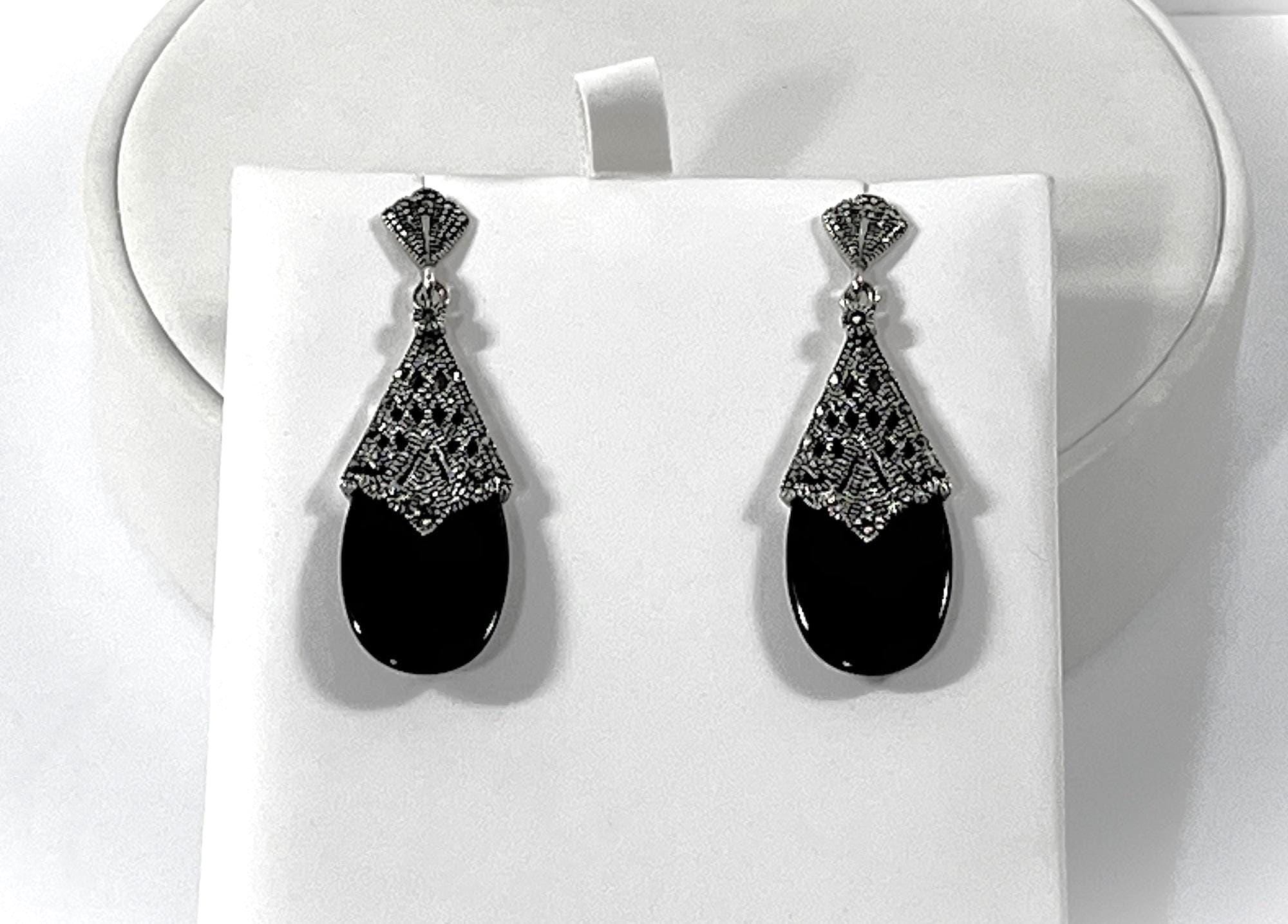 VINTAGE STERLING SILVER BLACK ONYX & MARCASITE DANGLE EARRINGS.