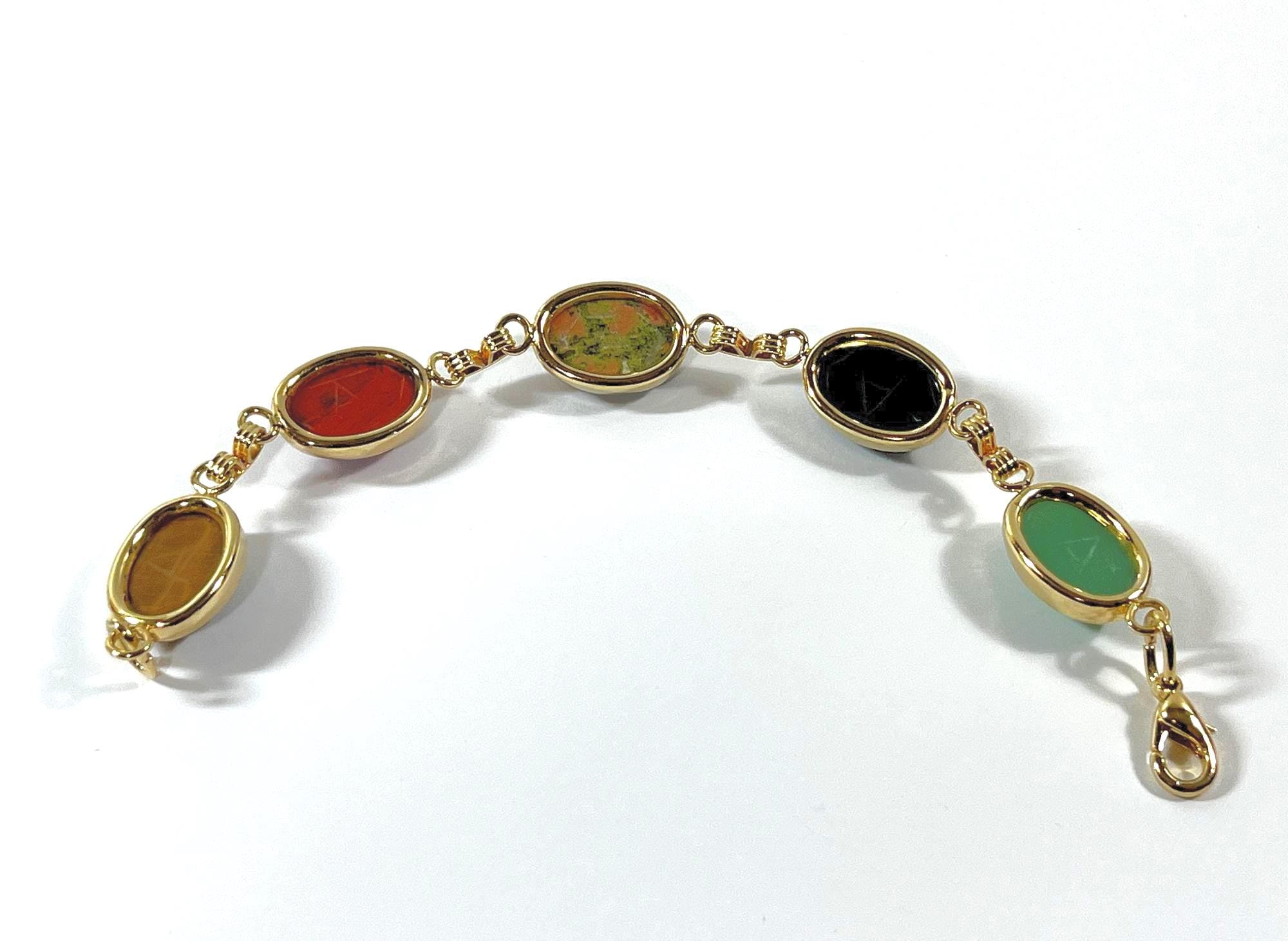 - GEMS: GREEN JADE, RED CORAL, TIGER's EYE, UNAKITE AND BLACK ONYX.