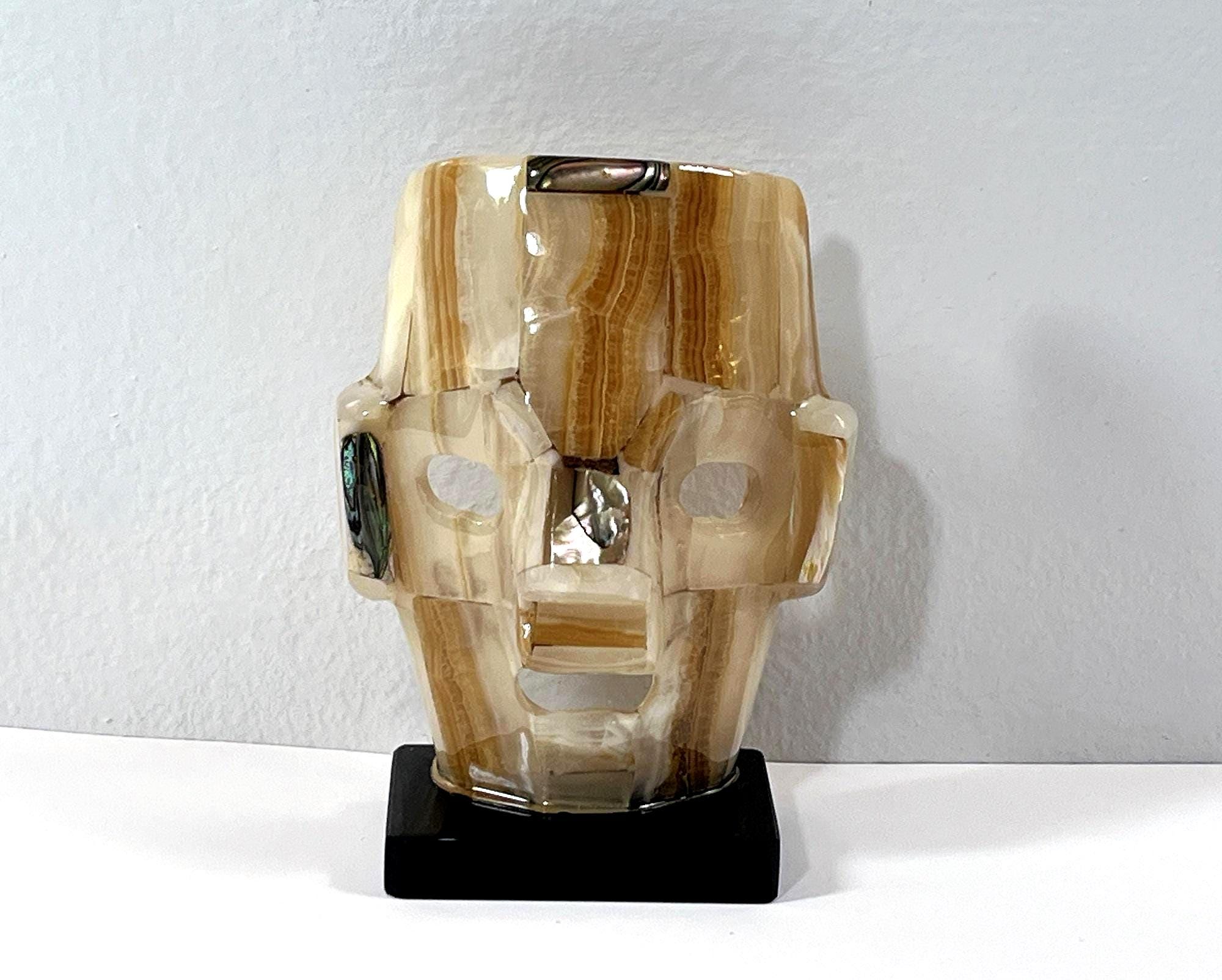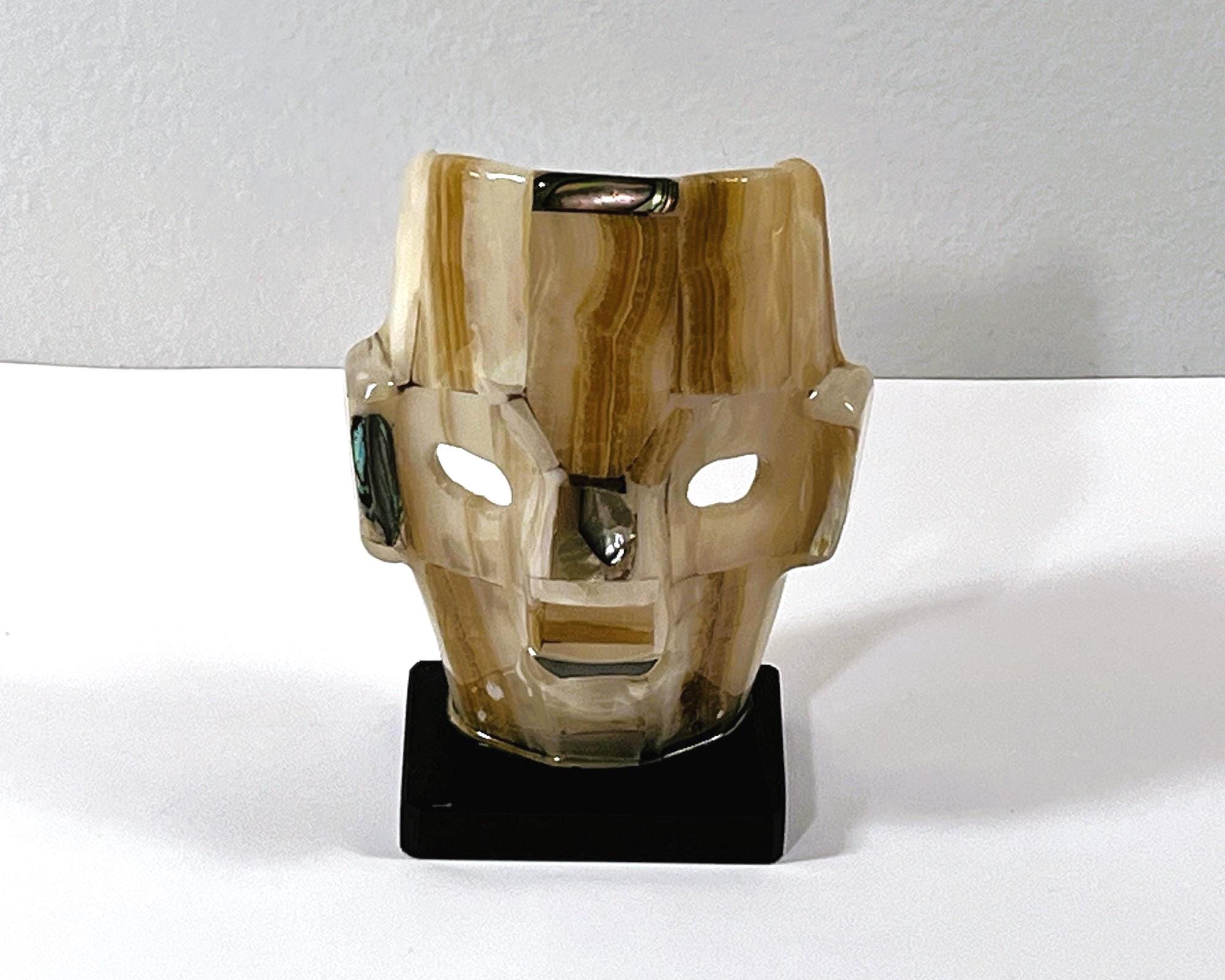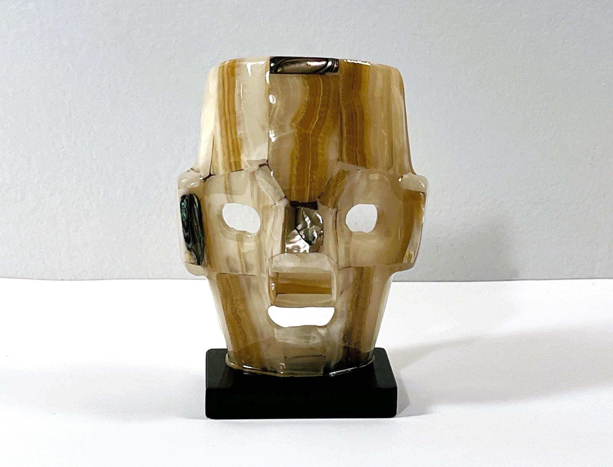 VINTAGE MAYAN AZTEC INCA BURIAL GEMSTONE SMALL FACE MASK ON STAND.