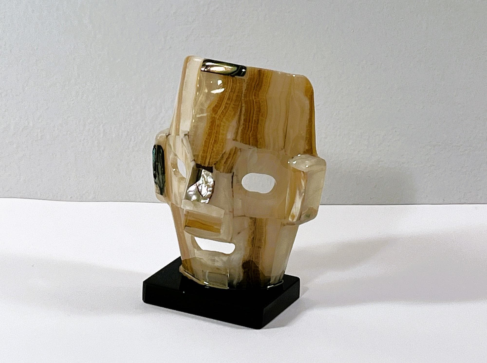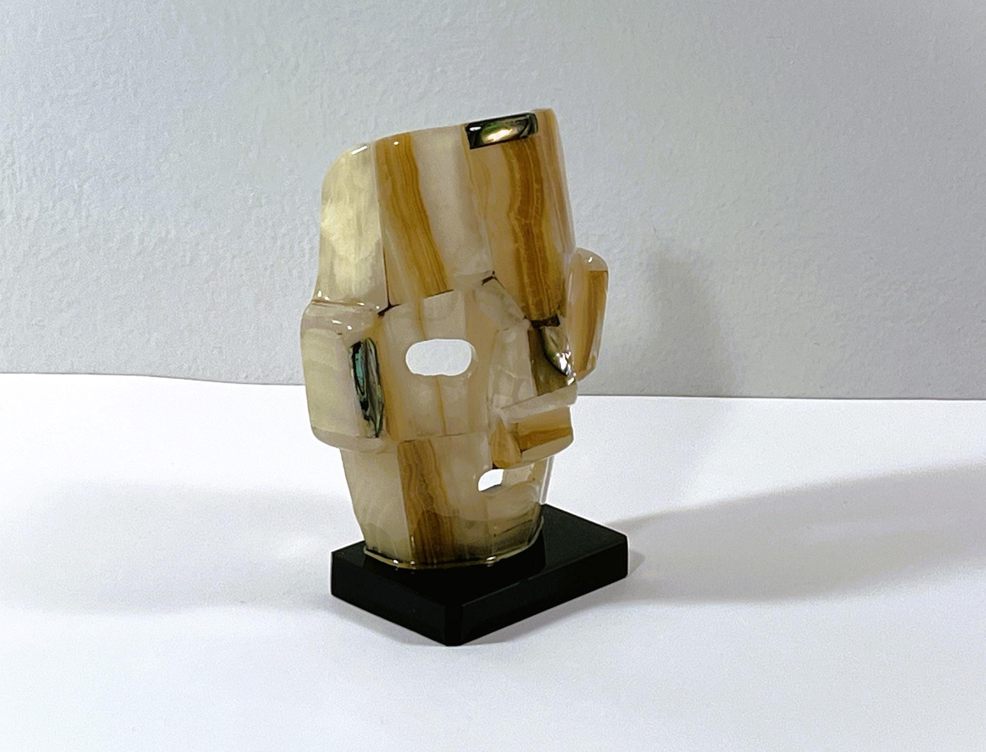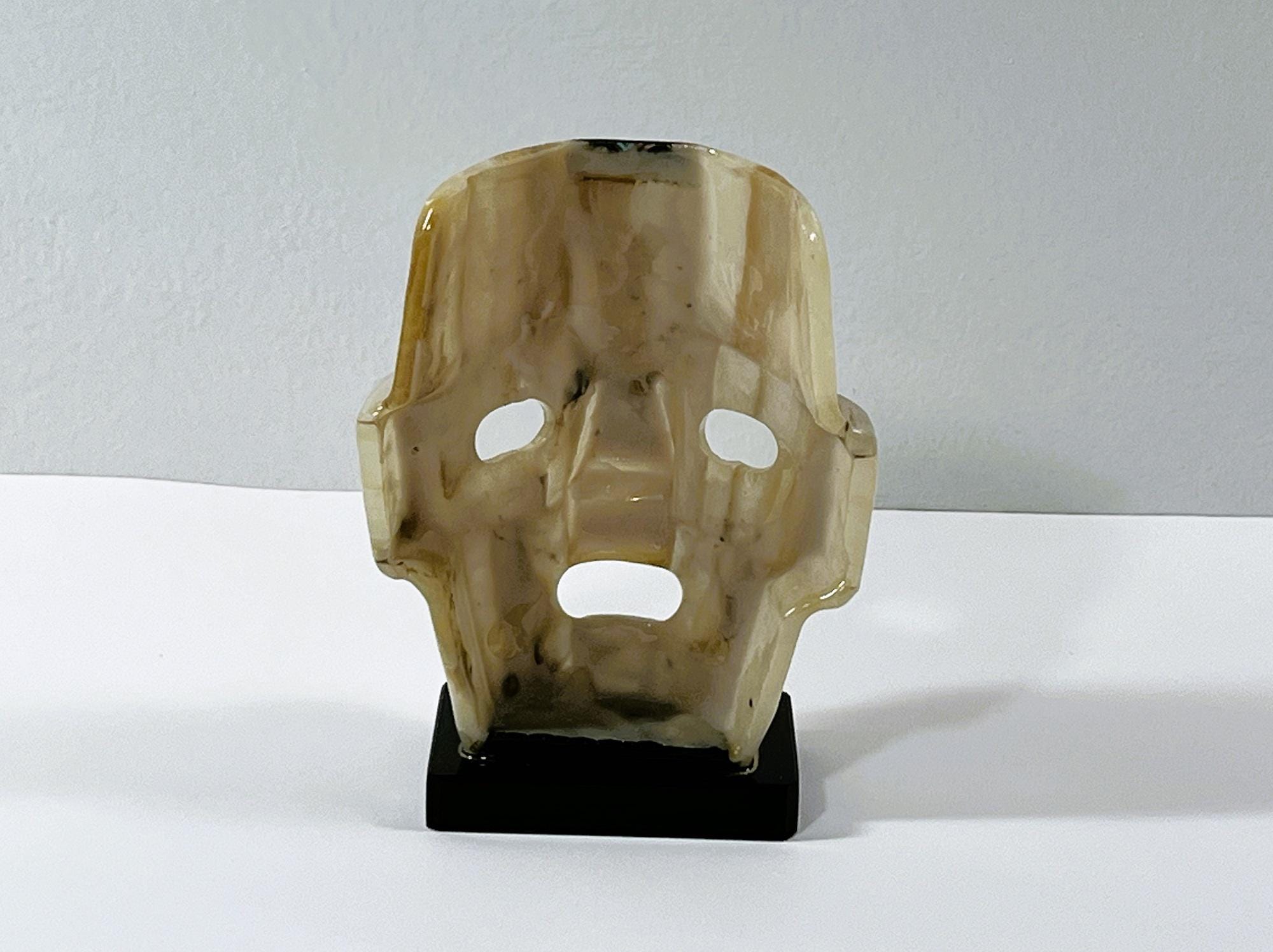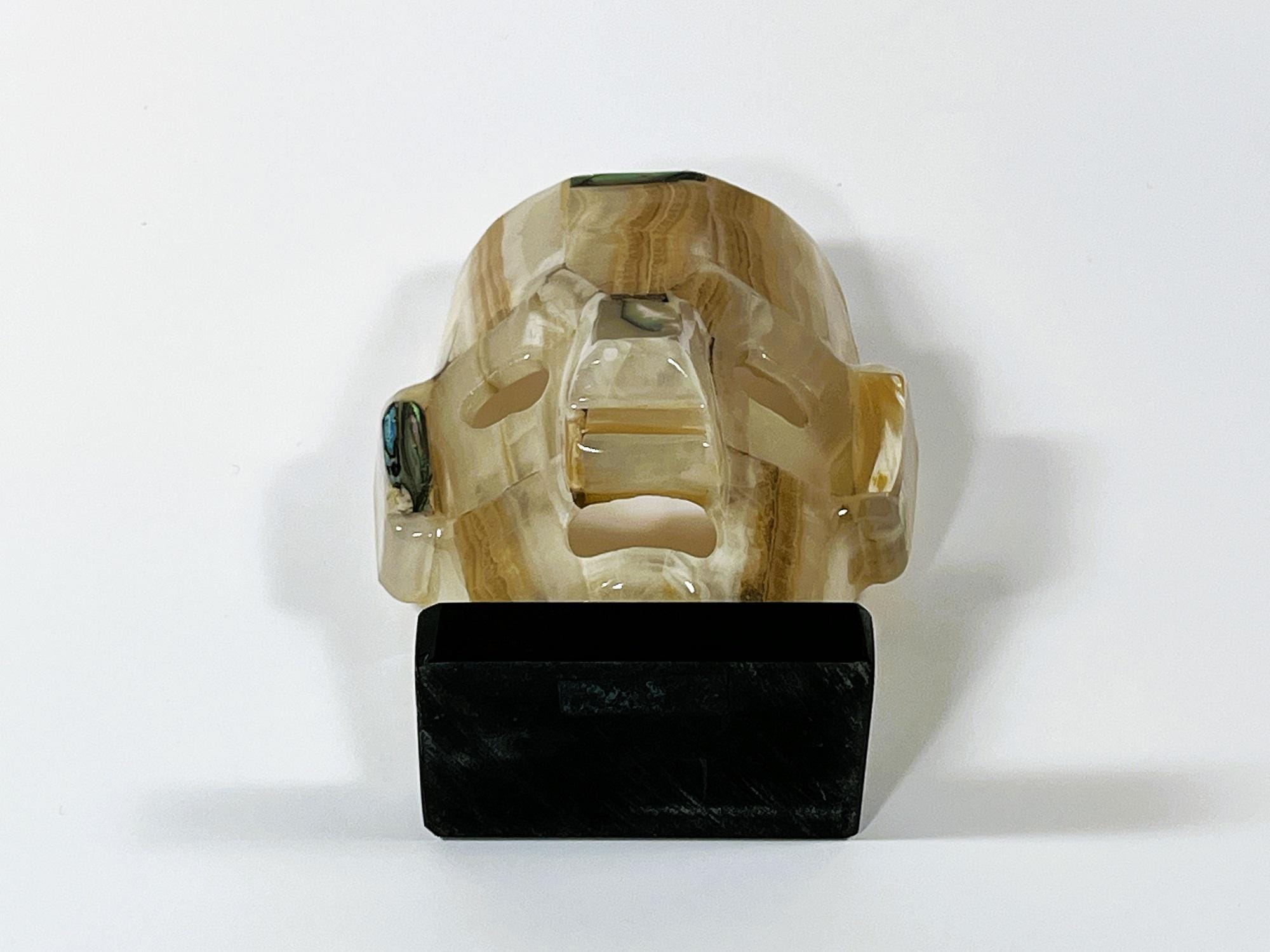 VINTAGE MAYAN AZTEC INCA BURIAL GEMSTONE SMALL FACE MASK ON STAND.