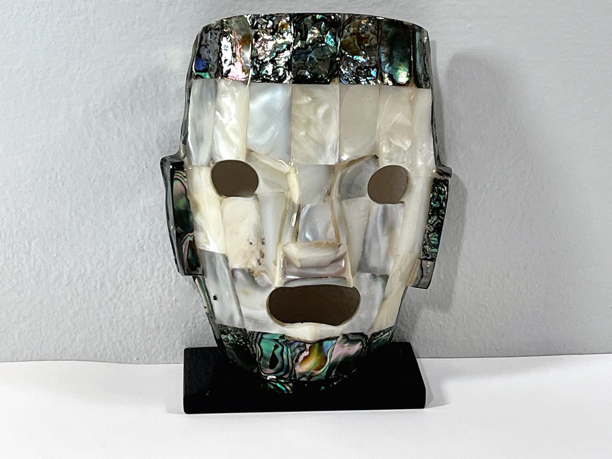 VINTAGE MAYAN AZTEC INCA BURIAL GEMSTONE FACE MASK ON STAND.