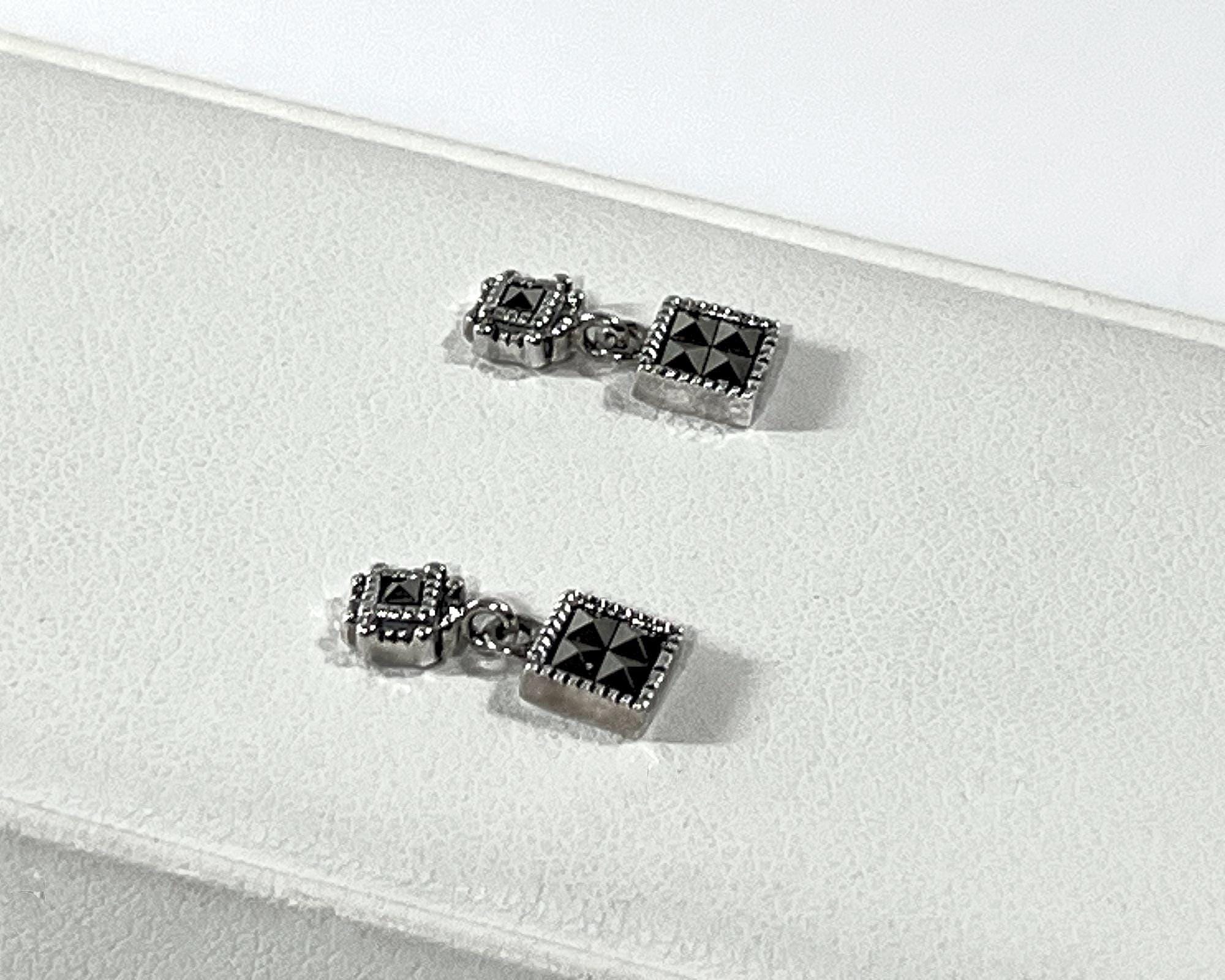 - SQUARE CUT MARCASITE, ORNATE BEADED BEZEL.