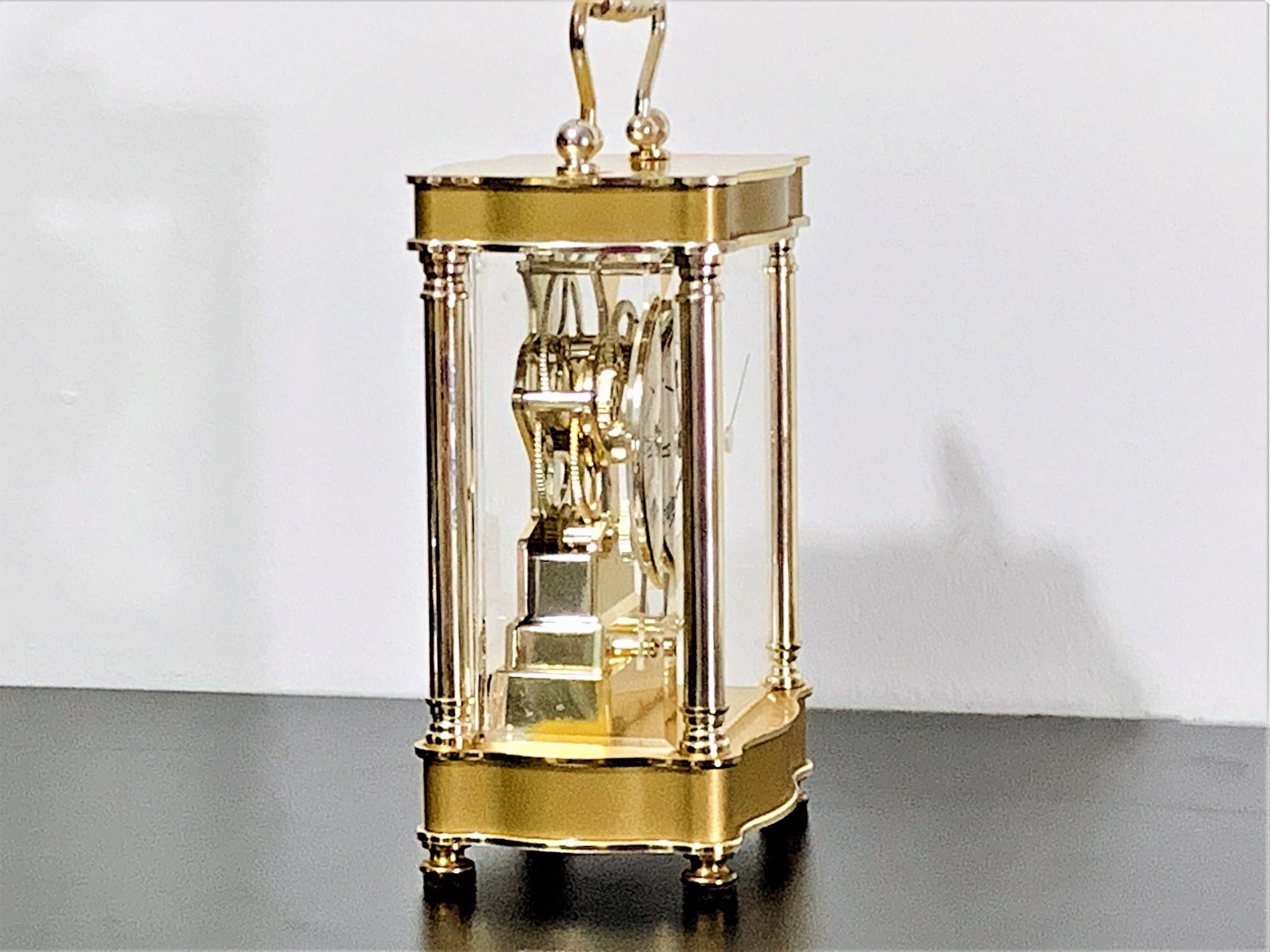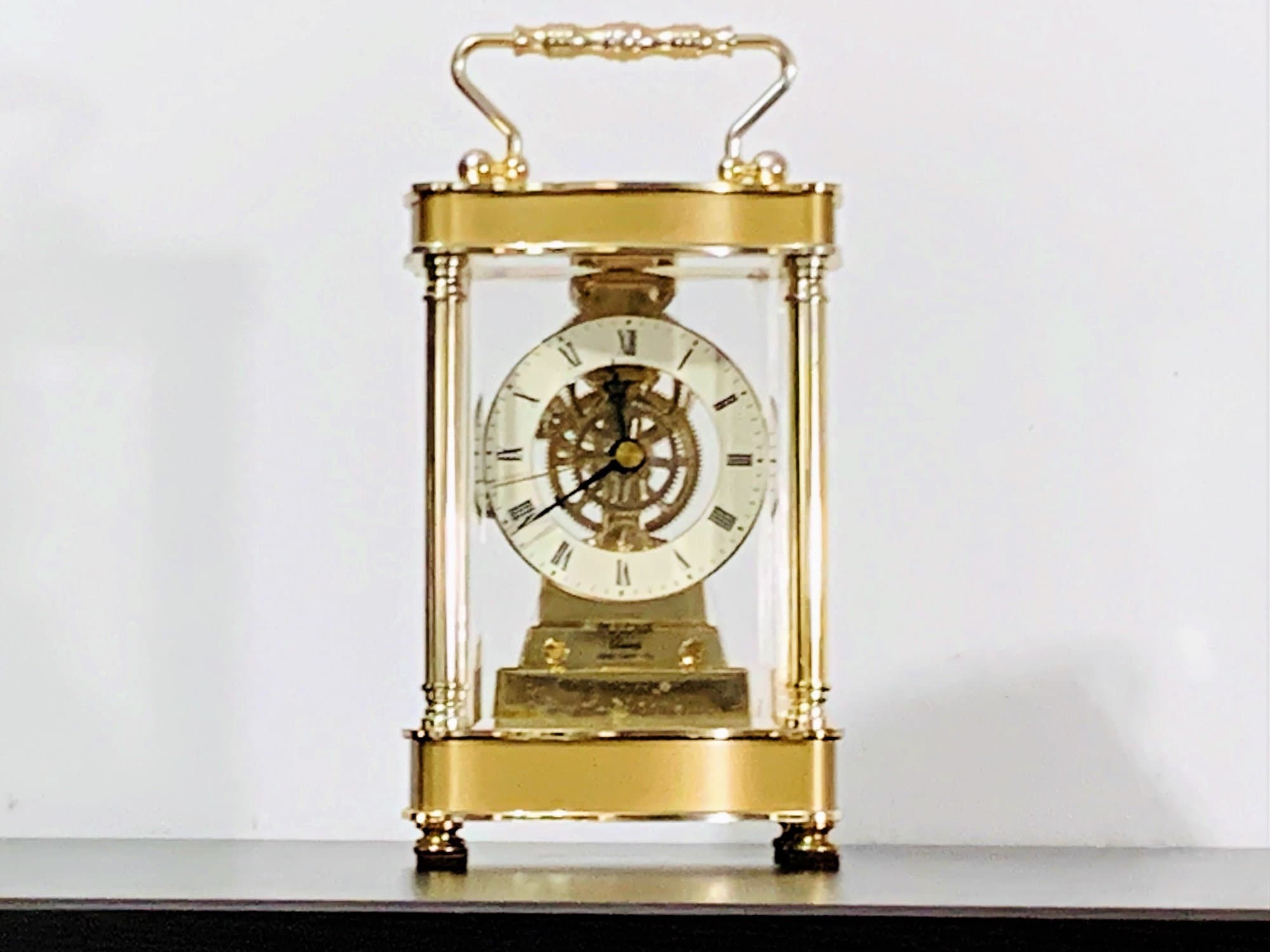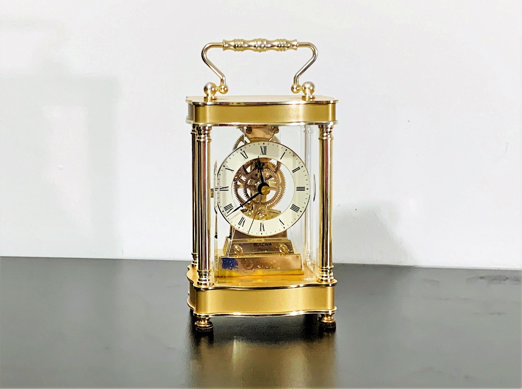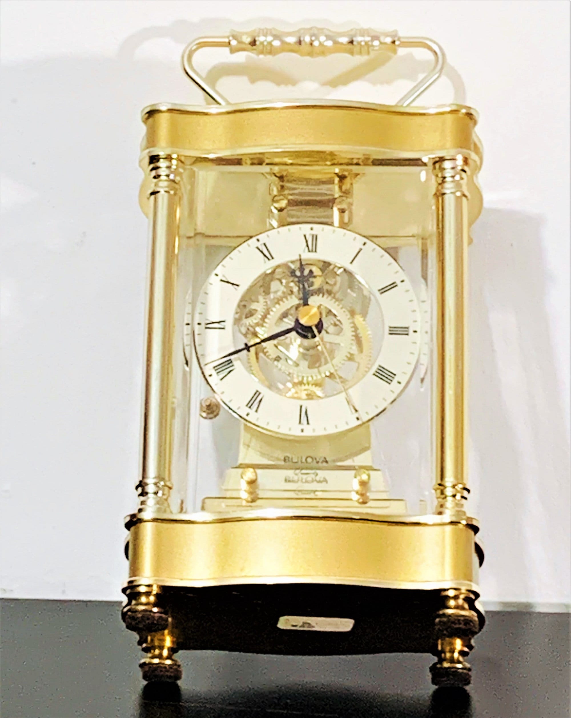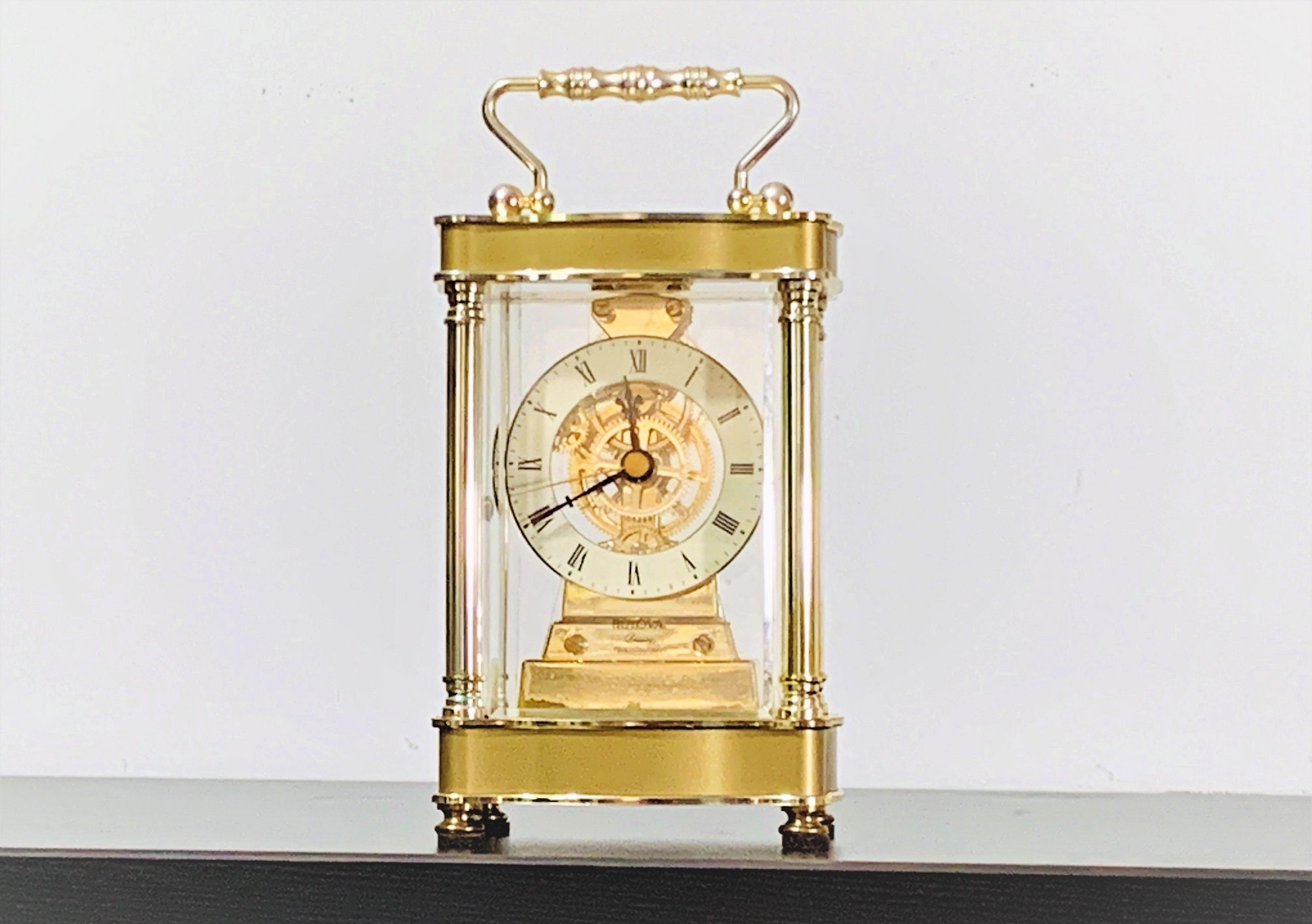 BULOVA WEST GERMANY QUARTZ CARRIAGE SKELETON MOVEMENT MANTLE CLOCK.